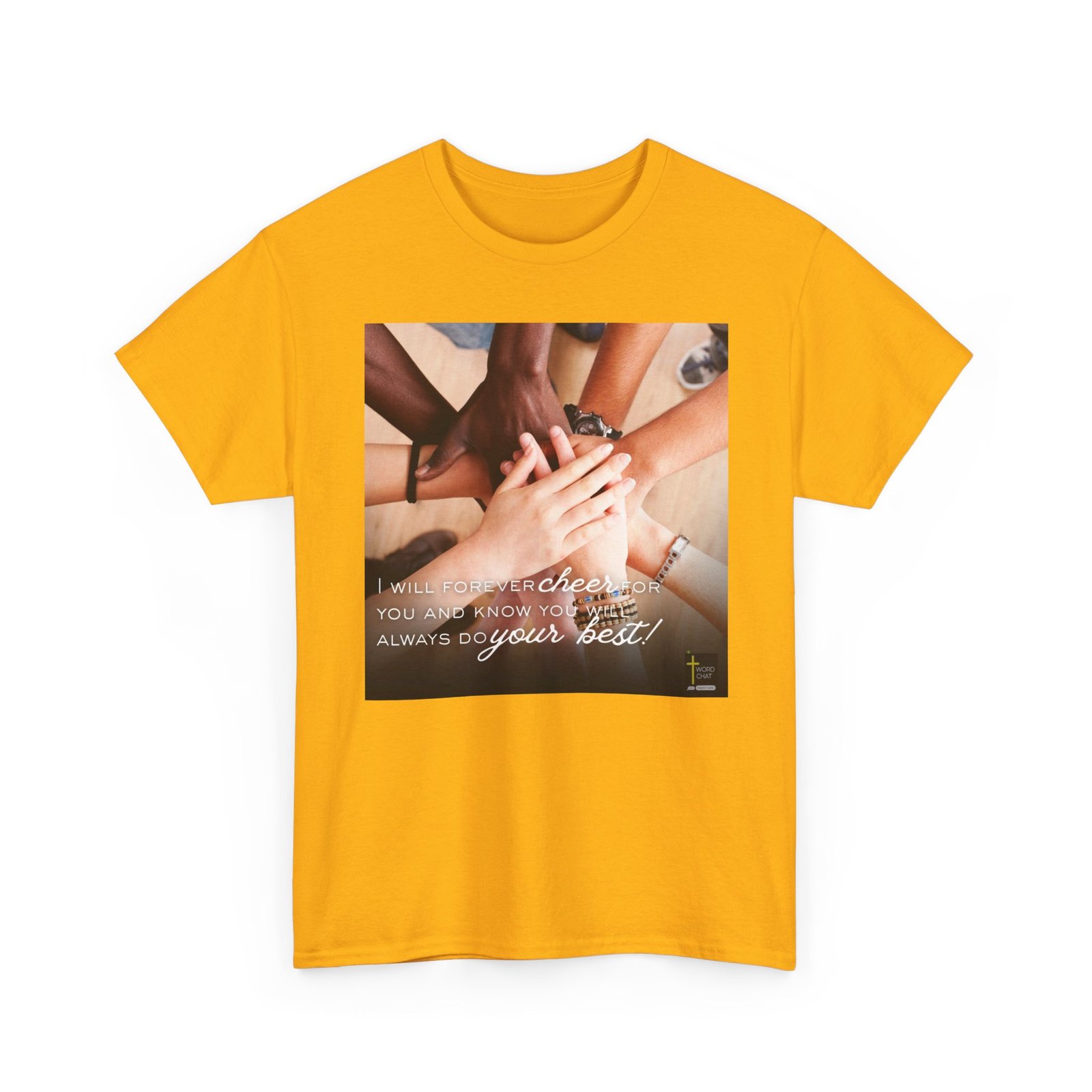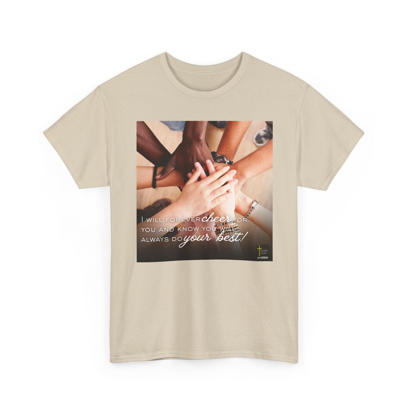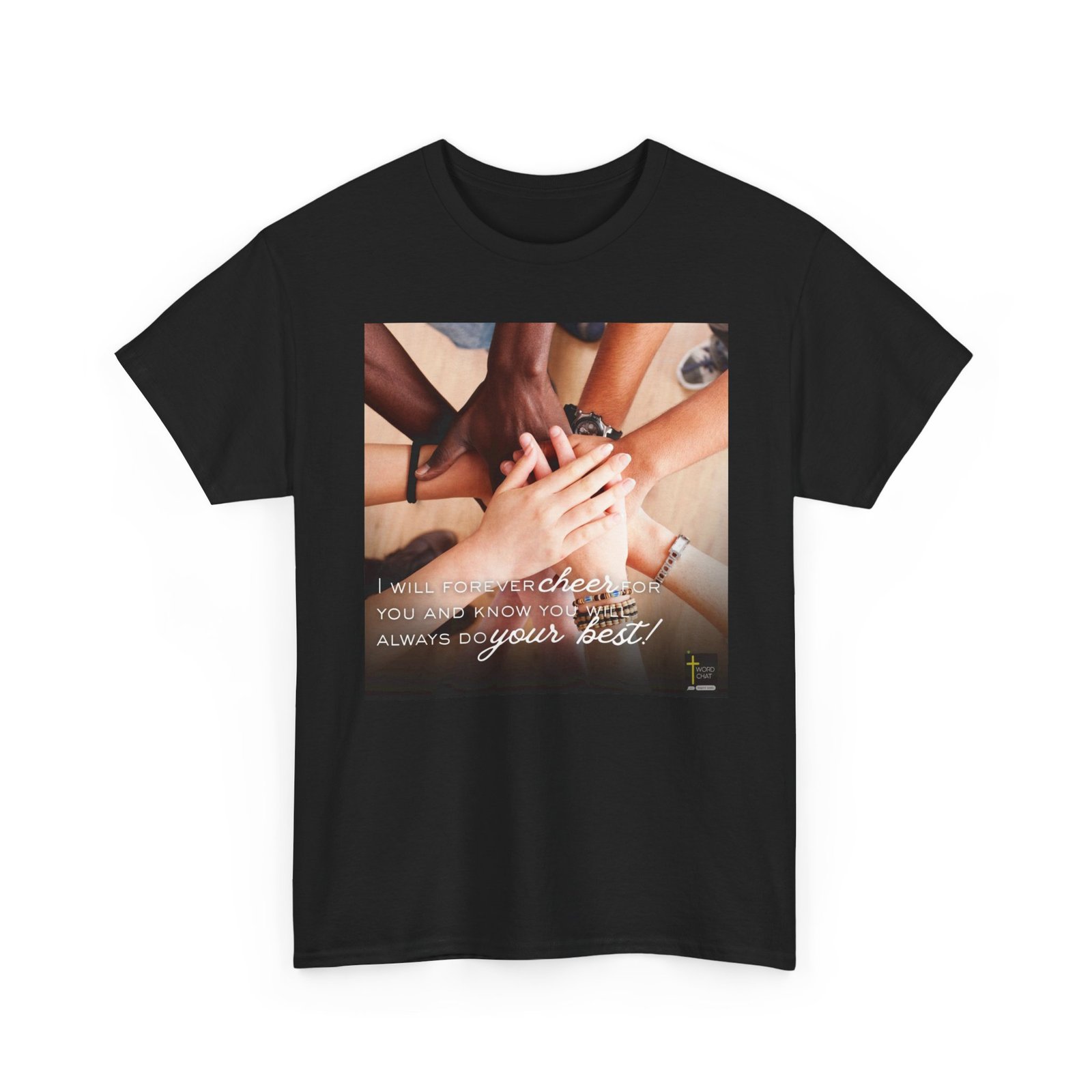 This inspirational image features a diverse group of people stacking their hands together in a unified gesture of solidarity and teamwork against a neutral beige background. The photograph showcases multiple hands of varying skin tones—including darker and lighter complexions—creating a powerful visual representation of diversity, inclusion, and community support. Each person visible in the frame wears accessories such as watches, bracelets, and beaded jewelry, adding personal style to the composition. Overlaid on the image is white motivational text reading “I will forever cheer for you and know you will always do your best,” accompanied by the WordChat logo featuring a cross symbol at the bottom right. The style combines realistic photography with inspirational graphic design, making it ideal for social media, faith-based organizations, community outreach programs, and motivational content focused on encouragement and unity.