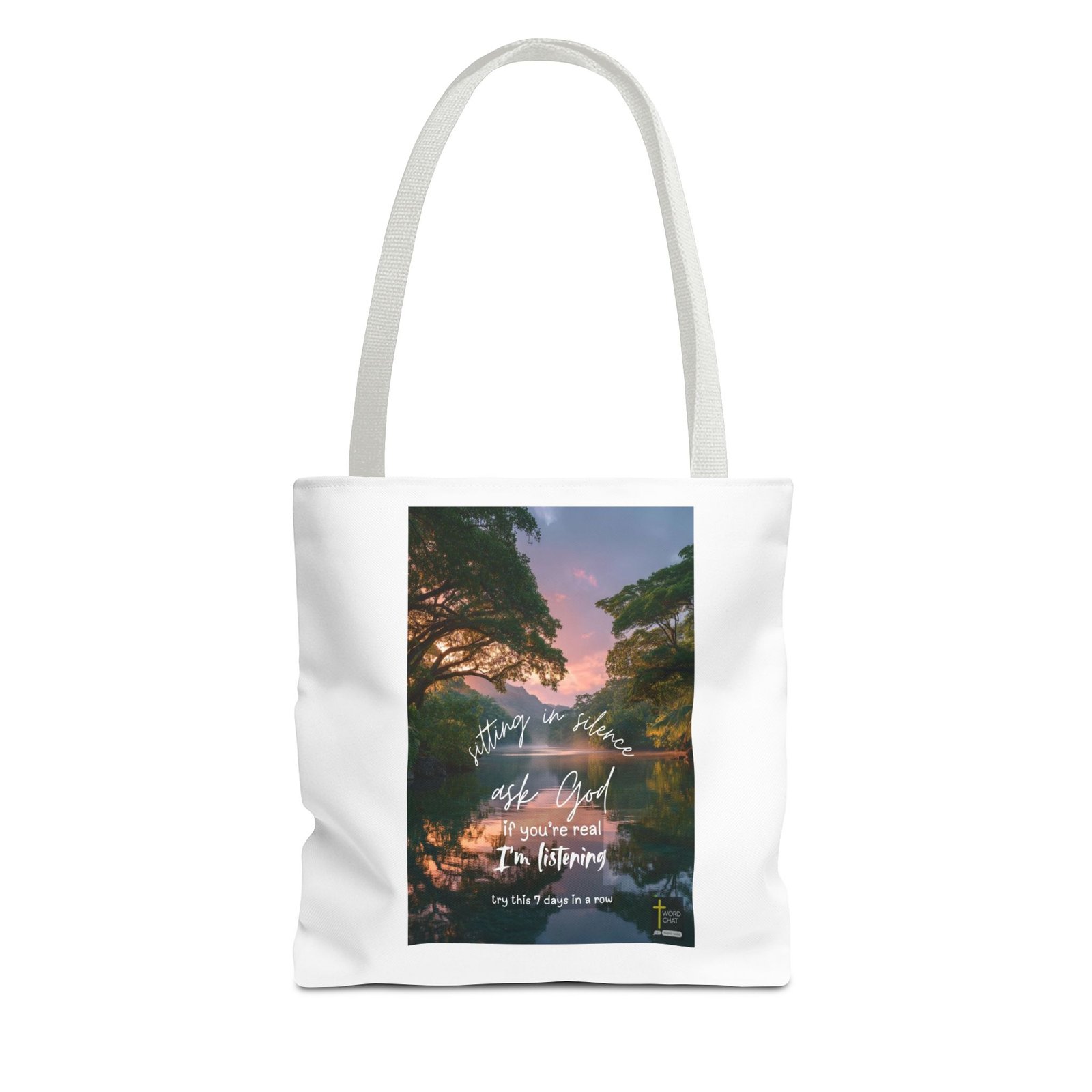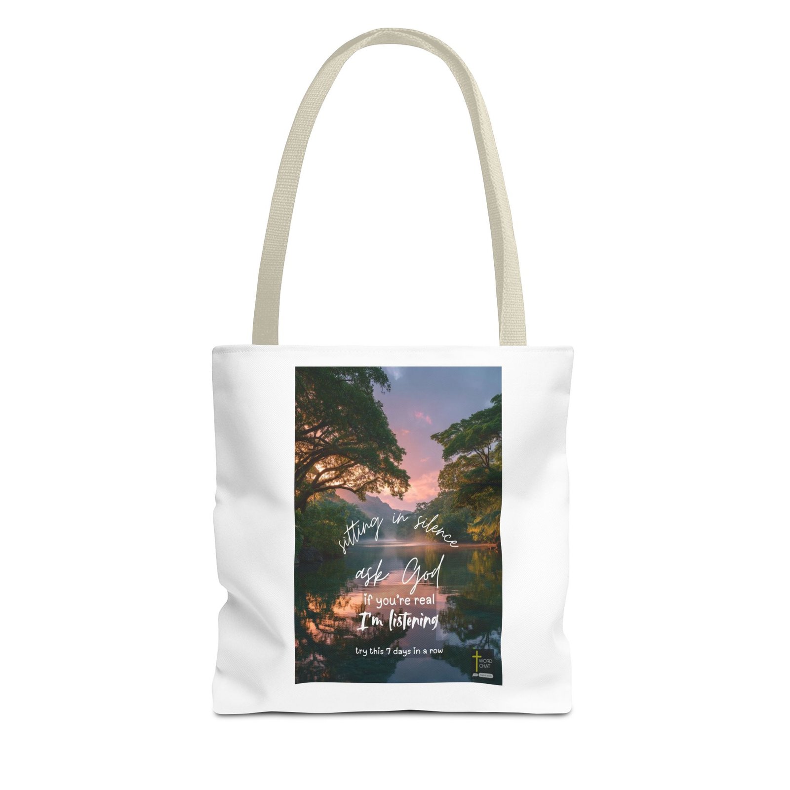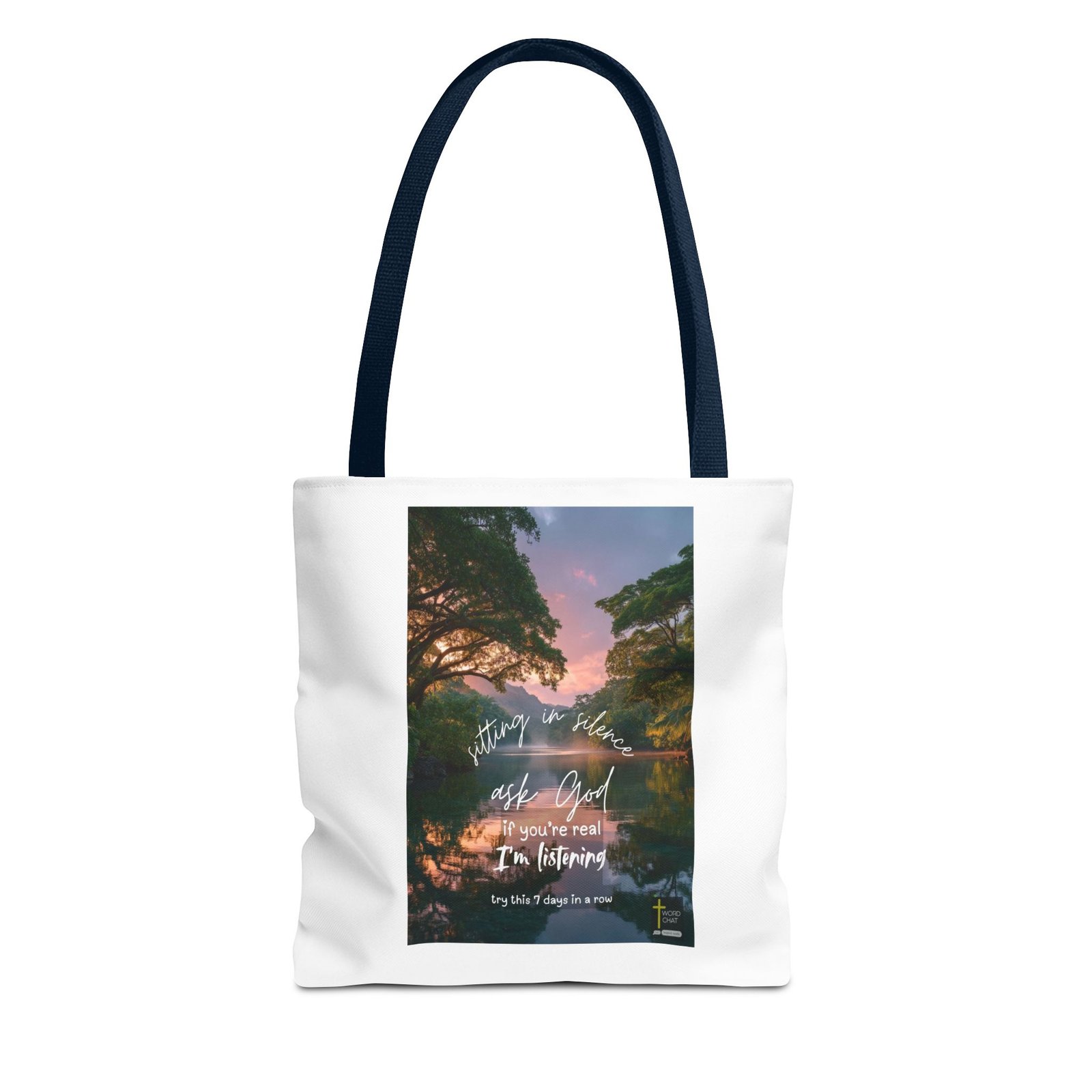 This inspirational image features a tranquil river landscape at sunset, framed by majestic trees with lush green foliage on both sides and distant mountains creating a peaceful backdrop. Overlaid on the scenic natural setting is white handwritten-style text that reads “sitting in silence ask God if you’re real I’m listening” along with a call-to-action stating “try this 7 days in a row.” The photograph captures golden and pink hues reflecting off the calm water, enhanced by dramatic clouds in the sky that create a spiritually uplifting atmosphere. The composition combines nature photography with motivational religious messaging, designed to encourage daily spiritual practice and meditation. A “WordChat” logo with a cross symbol appears in the bottom right corner, indicating this is Christian-based inspirational content meant for sharing.