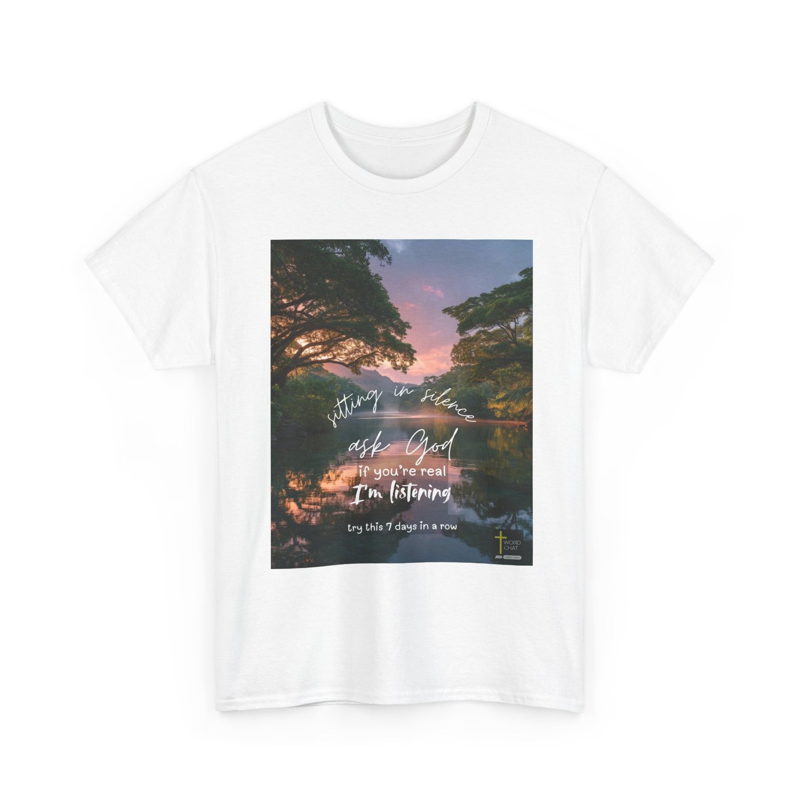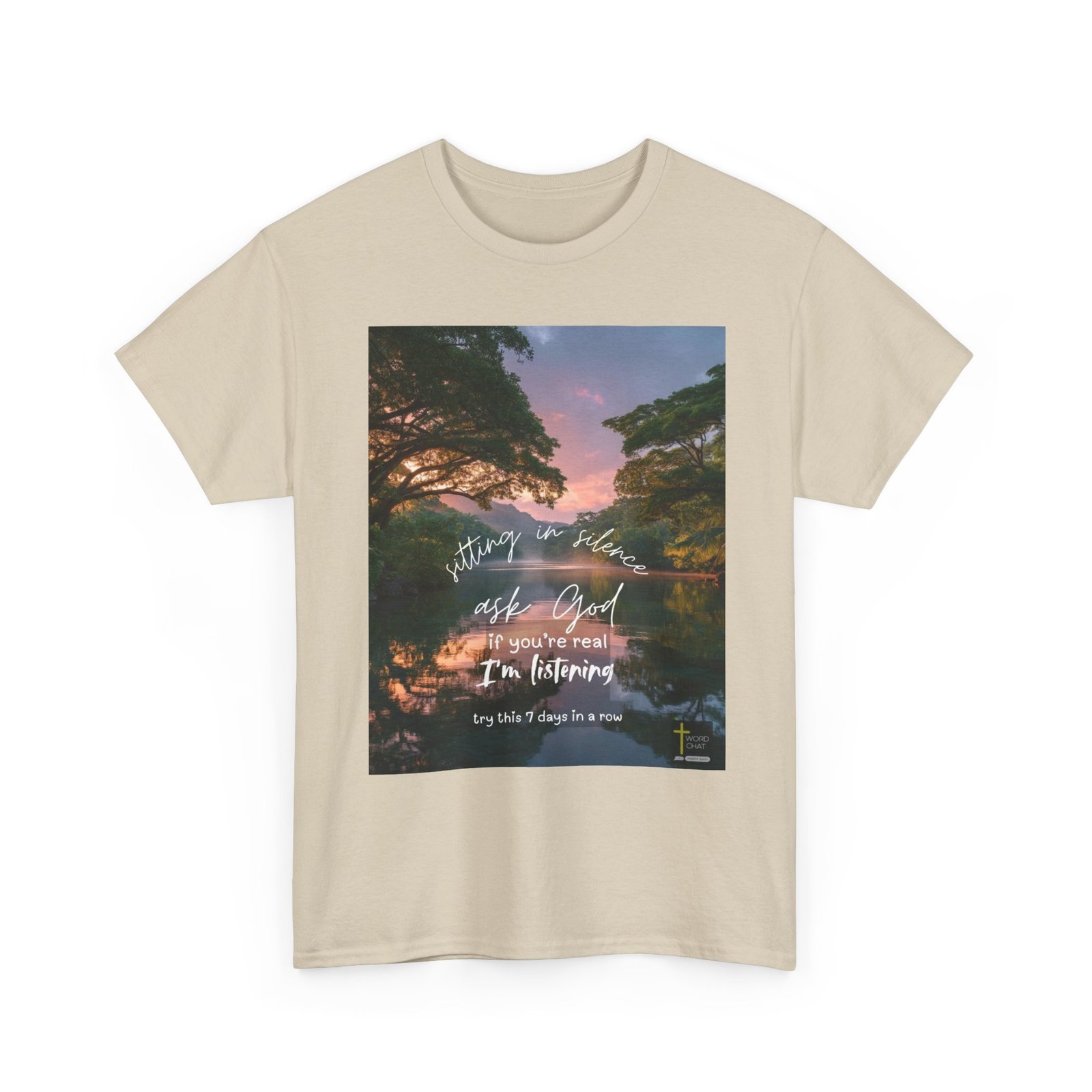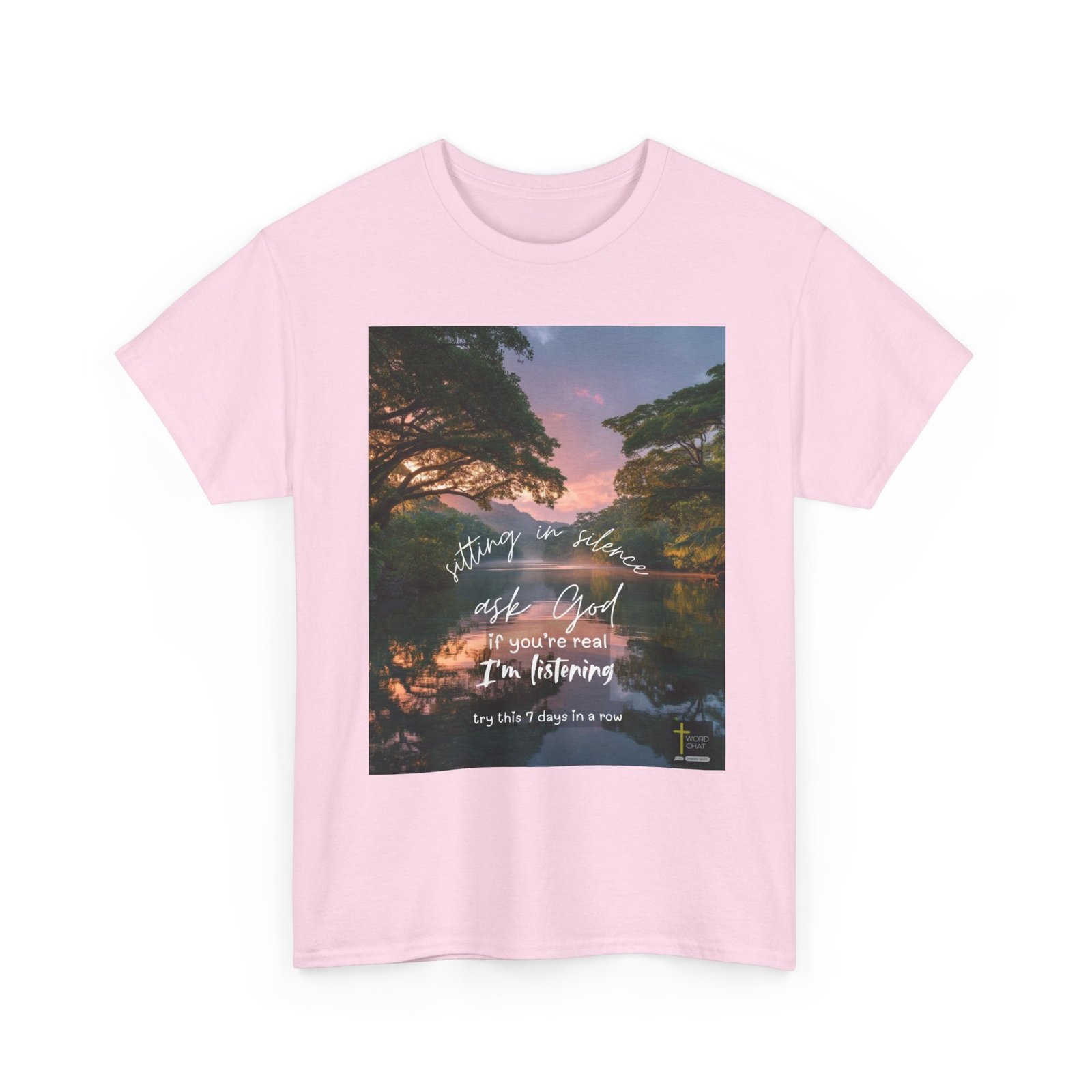 This inspirational image features a tranquil landscape scene with a peaceful river framed by lush green trees at golden hour, creating a calming natural backdrop for spiritual reflection. The composition displays elegant white script text overlaid on the scenic view, reading “sitting in silence ask God if you’re real I’m listening” with a call-to-action at the bottom stating “try this 7 days in a row.” The photograph showcases a stunning sunset or sunrise with pink and golden hues reflecting across the calm water, mountains visible in the distant background, and majestic trees with spreading branches creating a canopy effect. The image style combines nature photography with typography design, perfect for faith-based social media content and motivational messaging. A “WordChat” logo with a cross symbol appears in the bottom right corner, indicating this is inspirational content designed for spiritual encouragement and personal prayer practice.