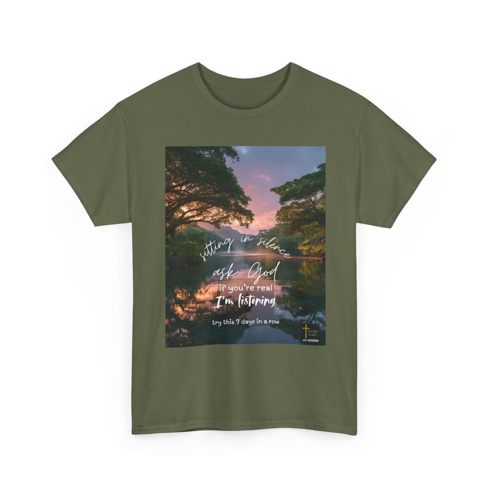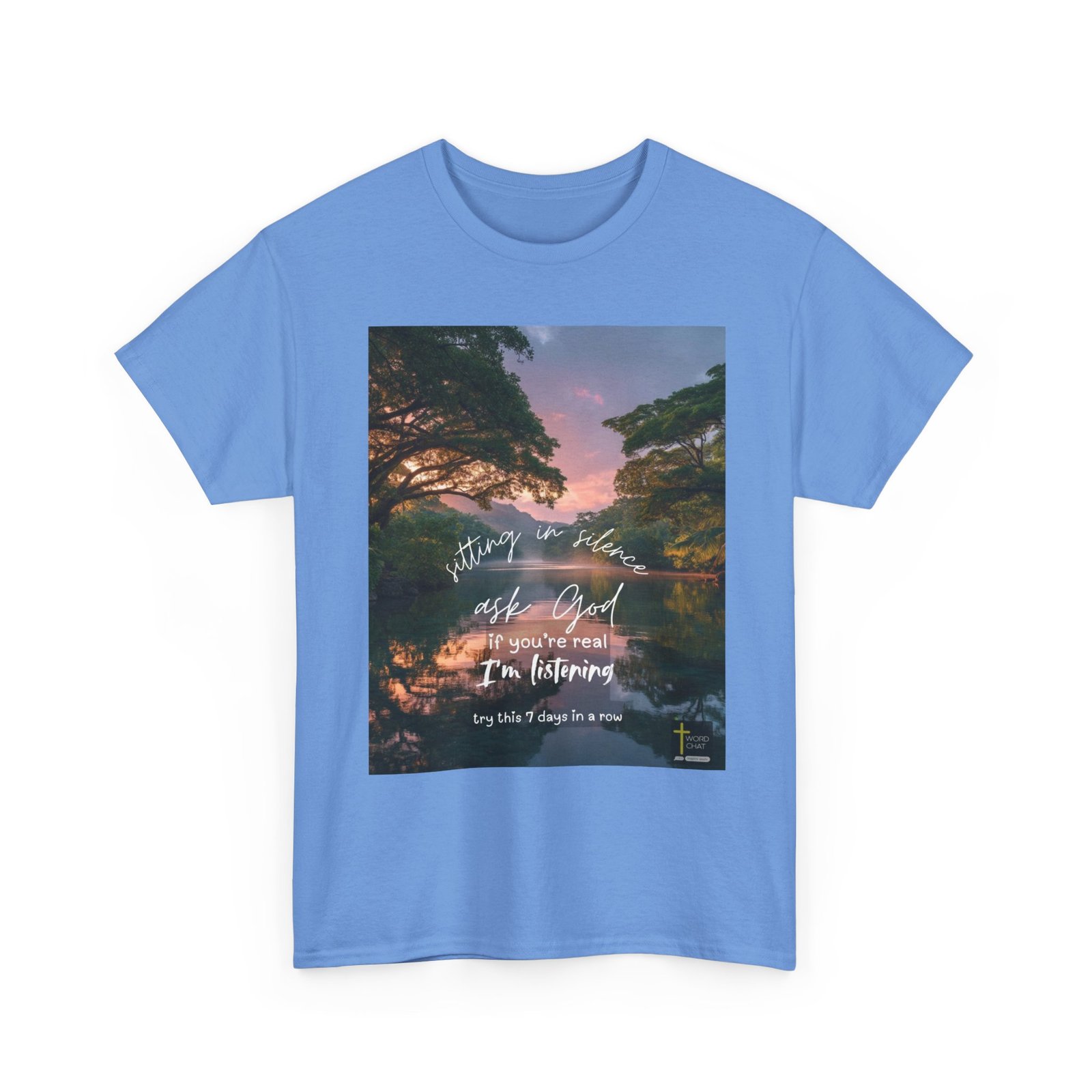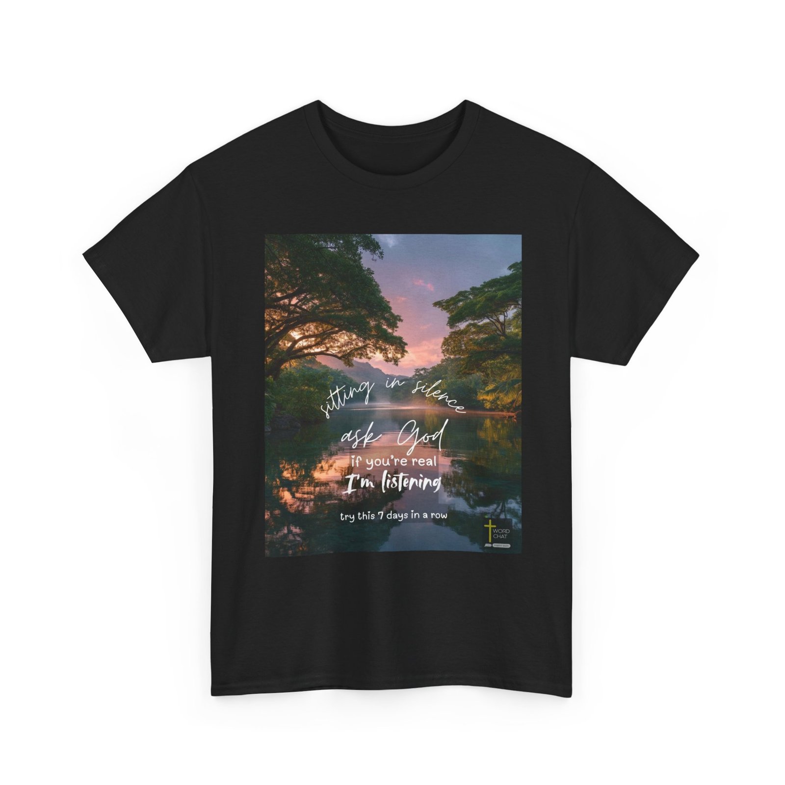 This inspirational image features a tranquil landscape scene with a peaceful river framed by lush green trees at golden hour, creating a calming natural backdrop for spiritual reflection. The composition displays elegant white script text overlaid on the scenic view, reading “sitting in silence ask God if you’re real I’m listening” with a call-to-action at the bottom stating “try this 7 days in a row.” The photograph showcases a stunning sunset or sunrise with pink and golden hues reflecting across the calm water, mountains visible in the distant background, and majestic trees with spreading branches creating a canopy effect. The image style combines nature photography with typography design, perfect for faith-based social media content and motivational messaging. A “WordChat” logo with a cross symbol appears in the bottom right corner, indicating this is inspirational content designed for spiritual encouragement and personal prayer practice.