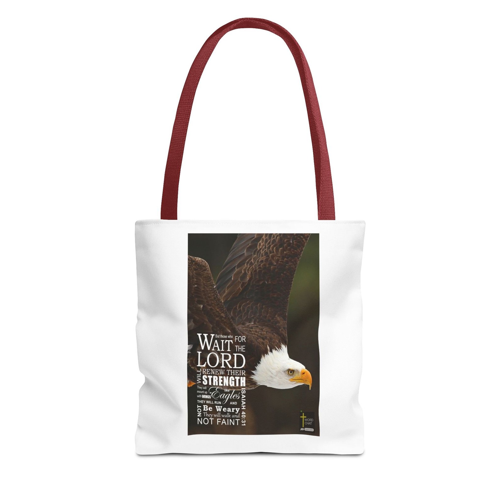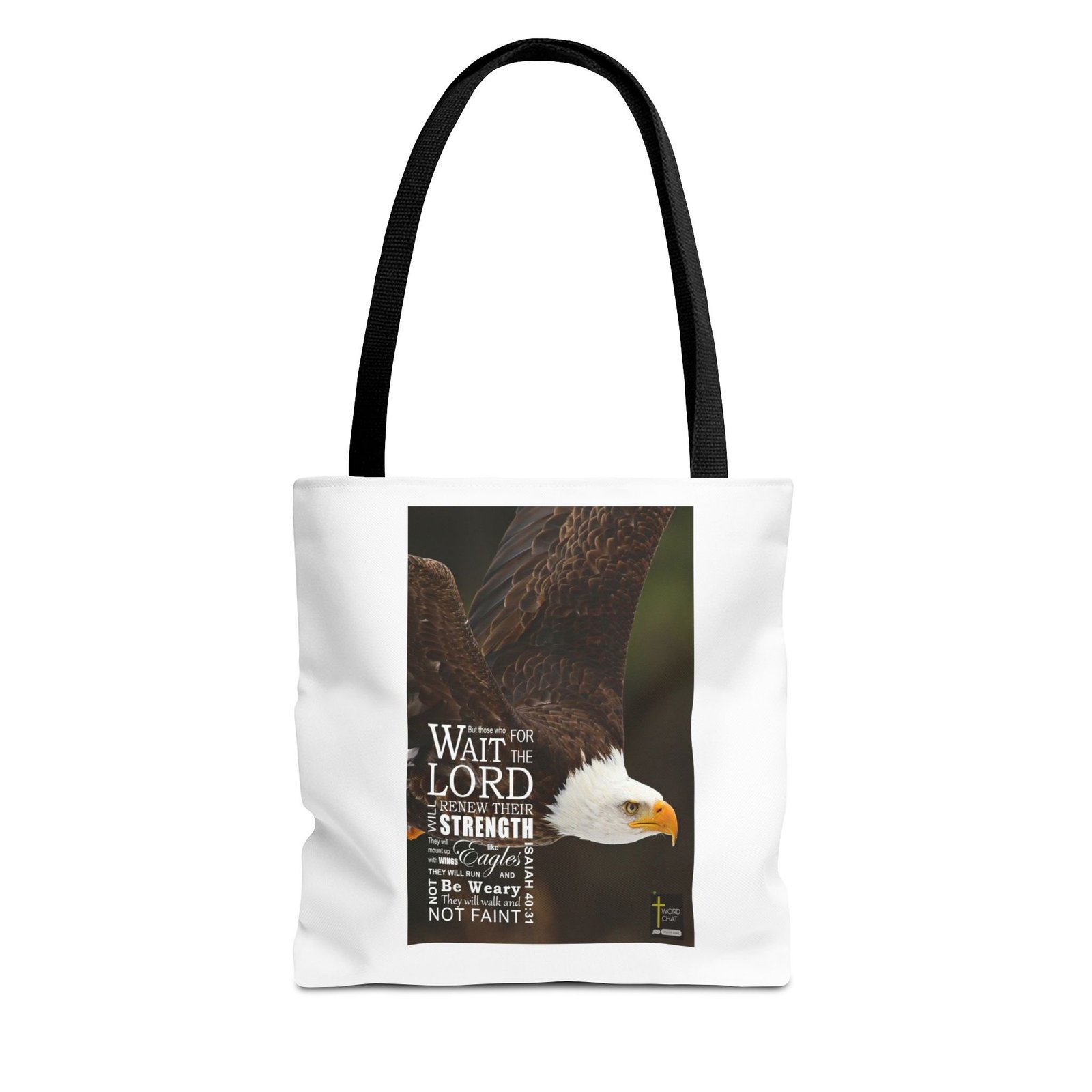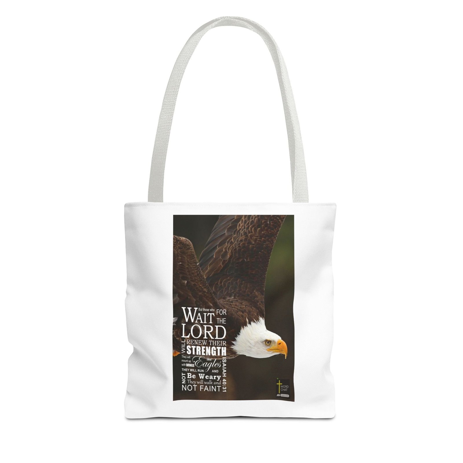 This inspirational image features a majestic bald eagle with its wings partially spread, showcasing the intricate brown feather patterns and distinctive white head. The photograph is a close-up shot with a blurred green background, focusing on the bird’s powerful and detailed profile. Overlaid on the image is a biblical quote from Isaiah 40:31, written in white text that reads “But those who wait for the LORD will renew their strength. They will mount up with wings like Eagles, they will run and not be weary, they will walk and not faint.” The text is artfully arranged to complement the eagle’s pose, with the bird’s eye and beak prominently displayed on the right side of the image. In the bottom right corner, there is a small “Word Chat” logo, indicating this is likely a religious or motivational graphic design.