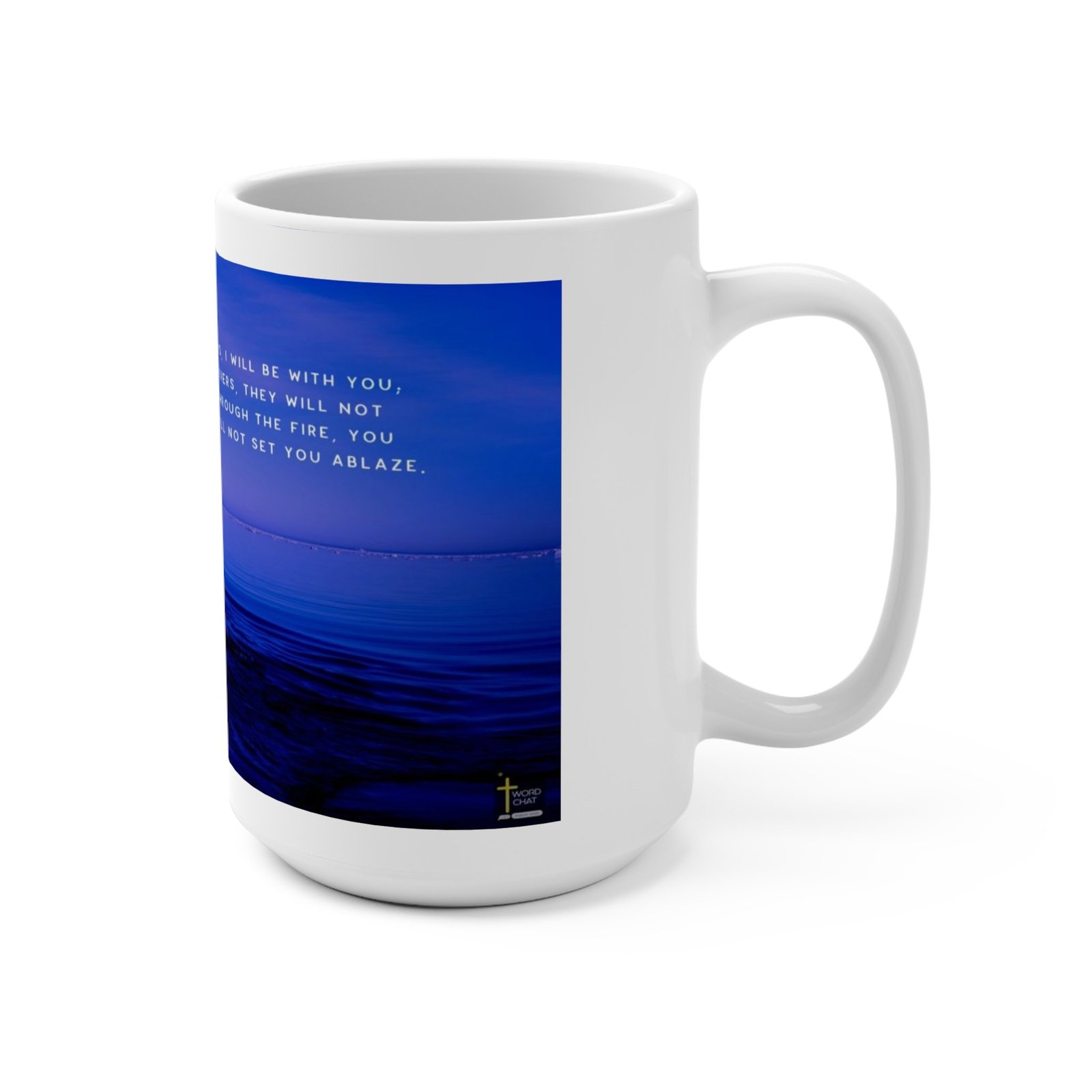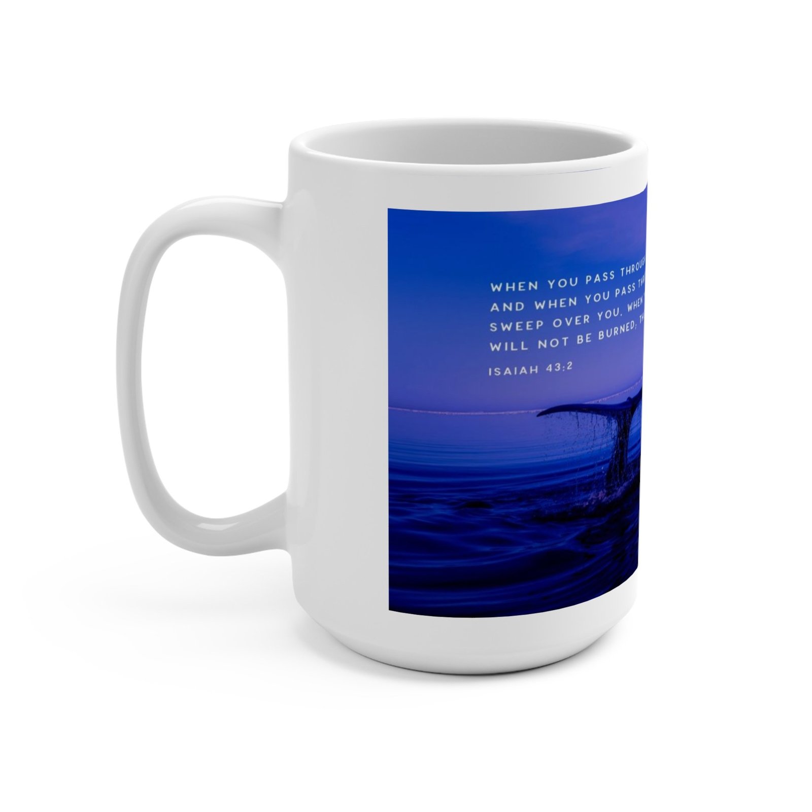 This serene maritime image features a whale’s tail emerging dramatically from deep blue waters, silhouetted against a tranquil azure background. The biblical verse from Isaiah 43:2 is overlaid in white text, providing a spiritual context of divine protection and guidance through challenging times. Water droplets cascade from the whale’s tail, creating a dynamic and powerful visual representation of strength and resilience. The image’s color palette is predominantly blue, ranging from deep navy to lighter sky blue, which creates a sense of depth and calm. The photographic style appears to be high-quality and contemplative, with the whale’s tail serving as a metaphorical symbol of endurance and hope.