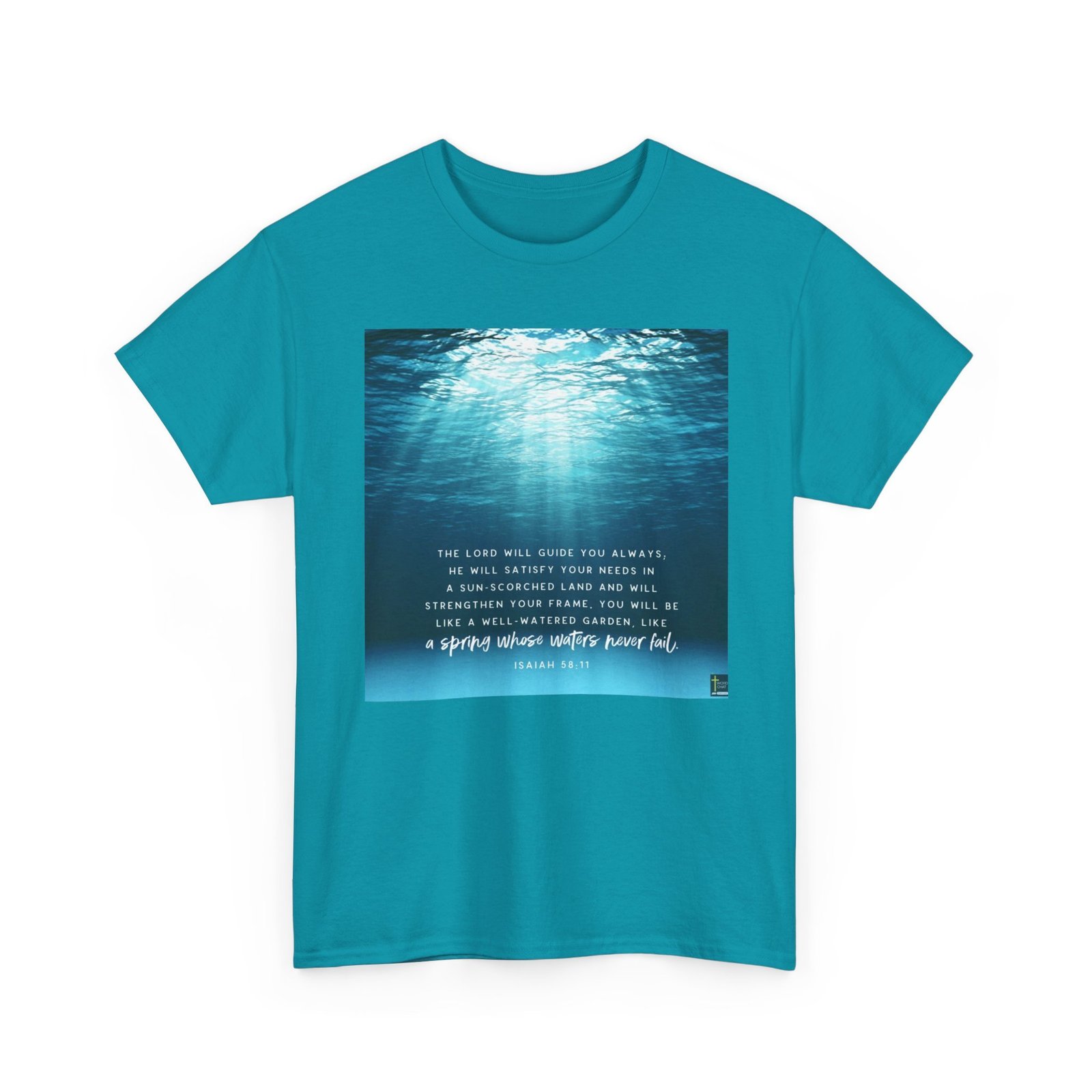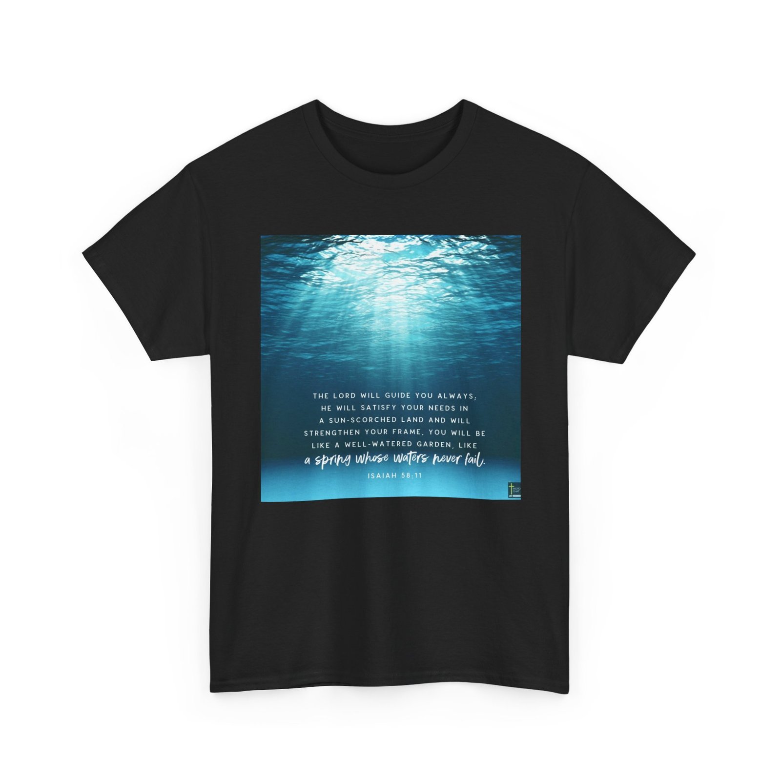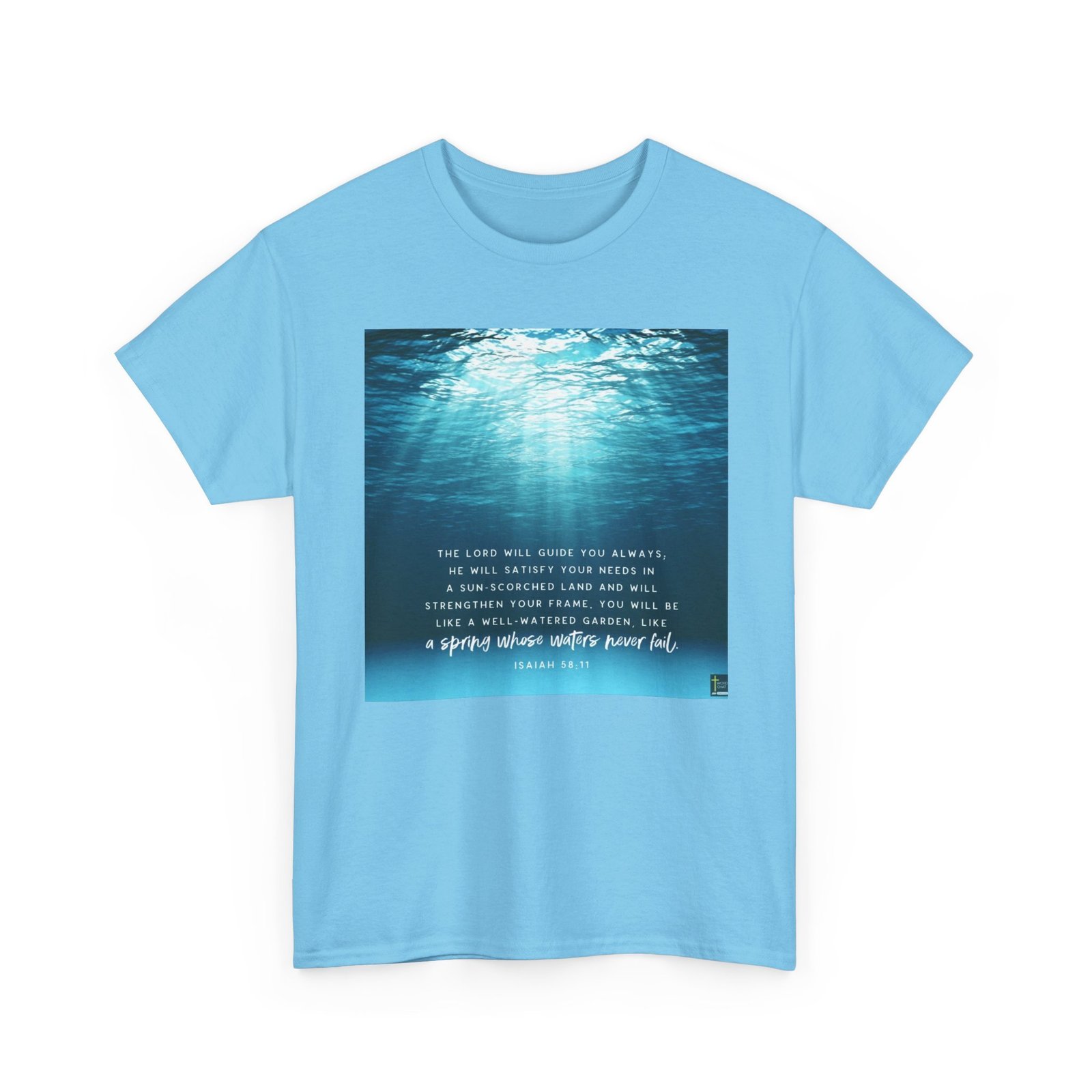 This serene and inspirational image features an underwater scene with soft, blue-tinted light rays penetrating through water, creating a tranquil and ethereal atmosphere. The background showcases various shades of blue, ranging from deep navy to lighter turquoise, with rippling water textures that suggest depth and movement. Overlaid on this peaceful underwater backdrop is a biblical quote from Isaiah 58:11, printed in white and light blue text, which speaks of divine guidance and spiritual nourishment. The text promises that the Lord will guide, satisfy needs, and strengthen, using metaphorical imagery of a well-watered garden and a spring with never-failing waters. The image is designed in a minimalist, contemplative style that combines natural imagery with spiritual messaging, likely intended for religious or motivational purposes.