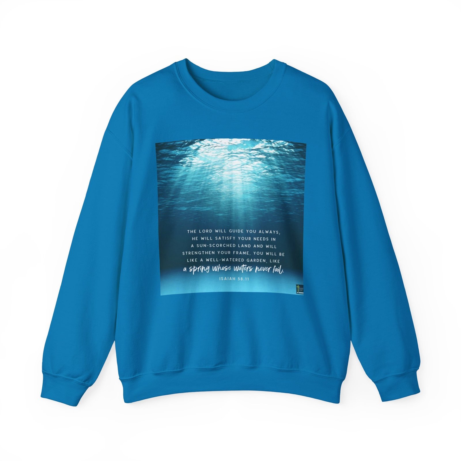 This serene and inspirational image features an underwater scene with soft, blue-tinted light rays penetrating through water, creating a tranquil and ethereal atmosphere. The background showcases various shades of blue, ranging from deep navy to lighter turquoise, with rippling water textures that suggest depth and movement. Overlaid on this peaceful underwater backdrop is a biblical quote from Isaiah 58:11, printed in white and light blue text, which speaks of divine guidance and spiritual nourishment. The text promises that the Lord will guide, satisfy needs, and strengthen, using metaphorical imagery of a well-watered garden and a spring with never-failing waters. The image is designed in a minimalist, contemplative style that combines natural imagery with spiritual messaging, likely intended for religious or motivational purposes.