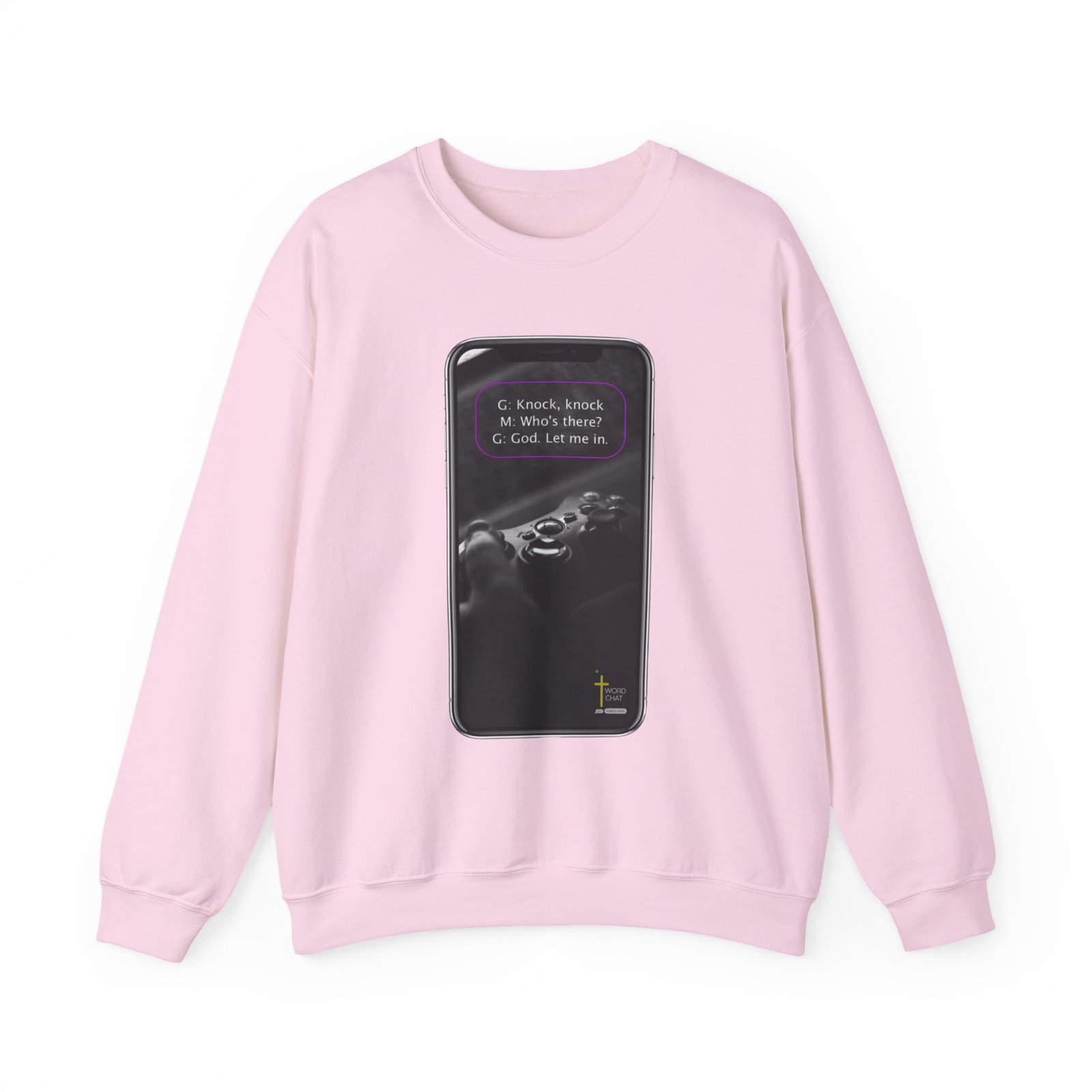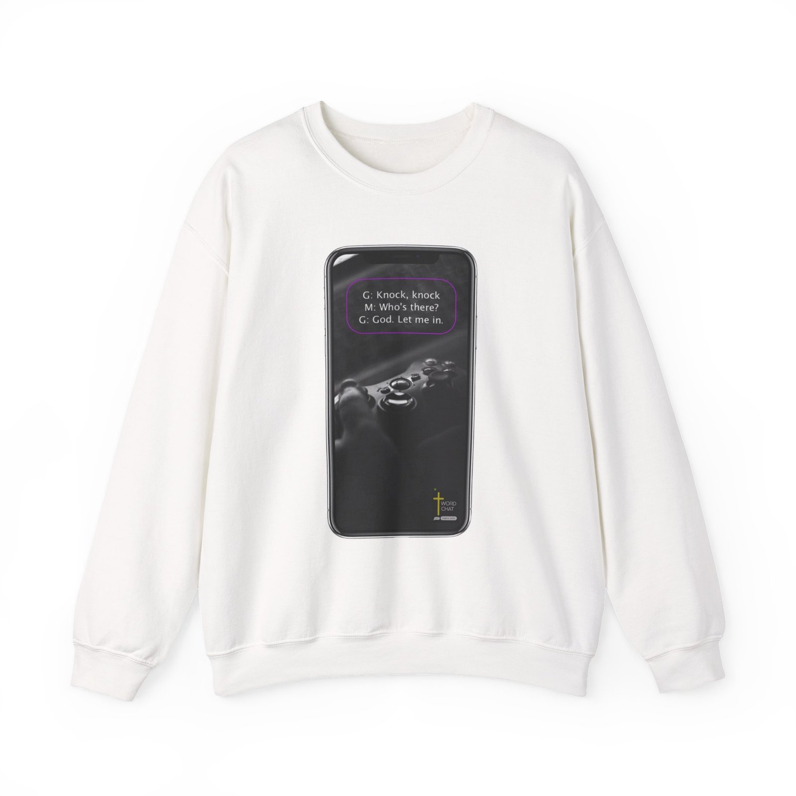 This image displays a smartphone screen featuring a humorous knock-knock joke with a religious twist. The joke text reads “G: Knock, knock / M: Who’s there? / G: God. Let me in.” presented in a text box at the top of the screen. Below the text, a gaming controller is prominently shown, suggesting the meme combines gaming culture with comedic content. The image has a monochromatic aesthetic with neon accents framing the borders of the device. At the bottom of the screen, a WordChat logo with the tagline “inspire souls” is visible.