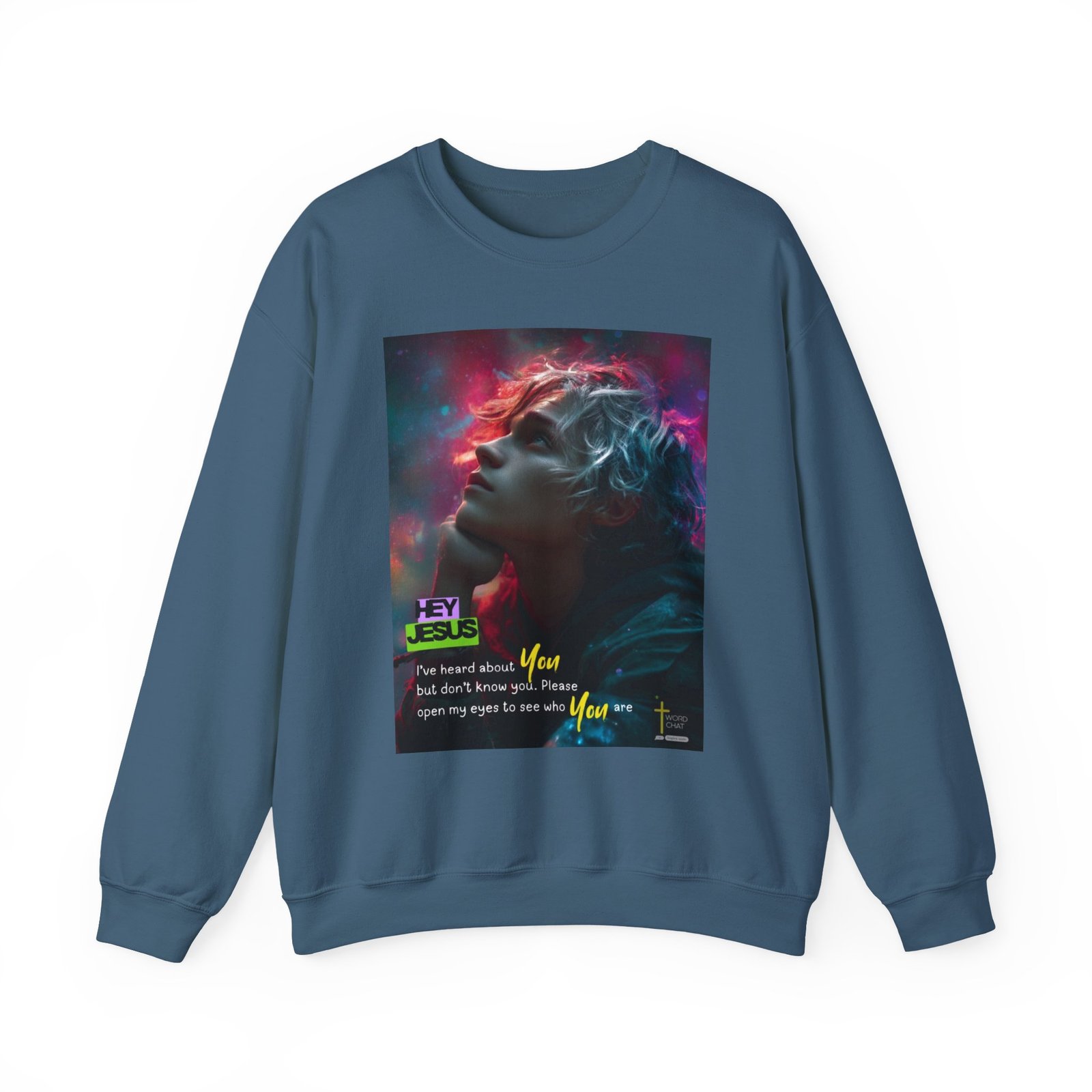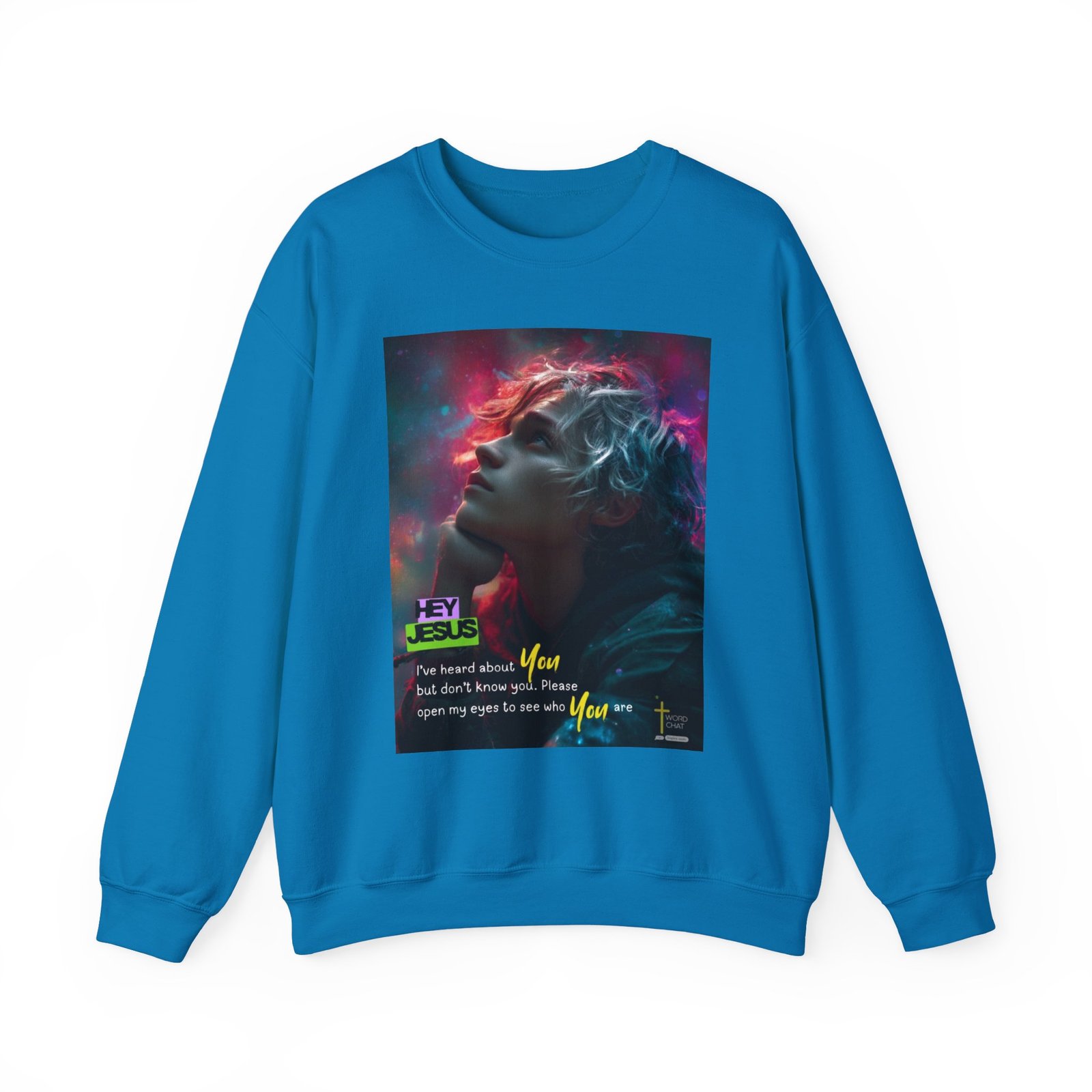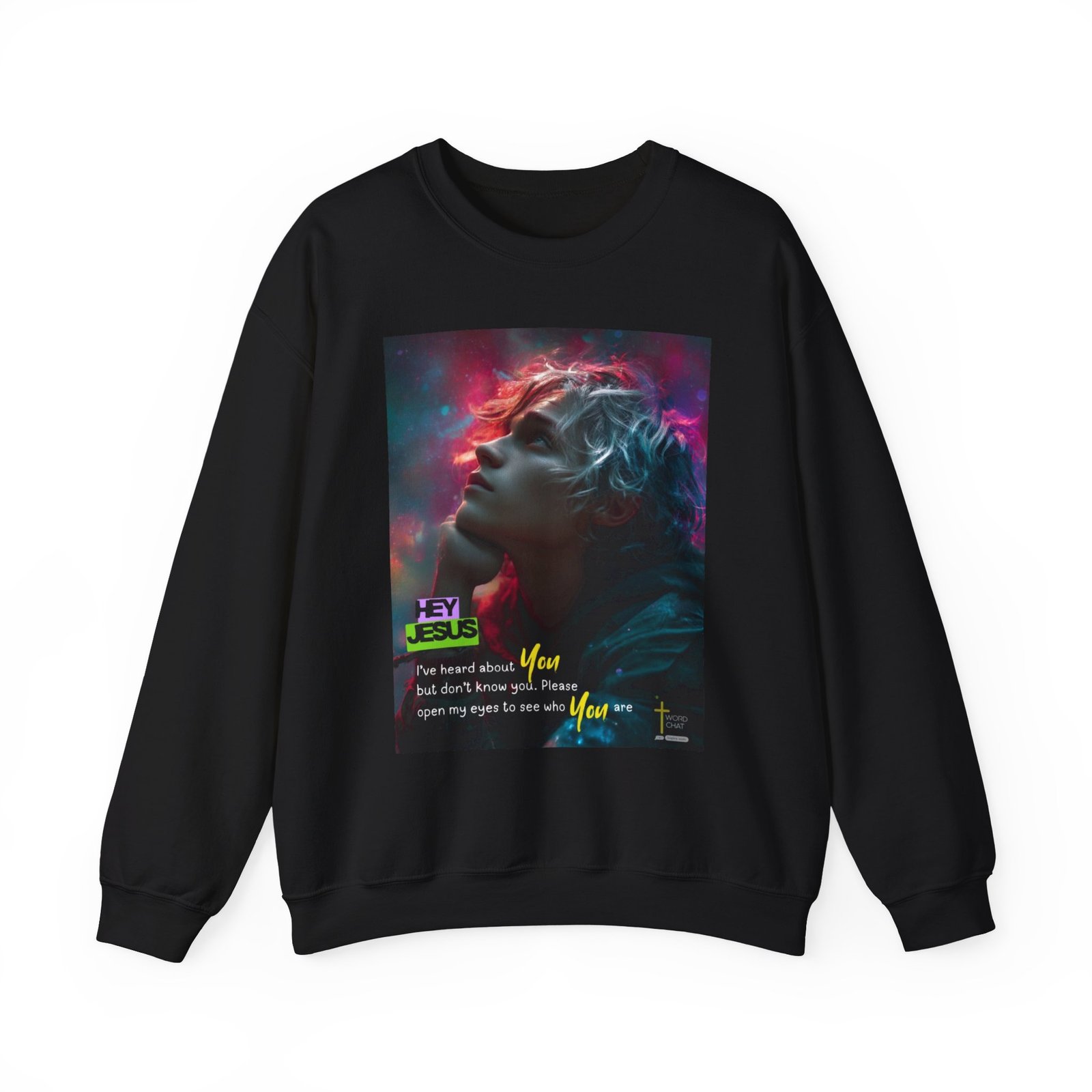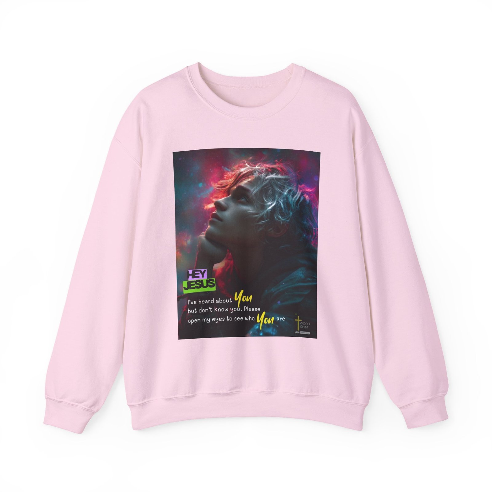 This visually striking digital artwork features a contemplative figure with flowing, ethereal hair illuminated by vibrant neon colors—hot pink, magenta, and cyan—against a cosmic background. The image showcases a profile view of a young person gazing upward with an introspective expression, surrounded by glowing particles and light effects that create a transcendent atmosphere. Bold text overlays deliver an inspirational Christian message reading “HEY JESUS” and “I’ve heard about You but don’t know you. Please open my eyes to see who You are,” emphasizing spiritual awakening and faith exploration. The WordChat logo and ‘inspire souls’ tagline sit in the bottom right corner, showing the brand of this platform for finding and sharing soul stirring messages.