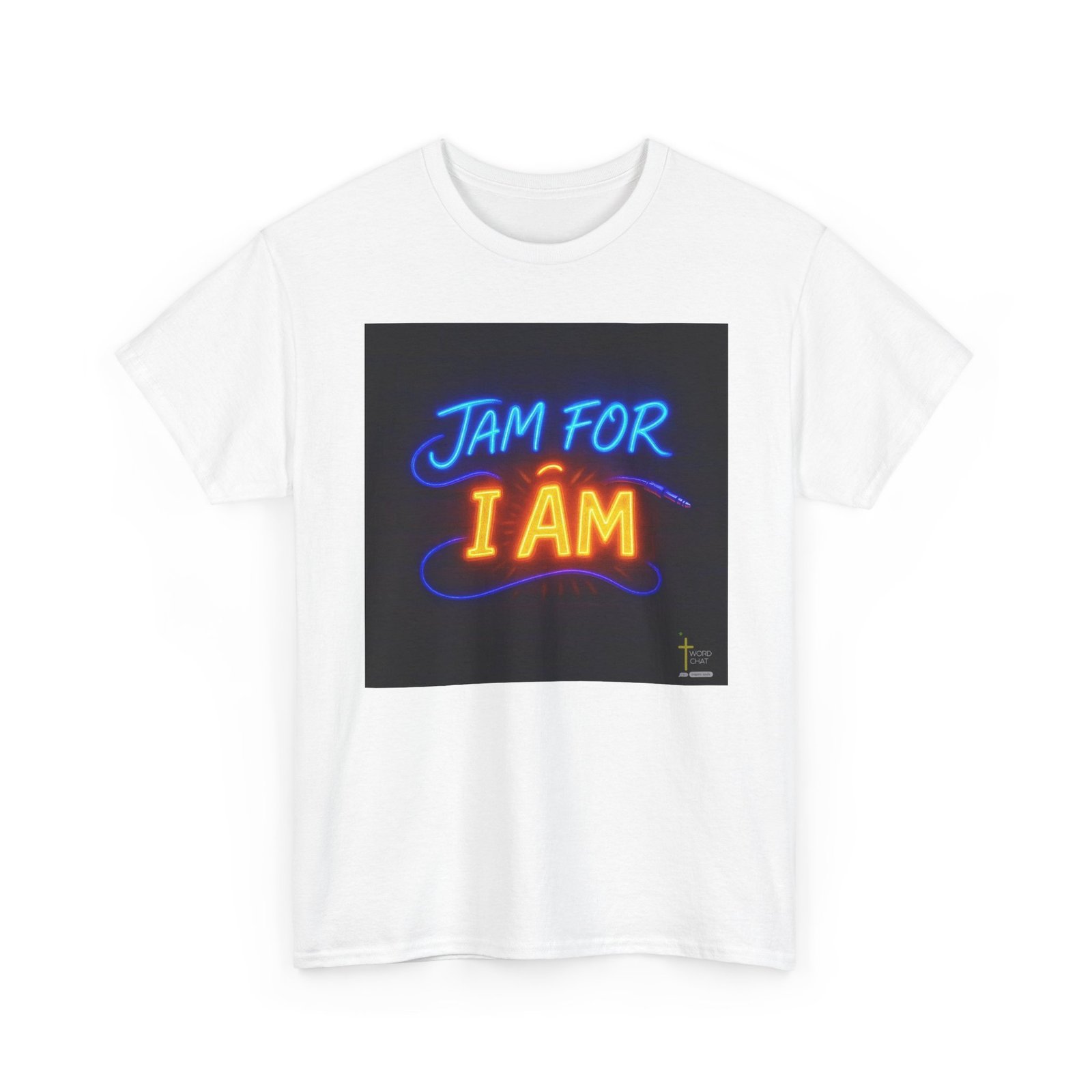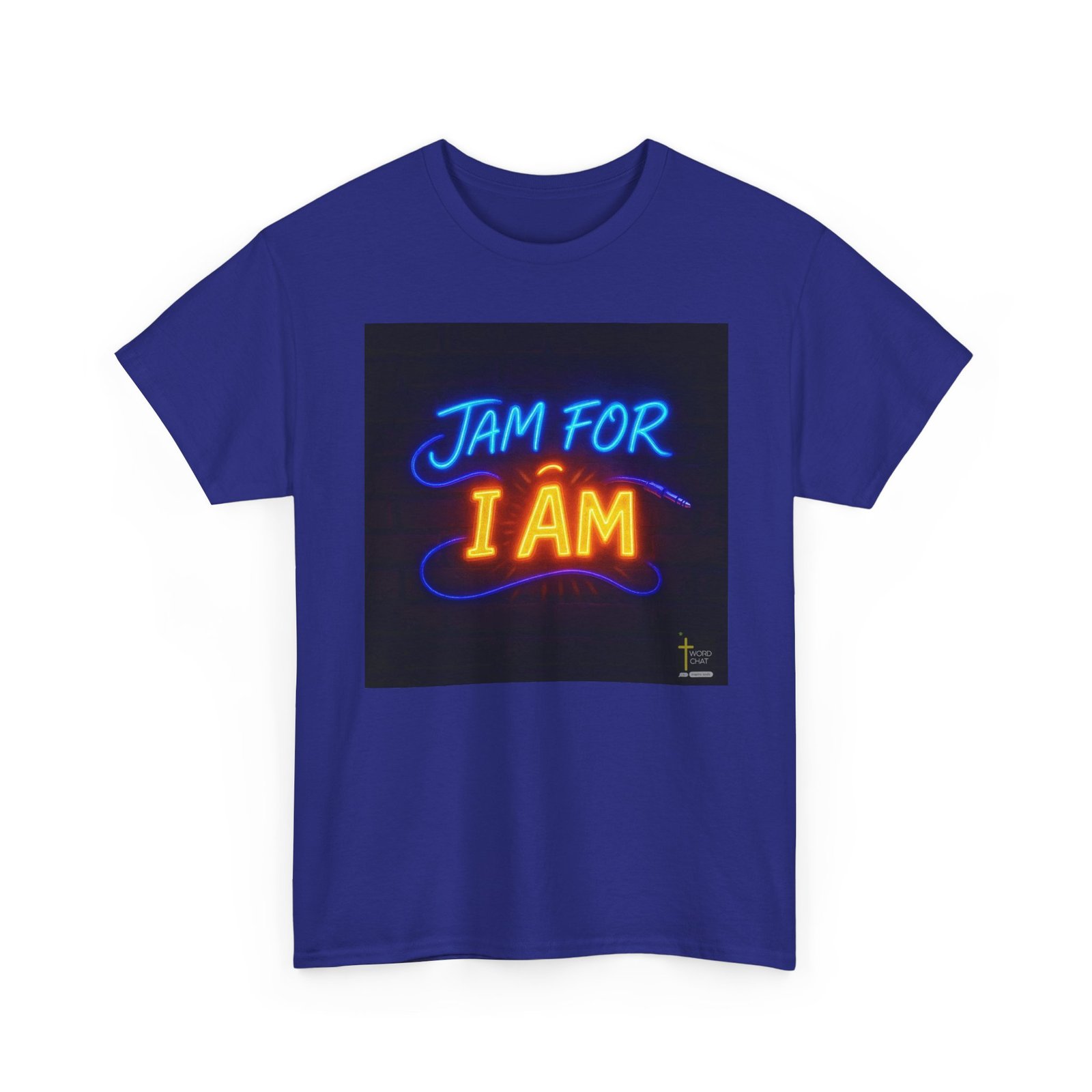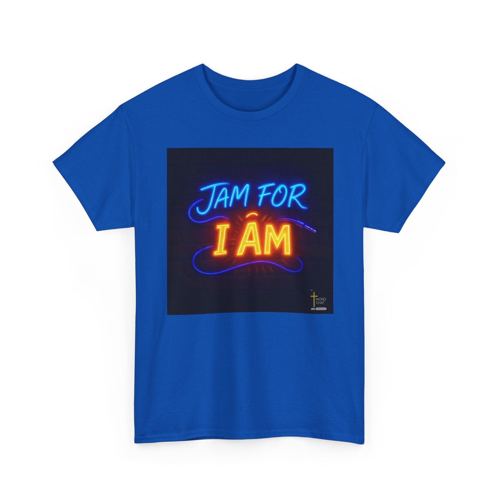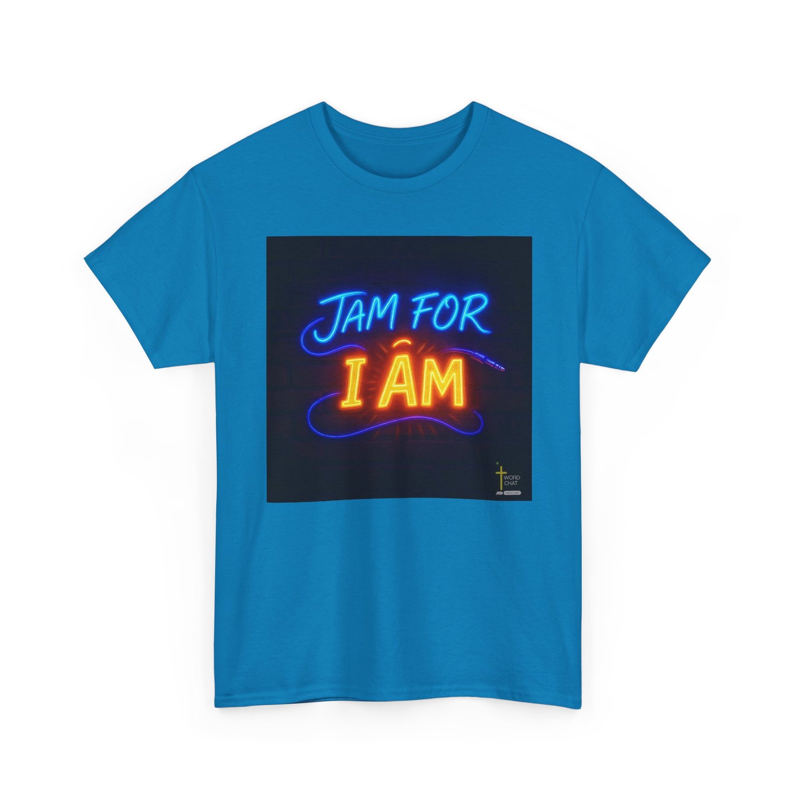 This vibrant neon sign displays “JAM FOR I AM” in a striking two-tone design, featuring cyan blue lettering for the top line and bright golden-yellow text for the bottom line against a dark brick wall background. The neon tubes are outlined with decorative blue curved flourishes that frame the central message, creating an eye-catching vintage aesthetic. The glowing effect is characteristic of classic neon signage, with halos of light radiating from each illuminated tube. The WordChat logo and ‘inspire souls’ tagline sit in the bottom right corner, showing a place find soul stirring messages to share, as well as join a Christian social networking platform. The image exemplifies modern neon art style commonly used for motivational displays and spiritual messaging in contemporary design.
