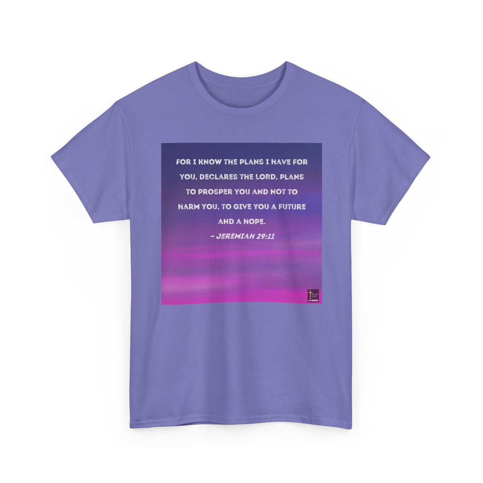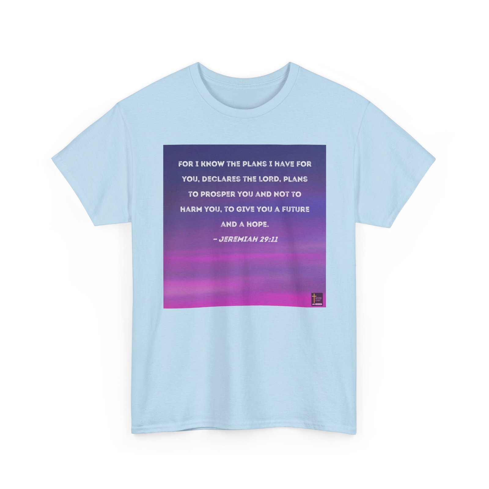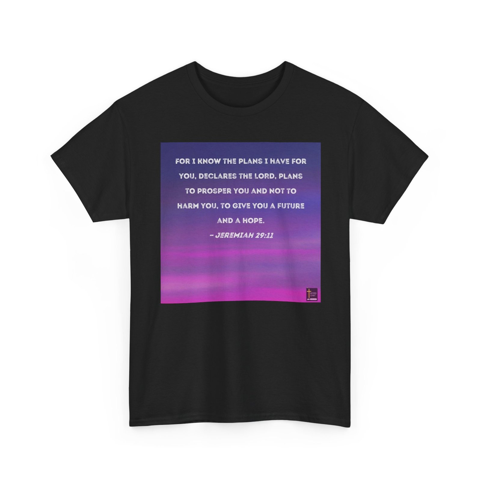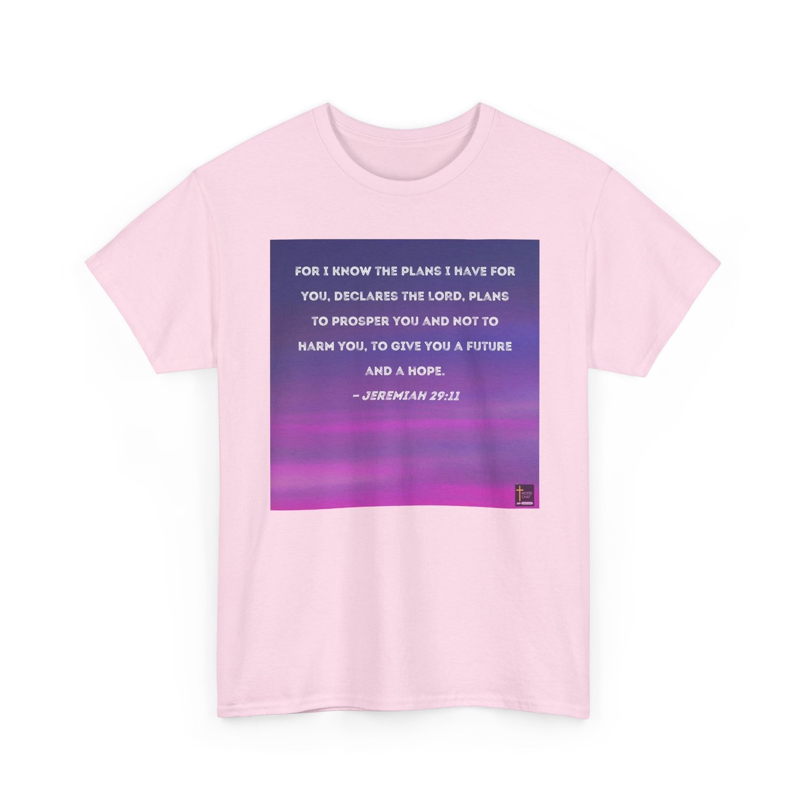 This image features a biblical quote from Jeremiah 29:11, displayed in white, textured lettering against a gradient background that transitions from deep blue to vibrant pink and magenta. The text is centered on the image, with a soft, slightly weathered font that gives the scripture a gentle, approachable feel. The background appears to be a blurred, horizontal gradient that creates a sense of depth and warmth. In the bottom right corner, there is a small logo for “WordChat” with a cross symbol. The color palette and design give the image a serene, inspirational quality that draws attention to the hopeful message of the scripture.