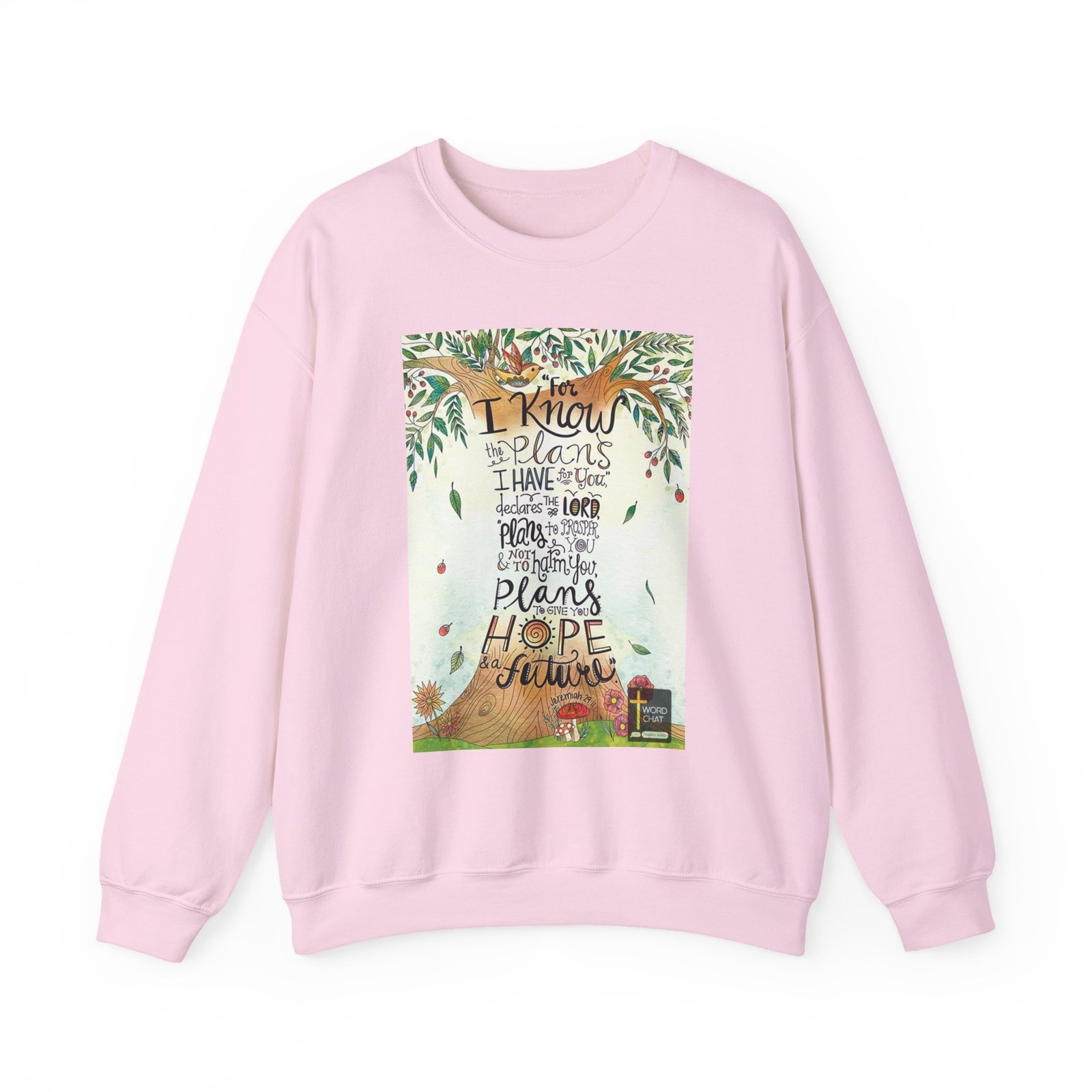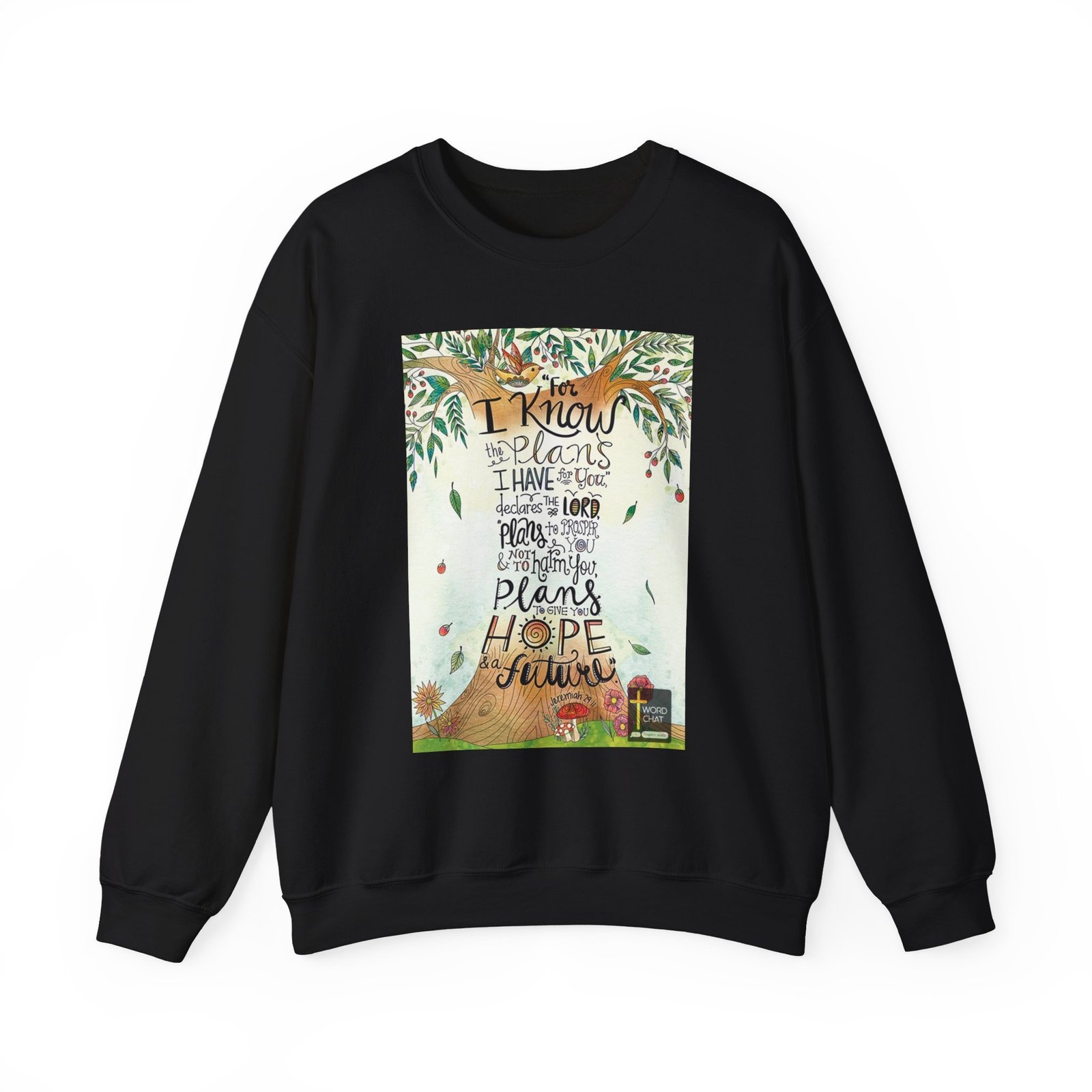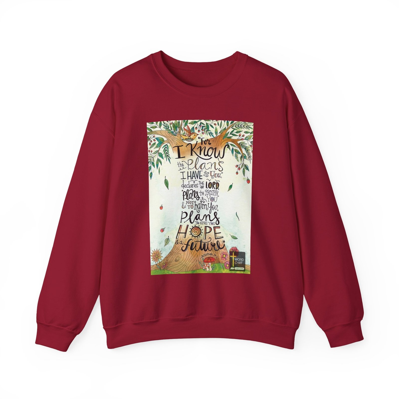 This vibrant, whimsical illustration features a beautifully illustrated tree with intricate branches, leaves, and red berries, centered around a scriptural quote from Jeremiah 29:11. The artwork is created in a hand-drawn, watercolor-style with soft green and pastel backgrounds, adorned with falling leaves, flowers, and a charming bird perched in the branches. The quote, “For I know the plans I have for you,” declares the Lord, “plans to prosper you and not to harm you, plans to give you hope and a future,” is artfully integrated into the tree’s design, with each line flowing organically through the illustration. The text is hand-lettered in various playful fonts and sizes, creating visual interest and emphasizing key words. At the bottom of the image, decorative elements like mushrooms and flowers add to the image’s whimsical and inspirational nature.