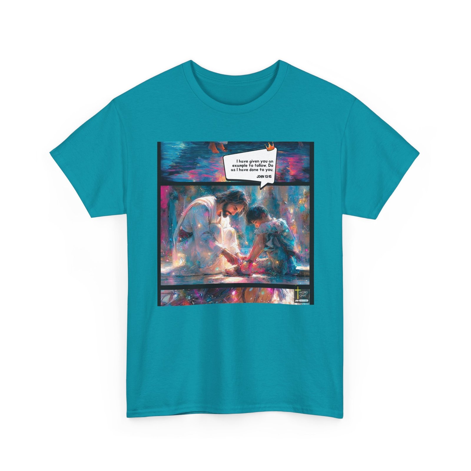 This vivid, artistic image depicts a biblically-inspired scene with a stylized, ethereal painting technique using vibrant blues, pinks, and whites. The illustration shows a figure resembling Jesus washing the feet of a smaller figure, rendered in a dreamy, impressionistic style with soft edges and luminous color gradients. The top of the image contains a speech bubble with a quote from John 13:15, referencing the act of servant leadership and humility. The artwork is characterized by its dynamic brushstrokes, sparkling light effects, and a crown icon, creating a sense of divine significance and emotional depth. The color palette and fluid painting style give the image a transcendent, spiritual quality that emphasizes the compassionate interaction between the two figures.