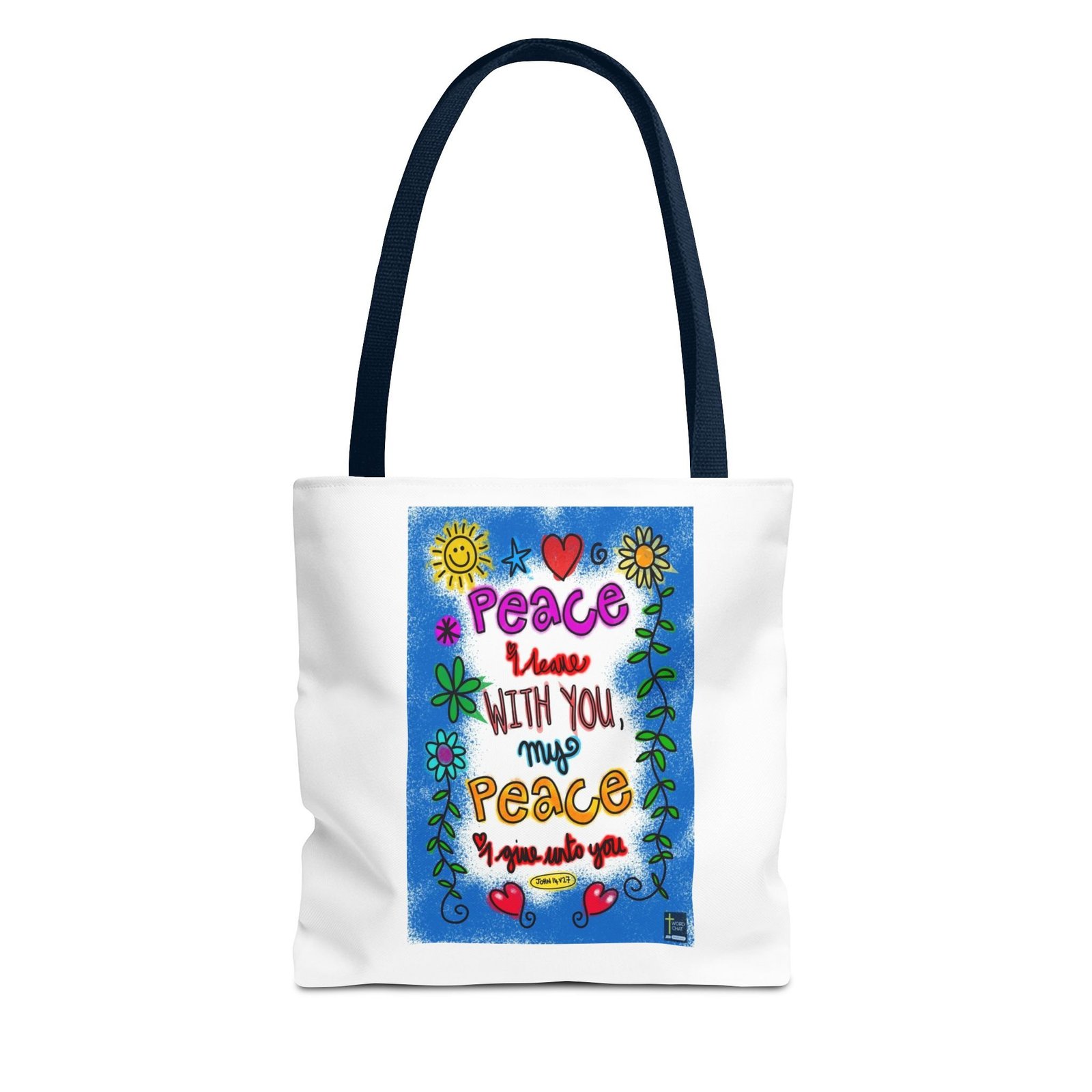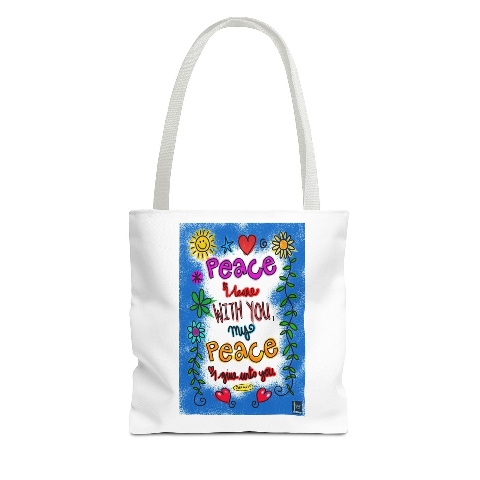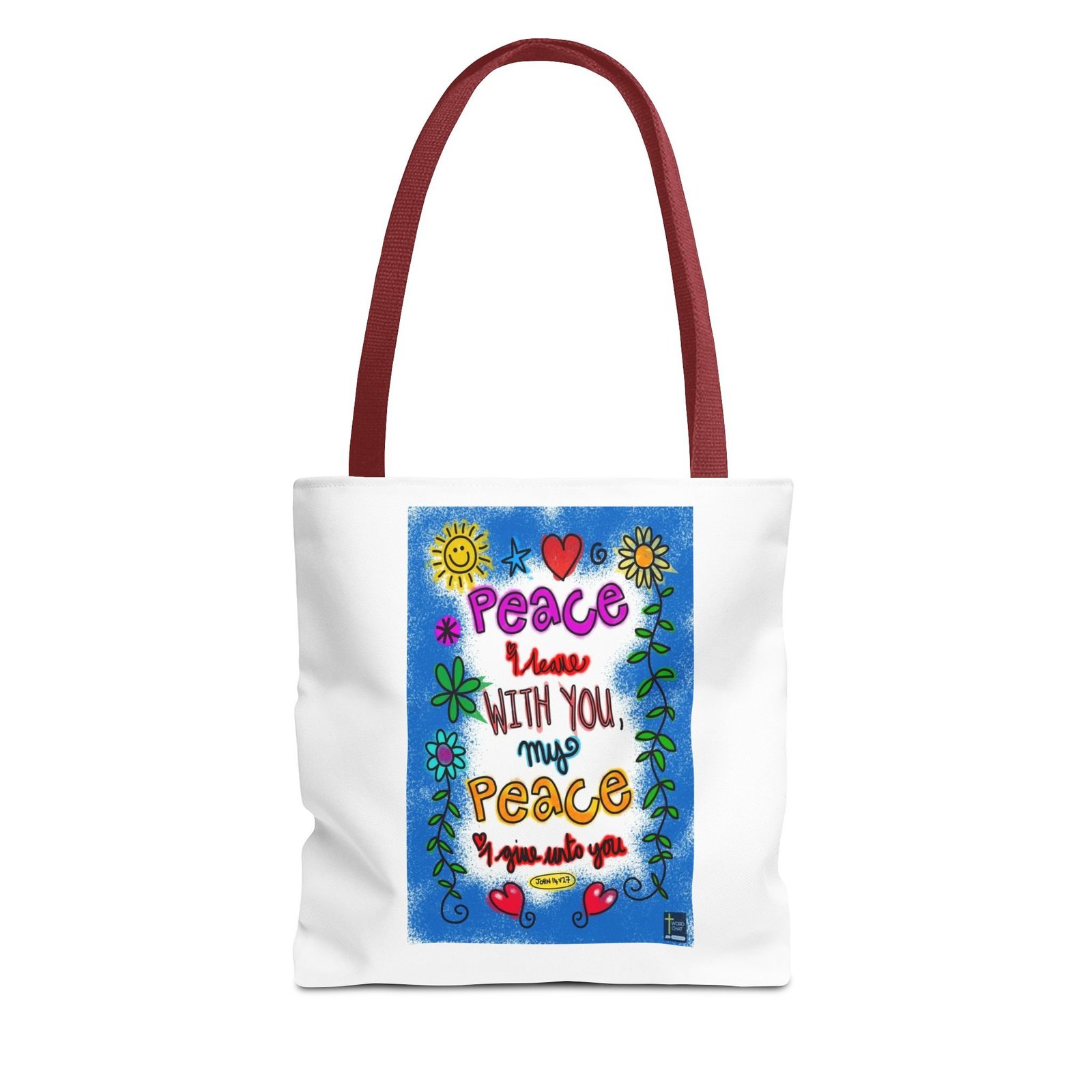 This vibrant and whimsical image is a colorful illustration of a Bible verse from John 14:27, featuring the theme of peace. The artwork is set against a textured blue background and decorated with playful elements like a smiling sun, a red heart, a star, and green flowers with leafy vines. The text “Peace I leave WITH YOU, my Peace I give unto you” is prominently displayed in pink, orange, and red lettering, surrounded by a white, slightly blurred border. Cheerful, hand-drawn style icons and symbols such as flowers, hearts, and a sunflower complement the uplifting message. The design has a hand-drawn, doodle-like quality with a bright, optimistic color palette that conveys a sense of joy and tranquility.
