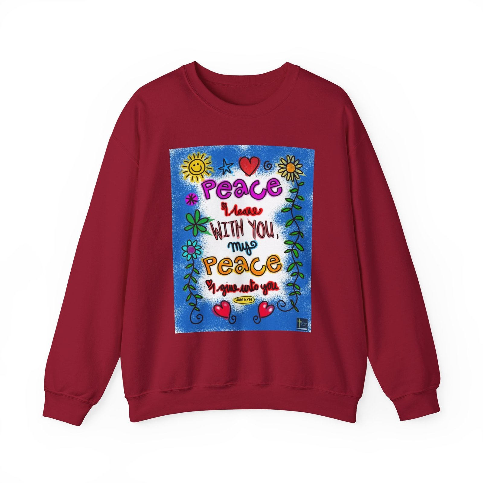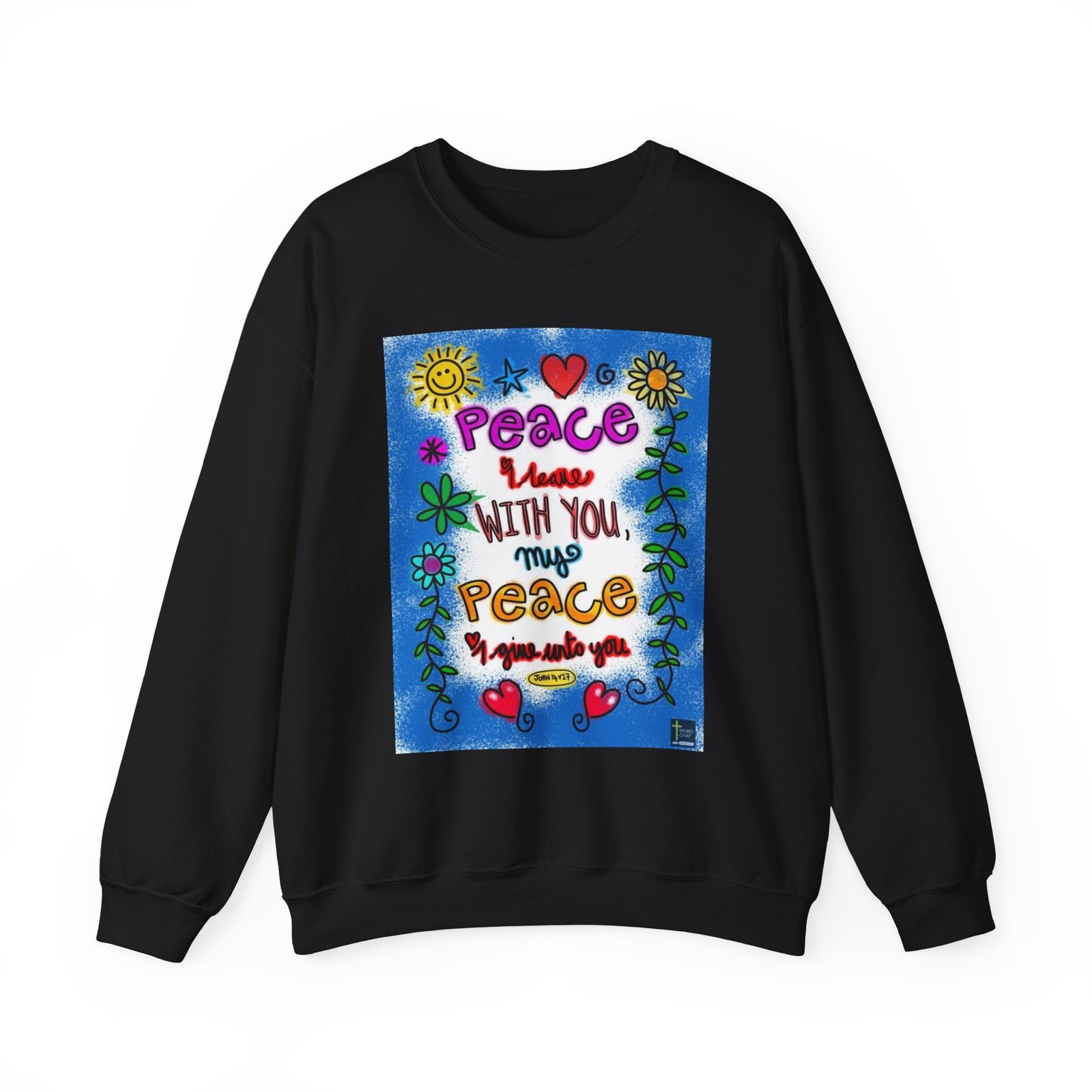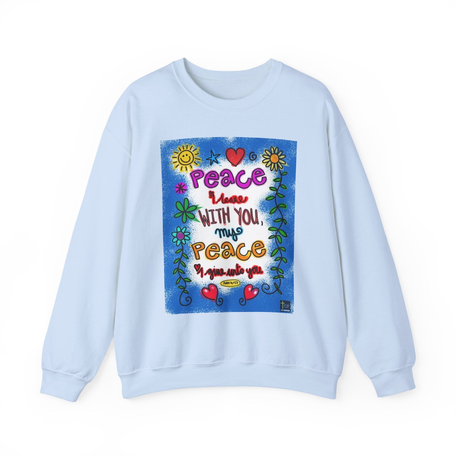 This colorful and vibrant image features the words “Peace I leave WITH YOU, my Peace I give unto you” from John 14:27, set against a bright blue textured background. The text is surrounded by playful, hand-drawn style elements including a smiling yellow sun, a red heart, a blue star, and green flowers with leaves forming a decorative border. The words “Peace” are prominently displayed in large, pink and orange letters with a hand-drawn, whimsical aesthetic. Cute graphic elements like small flowers, hearts, and a sunflower add to the cheerful and uplifting design. The image has a hand-drawn, artistic style with a rough, spray-painted texture and uses a bright, cheerful color palette of blue, yellow, green, pink, and red.