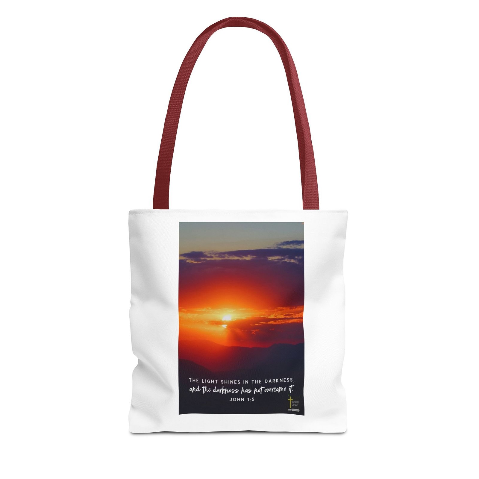 13″x13″ canvas tote to add both functionality and style! These custom-printed tote bags come with multiple handle color options to match your favorite WordChat image. Made with spun polyester, these bags feature double-stitched seams, cotton webbing straps, and nonwoven laminate lining for high-end durability. Your all-over print is created with dye sublimation for high-end visuals.