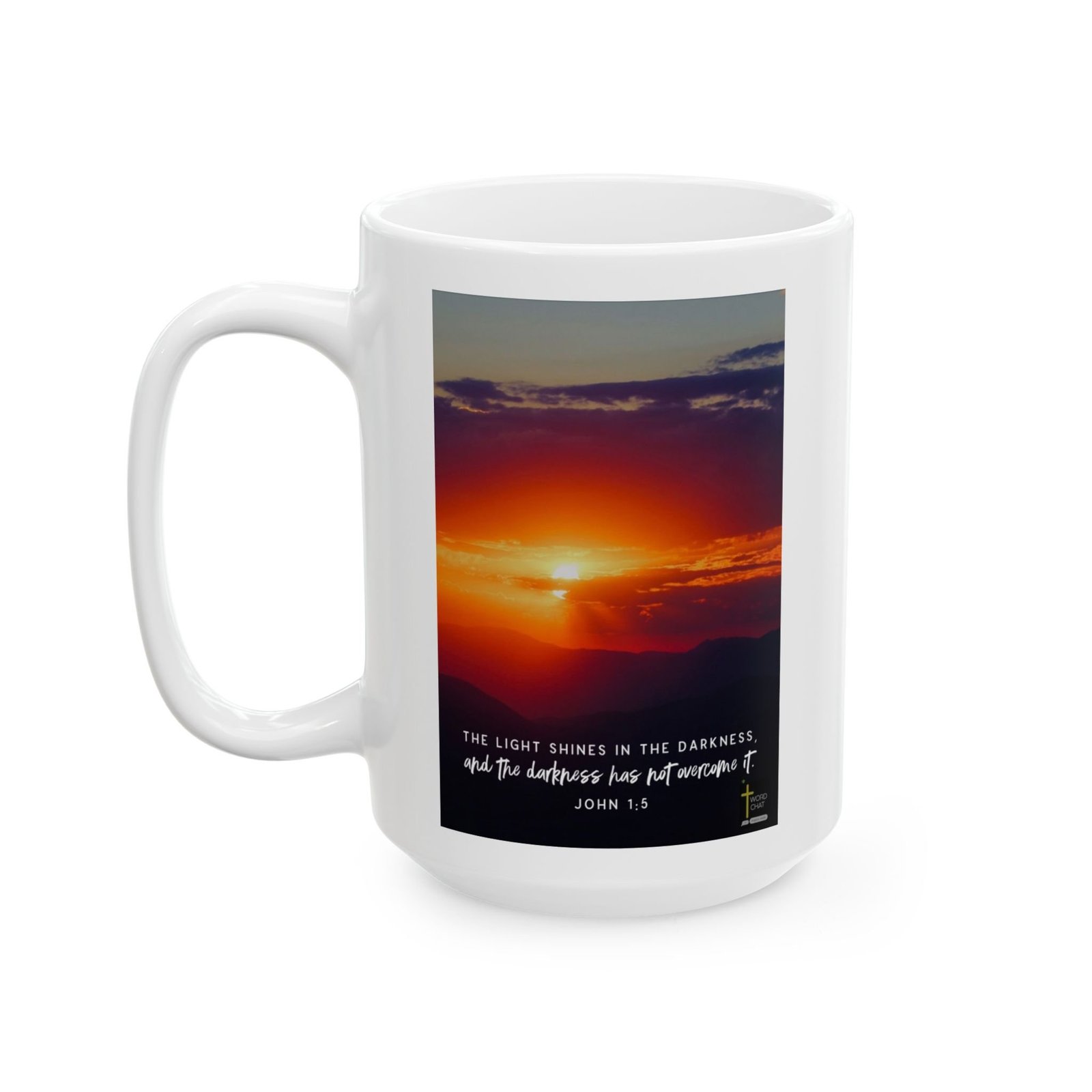 This stunning sunset image captures a breathtaking moment of natural beauty, with vibrant orange and red hues filling the sky as the sun descends behind distant mountain silhouettes. The dramatic landscape showcases layers of mountain ranges gradually fading into darkness, while the bright sun radiates intense golden light through wispy clouds. The color gradient transitions from deep purples and blues at the top of the image to brilliant oranges and yellows near the horizon, creating a powerful visual contrast. Overlaid on this magnificent scene is a biblical quote from John 1:5 reading “THE LIGHT SHINES IN THE DARKNESS, and the darkness has not overcome it” in crisp white text. The image, produced by Word Chat, uses the natural metaphor of sunlight penetrating darkness to illustrate the scriptural message of hope and resilience.