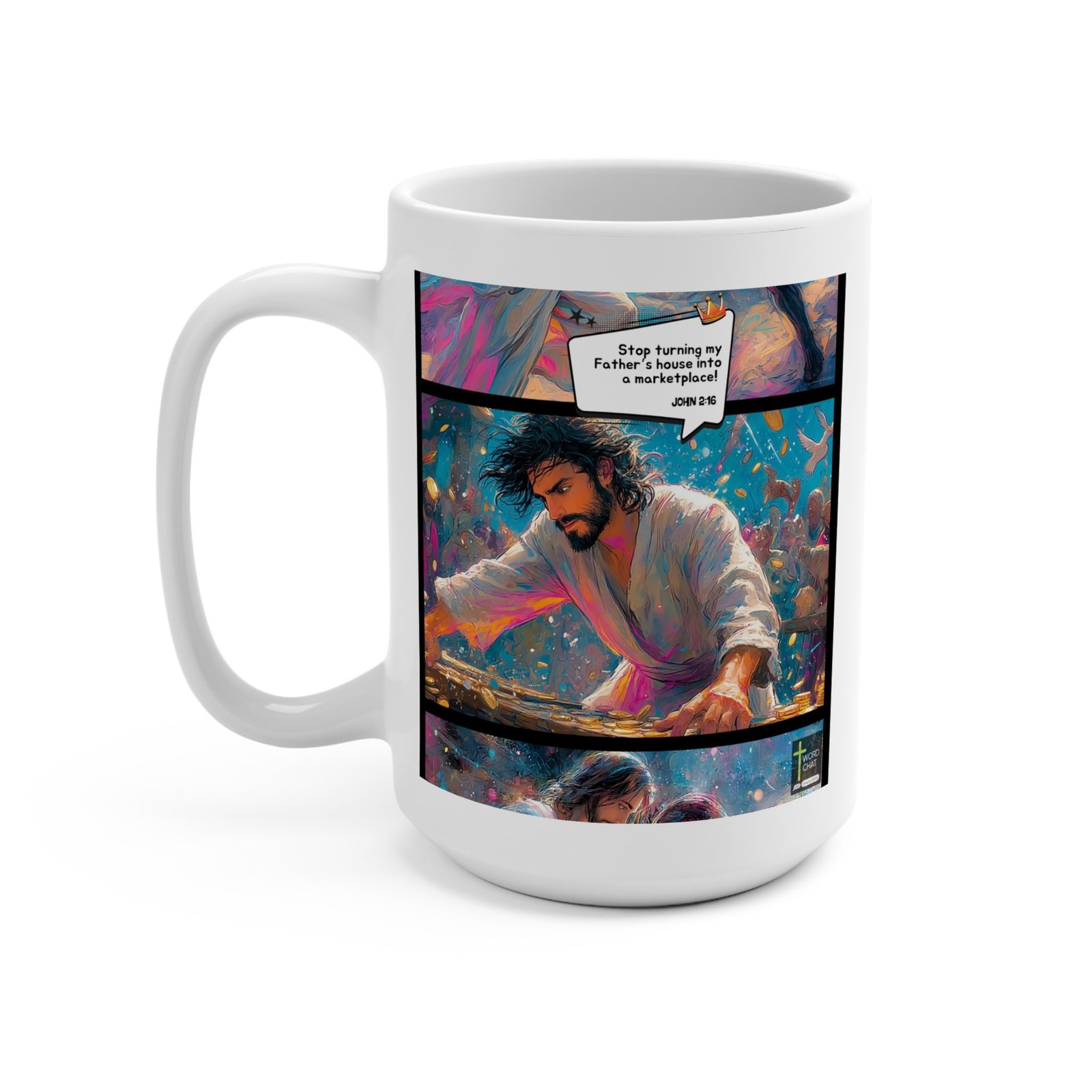 This vivid, stylized illustration depicts a biblical scene from John 2:16, showing Jesus clearing the temple marketplace. The artwork features a dynamic, colorful composition with swirling blues, pinks, and oranges creating a sense of motion and energy. In the central panel, a bearded figure (Jesus) is shown sweeping his arm across a table filled with coins, surrounded by scattered merchants and flying money. The image is rendered in a modern, painterly style with loose brushstrokes and an almost abstract quality that brings dramatic intensity to the scriptural moment. Golden coins, doves, and human figures populate the background, emphasizing the chaos and spiritual confrontation of the scene.
