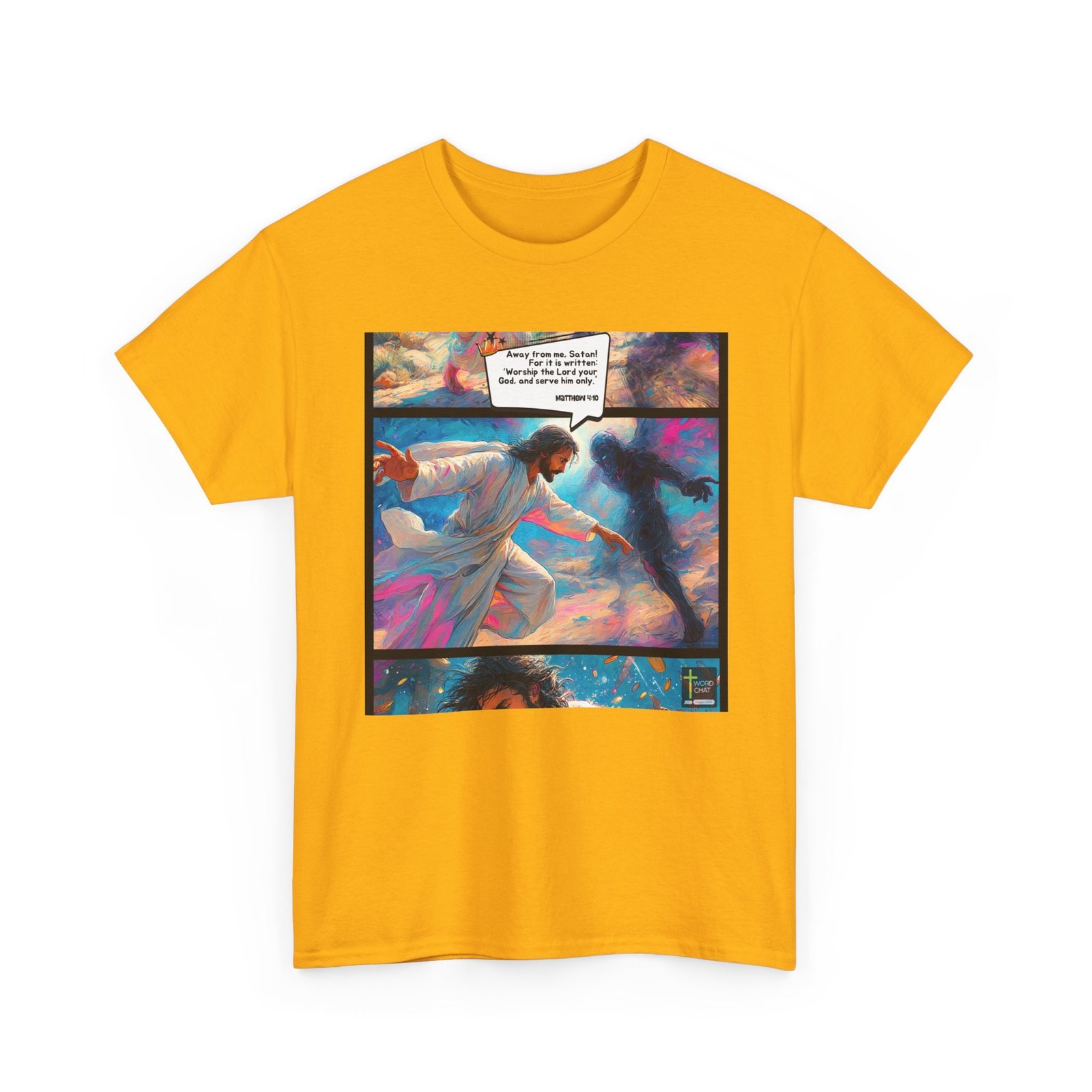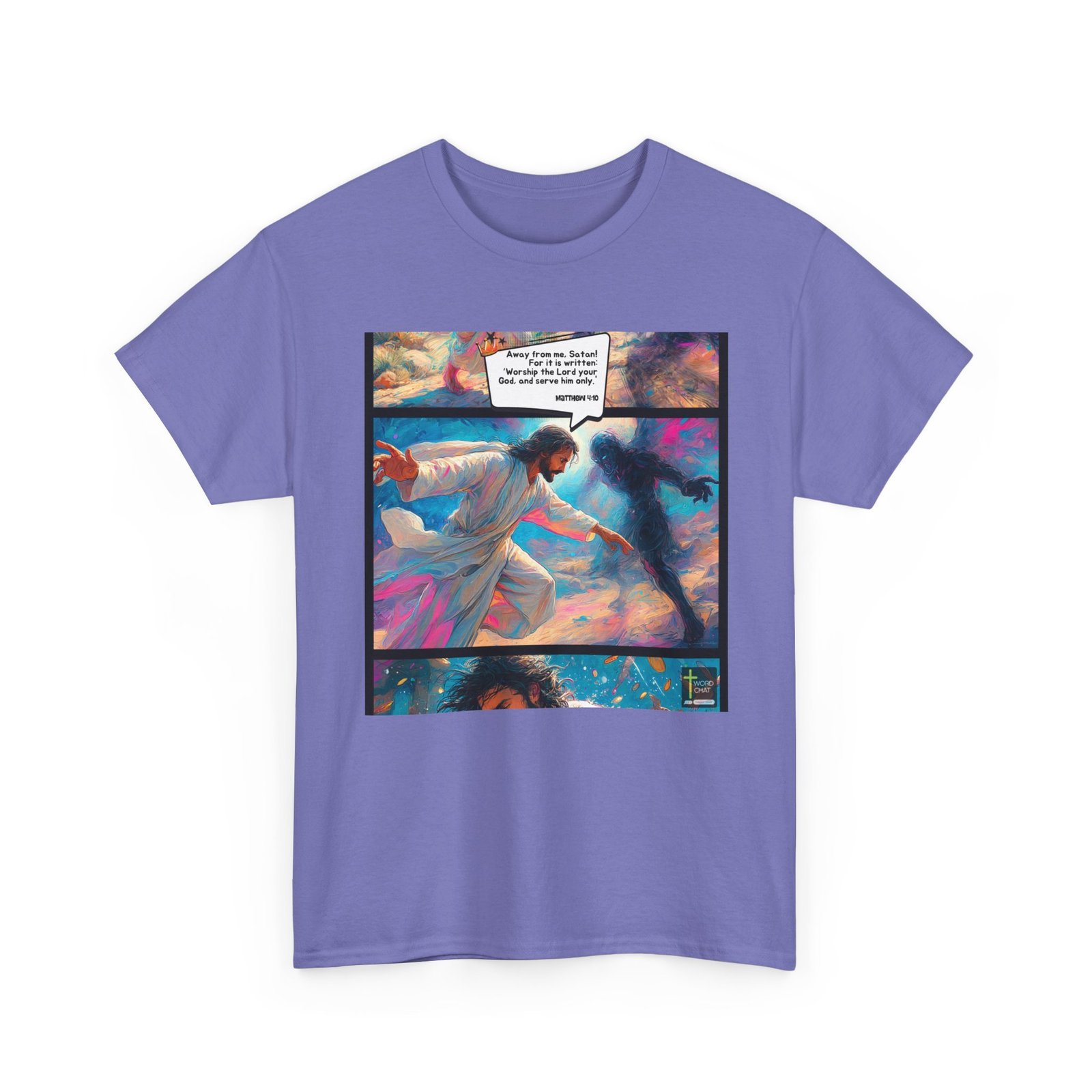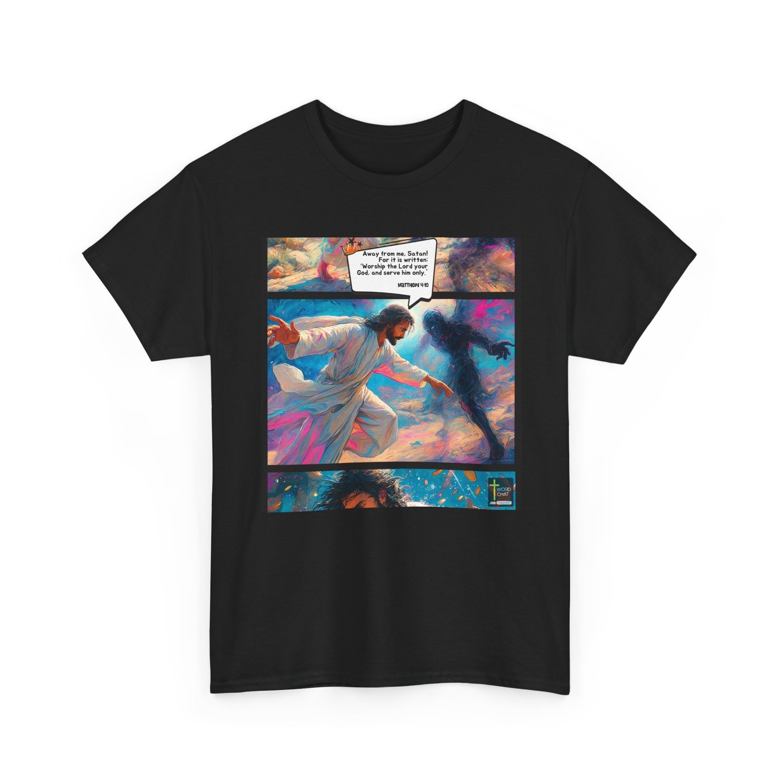 This vibrant, stylized digital artwork depicts a dramatic confrontation between a figure in white robes and a dark, shadowy entity, set against a swirling, colorful background of blues, pinks, and yellows. The scene illustrates a biblical moment, with text from John 2:16 stating “Away from me, Satan! For it is written: ‘Worship the Lord your God, and serve him only.'” The central figure, dressed in flowing white, appears to be repelling the dark force with an outstretched hand, creating a sense of spiritual warfare and divine power. The image is rendered in a painterly, almost impressionistic style, with fluid brushstrokes and dynamic color transitions that enhance the emotional intensity of the scene. The bottom panel shows a close-up of the central figure, surrounded by floating objects and a sense of ethereal energy.