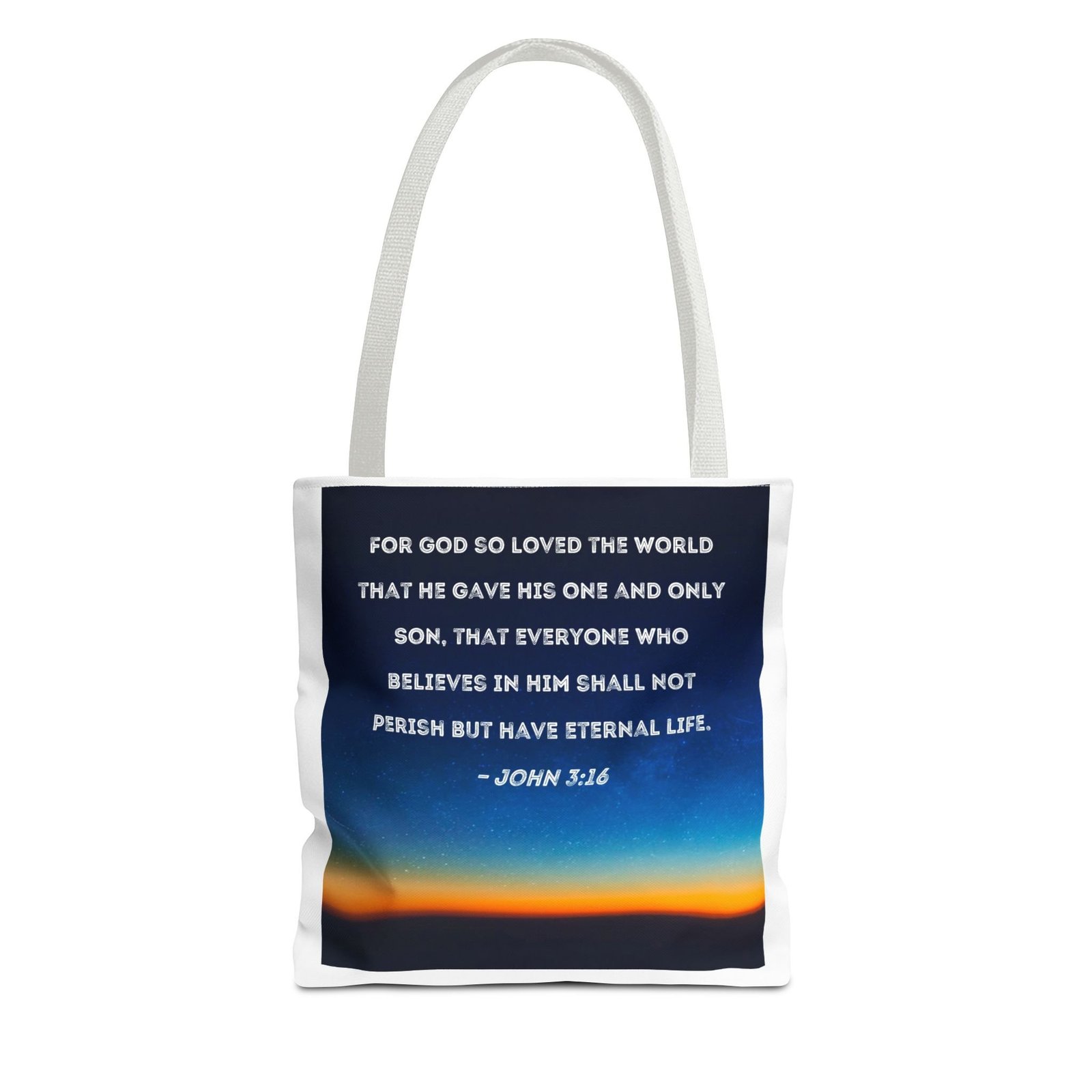 This image features the famous biblical verse John 3:16, displayed in white, capitalized text against a stunning starry sky background with a gradient of deep blue to vibrant orange at the horizon. The verse reads: “FOR GOD SO LOVED THE WORLD THAT HE GAVE HIS ONE AND ONLY SON, THAT EVERYONE WHO BELIEVES IN HIM SHALL NOT PERISH BUT HAVE ETERNAL LIFE.” The text is centered on the image and set against a beautiful sunset or sunrise landscape with a starry sky, creating a serene and inspirational visual atmosphere. The bottom right corner contains a small “WordChat” logo. The overall design combines spiritual messaging with a breathtaking celestial and terrestrial landscape, creating a powerful visual representation of divine love and hope.