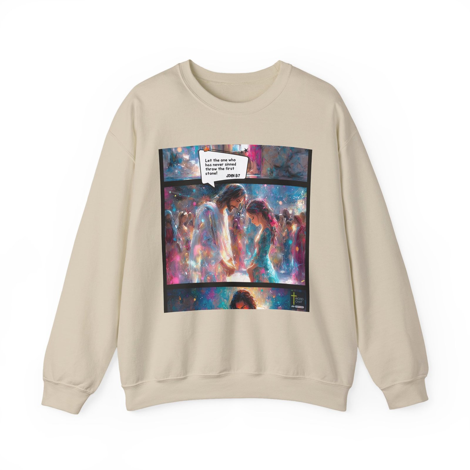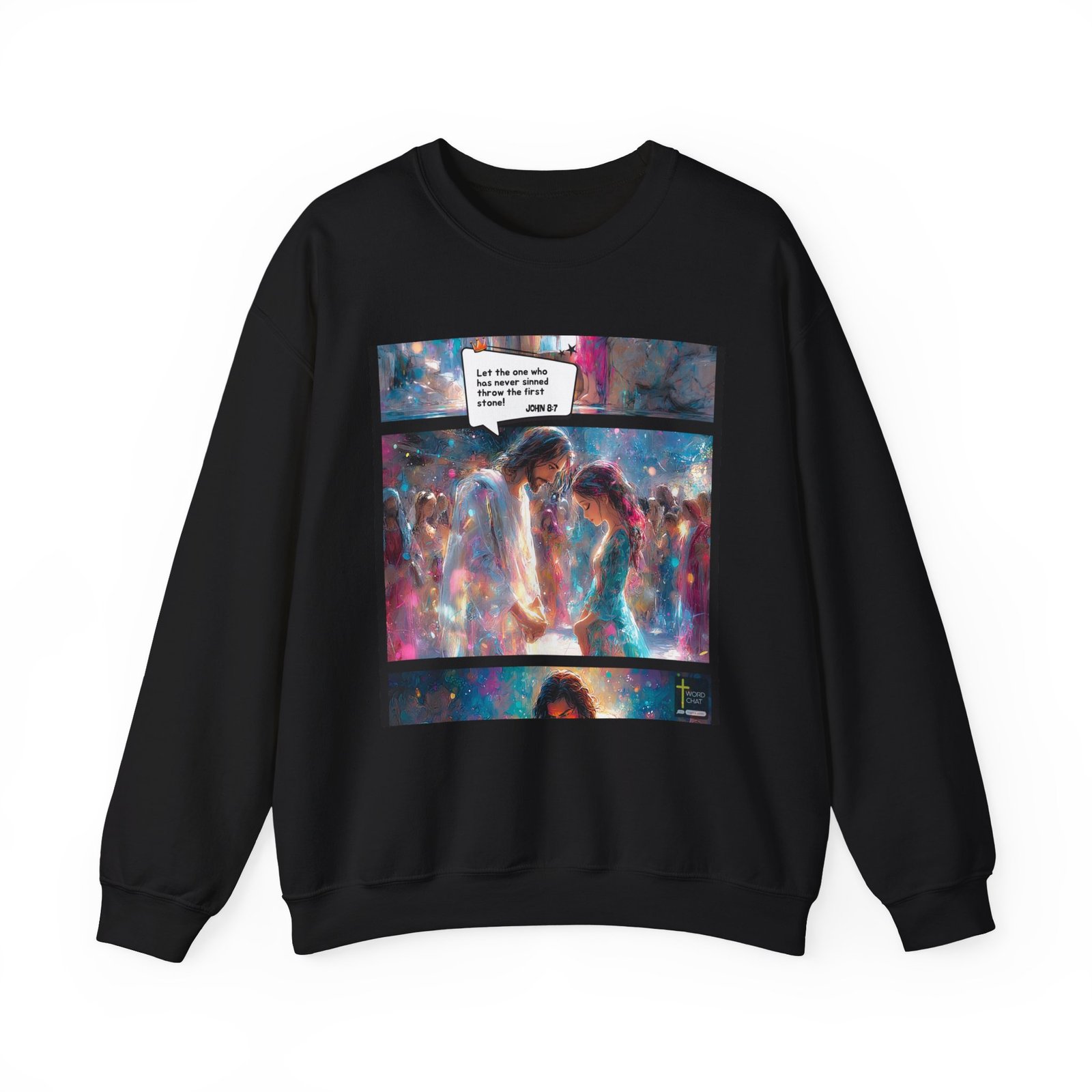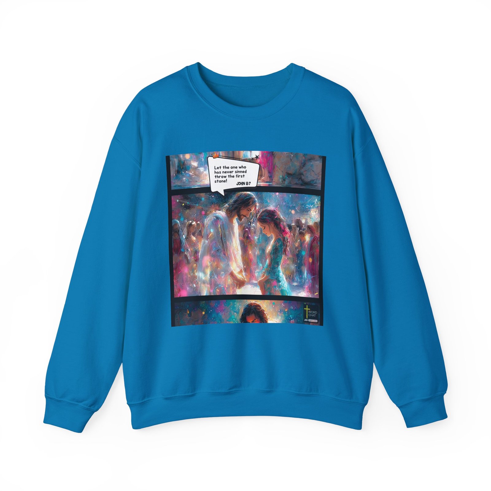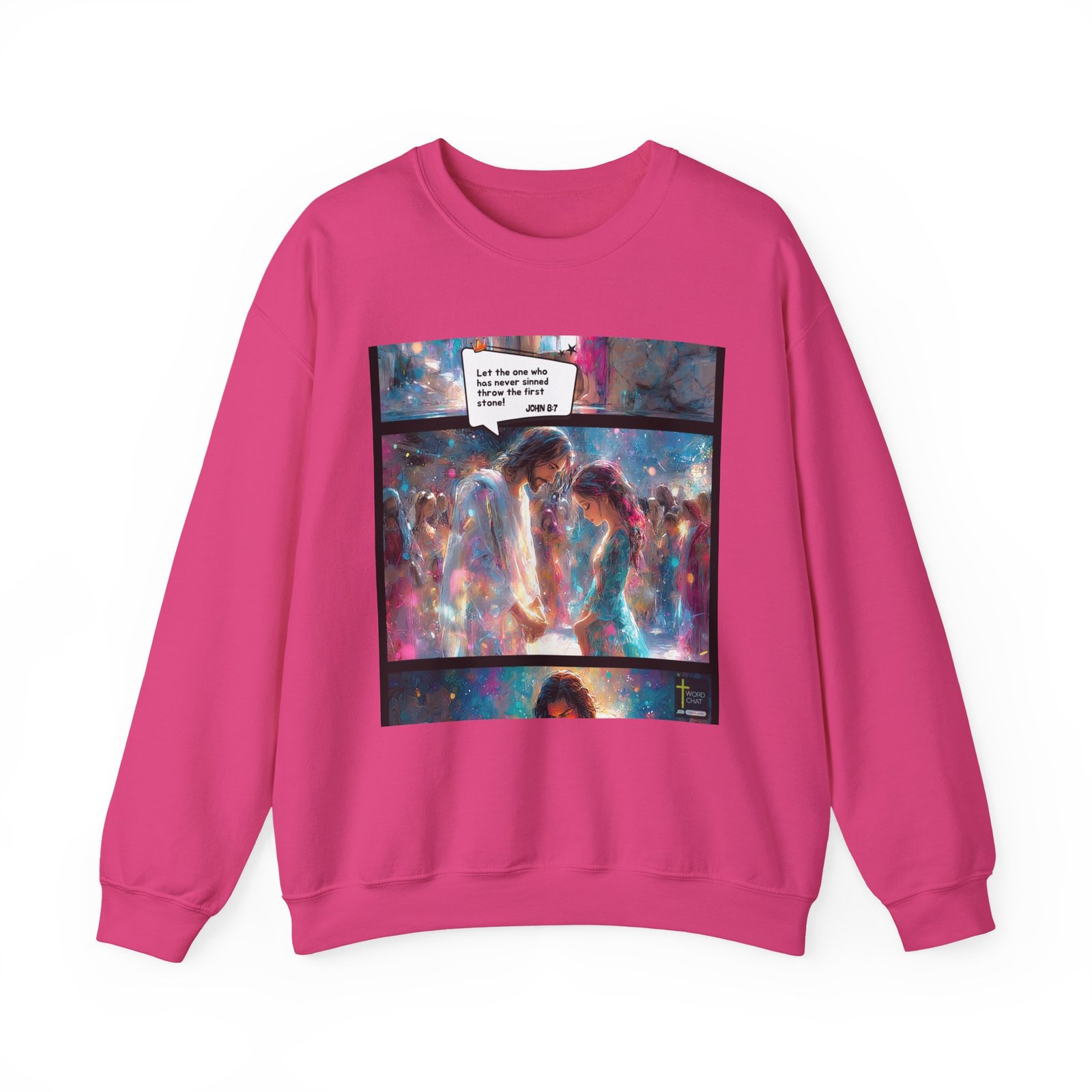 This vibrant digital artwork depicts a powerful biblical scene from John 8:7, rendered in a stunning, ethereal style with swirling colors of blue, pink, and white. The image shows a central figure, likely representing Jesus, standing beside a woman, with a crowd surrounding them in the background. The scene is illustrated with a dreamlike, watercolor-esque technique that blends soft edges and luminous light effects, creating a sense of spiritual intensity and emotional depth. A speech bubble contains the verse “Let the one who has never sinned throw the first stone,” highlighting the message of compassion and non-judgment. The artwork uses a rich, impressionistic color palette and dynamic brushstrokes to convey the spiritual and emotional weight of the biblical narrative.