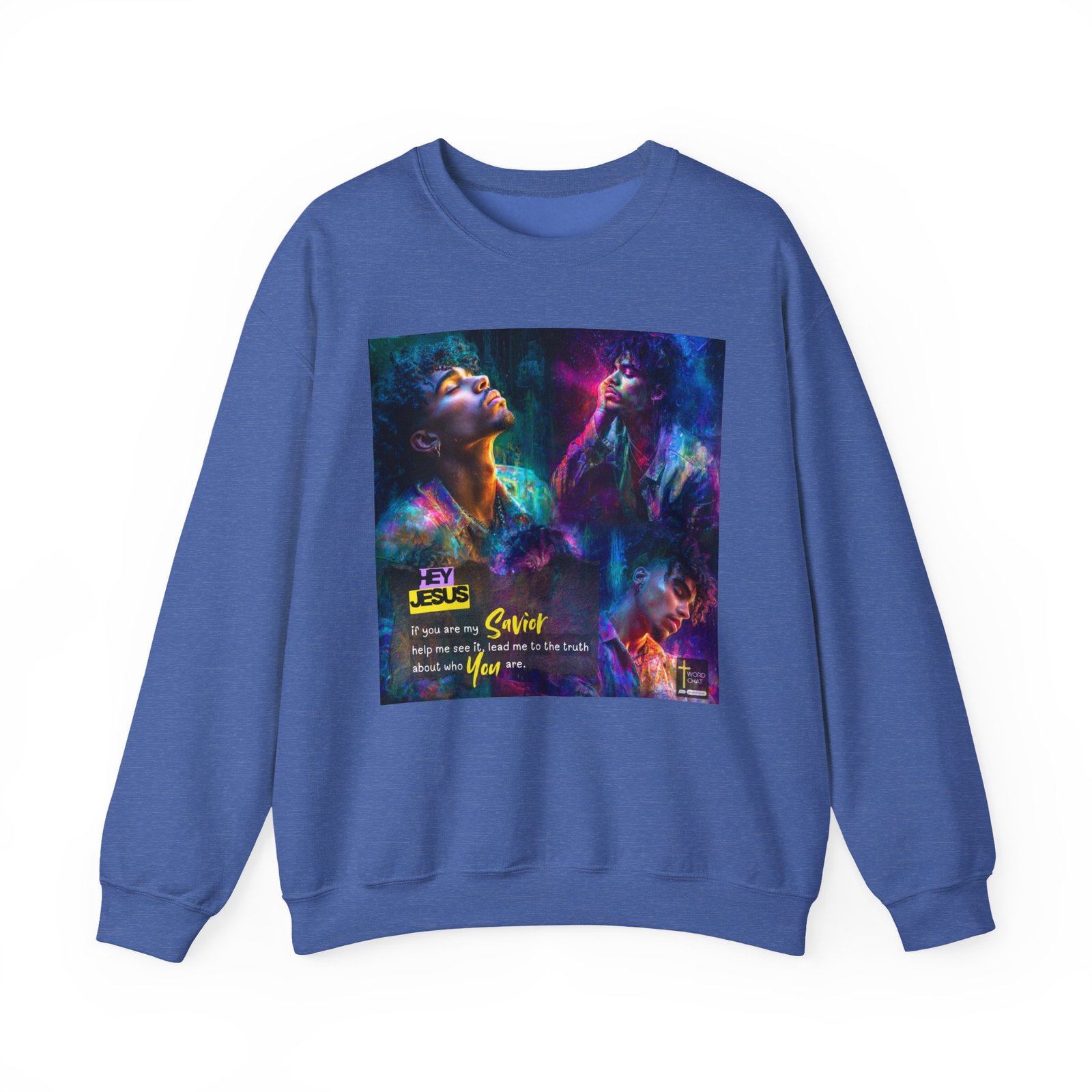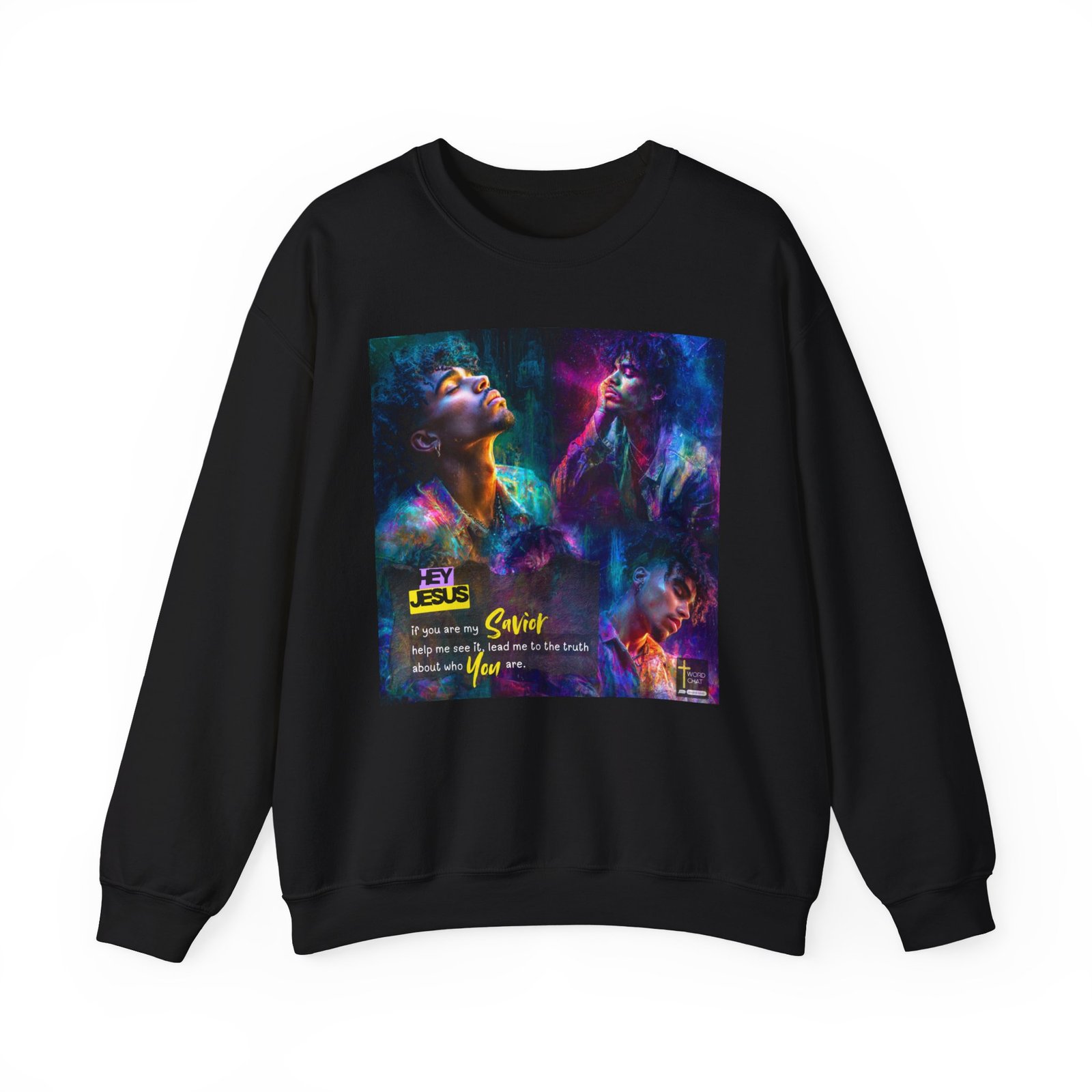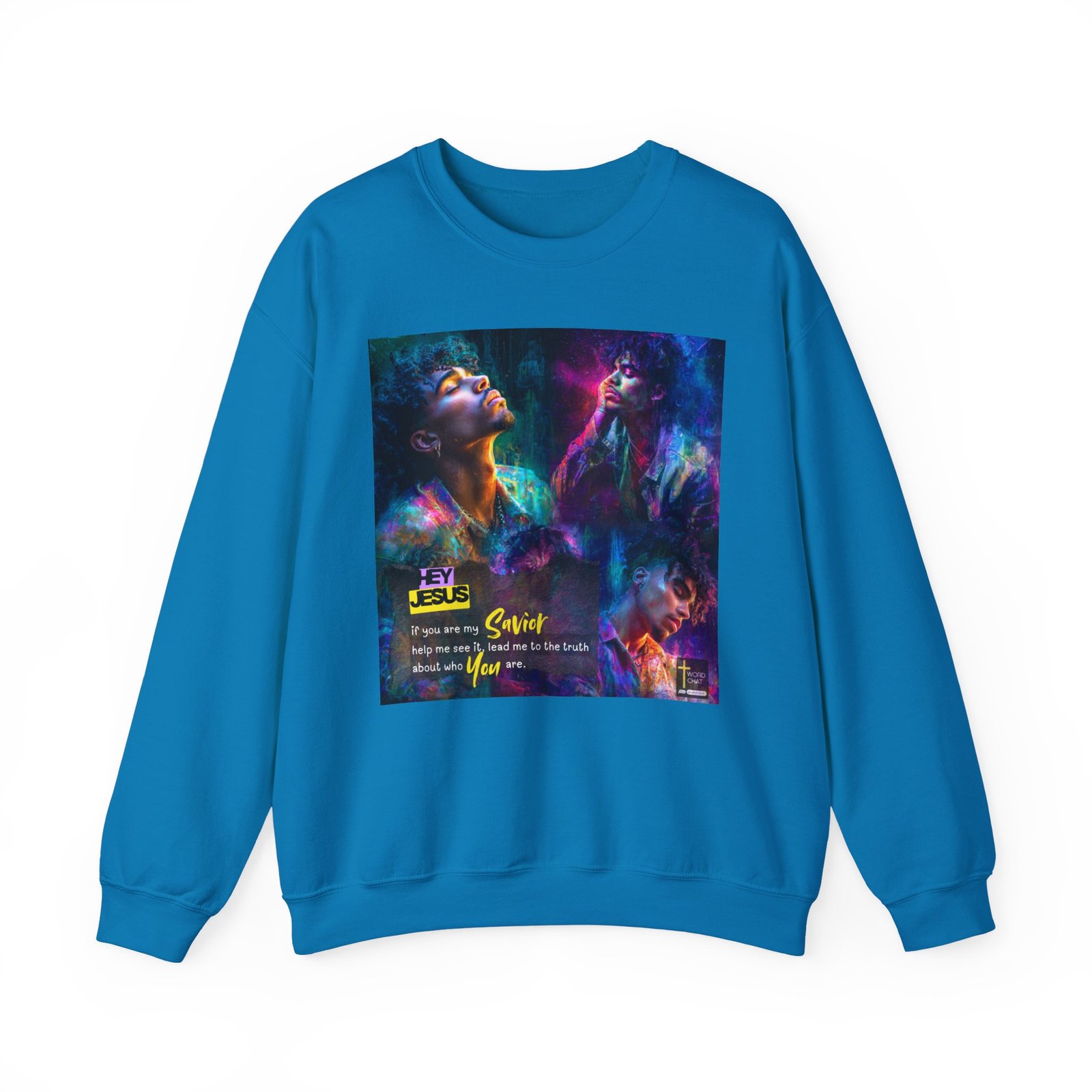 This stunning digital artwork features three men rendered in vivid neon colors against a textured urban background, blending portrait photography with abstract painting techniques. The image showcases vibrant gradients of purple, blue, cyan, magenta, and golden yellow that create a dynamic, spiritually-inspired aesthetic. Bold typography overlays the composition with the message “HEY JESUS if you are my Savior help me see it, lead me to the truth about who You are,” emphasizing its religious and motivational purpose. The artistic style combines contemporary street art with digital illustration, creating an eye-catching visual design suitable for Christian faith-based social media content. The WordChat logo and ‘inspire souls’ tagline sit in the bottom right corner, showing the brand of this platform for finding and sharing soul stirring messages.