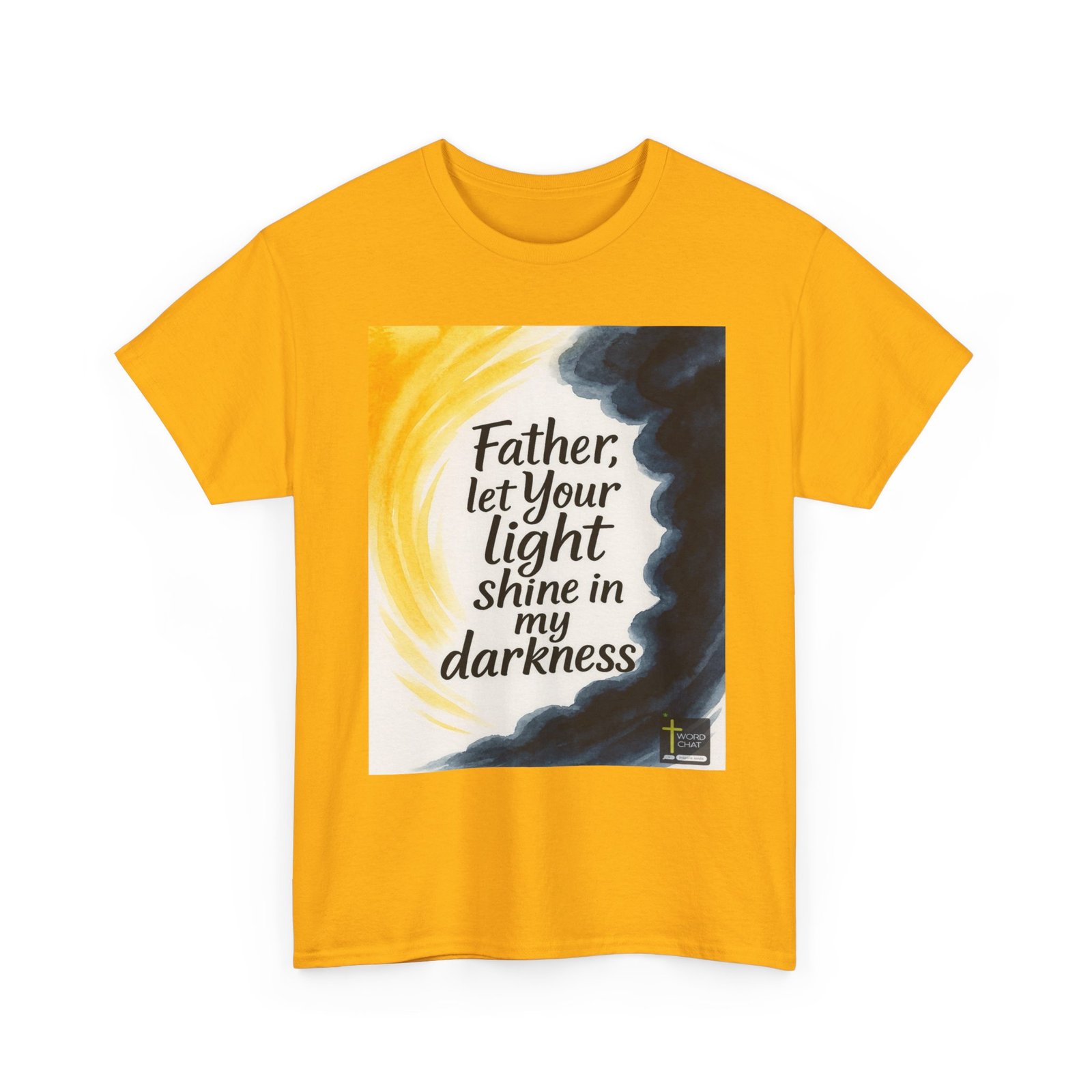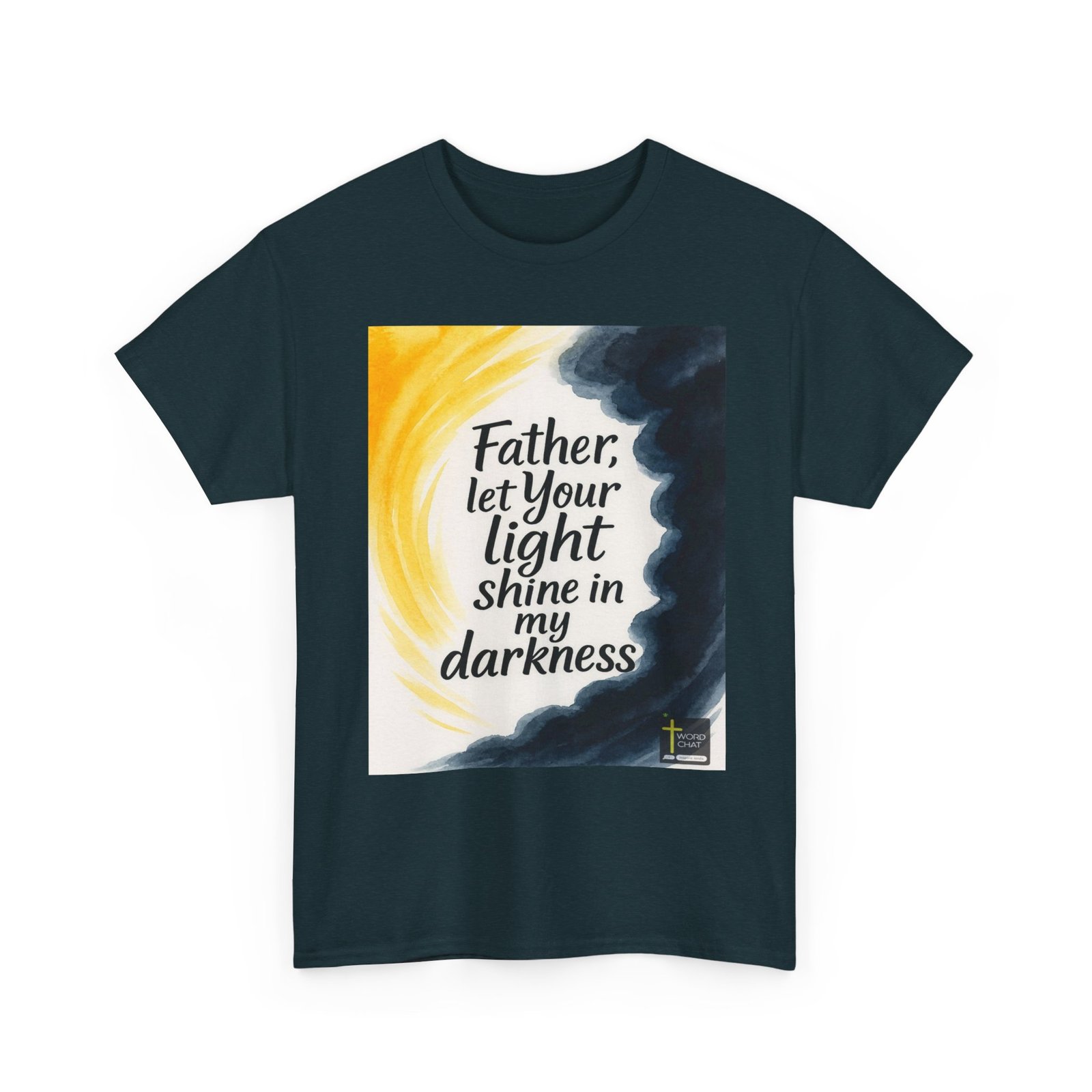 This stunning watercolor artwork features an uplifting spiritual message that reads “Father, let your light shine in my darkness,” centered against a serene cream-colored background. The composition showcases beautiful artistic contrasts with warm golden yellow brushstrokes on the left side symbolizing divine light, while deep navy and charcoal watercolor washes on the right represent darkness or adversity. The text is rendered in elegant black handwritten-style calligraphy, creating an accessible yet sophisticated visual appeal. The WordChat logo and ‘inspire souls’ tagline sit in the bottom right corner, showing the brand of this platform for finding and sharing soul stirring messages.