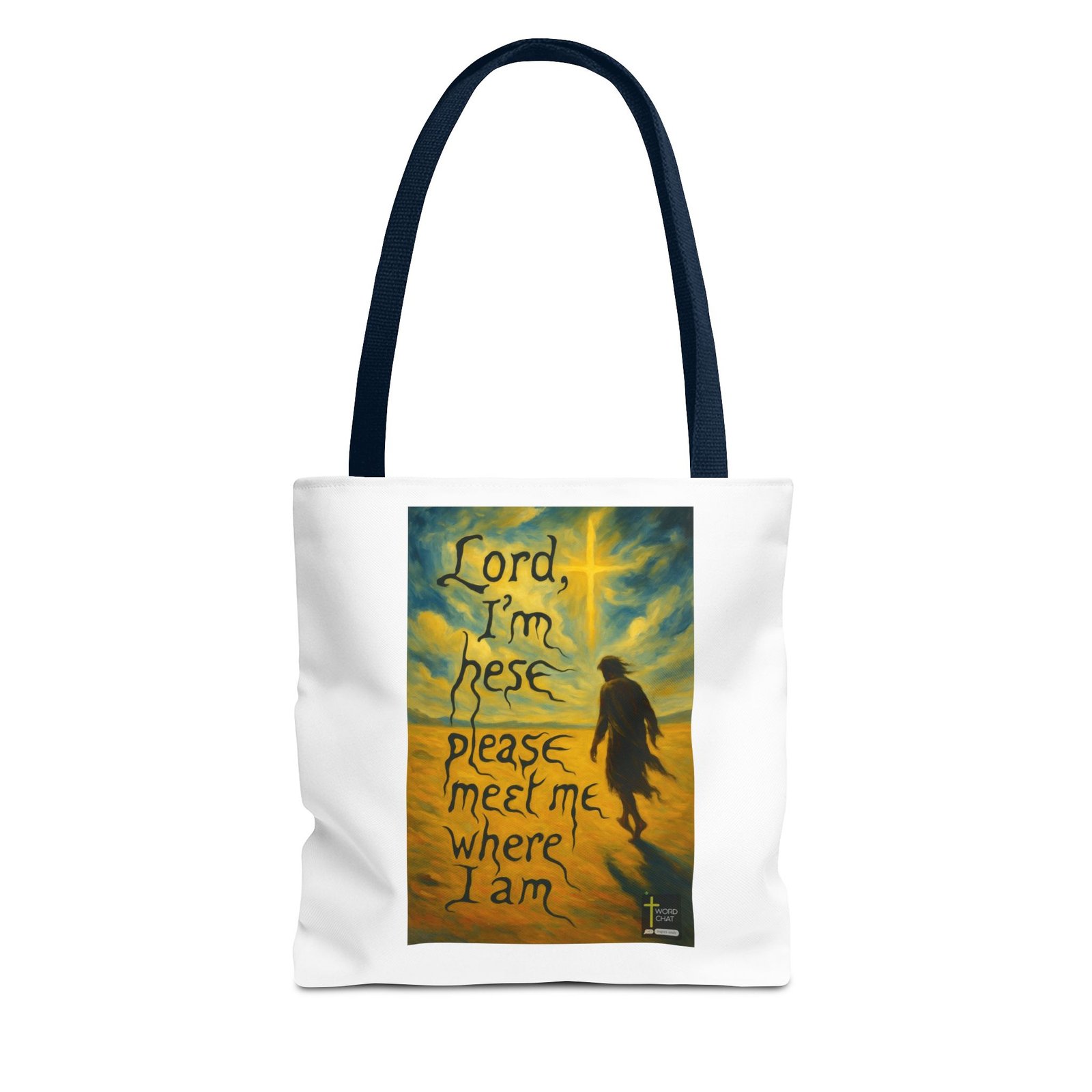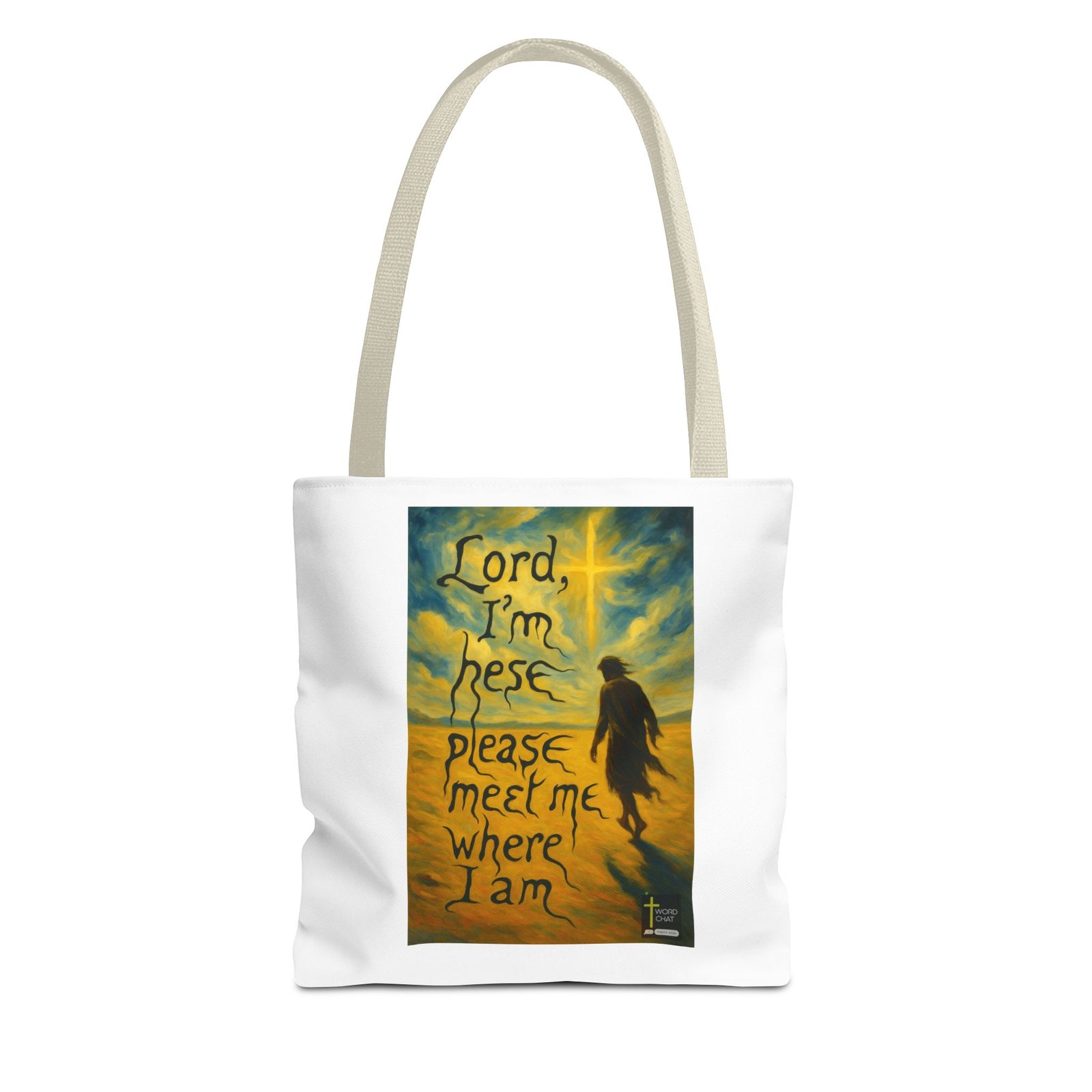 This inspirational artwork features a solitary figure standing in a vast, golden landscape beneath a radiant glowing cross in the sky. The image displays a Van Gogh-inspired painting style with swirling brushstrokes in warm yellows, golds, and blues that create an ethereal, heavenly atmosphere. Overlaid across the composition is a heartfelt prayer message reading “Lord, I’m here please meet me where I am,” written in black, organic lettering that appears to flow like roots or vines. The serene scene combines religious symbolism with emotional vulnerability, depicting a moment of spiritual connection and divine surrender. The WordChat logo and ‘inspire souls’ tagline sit in the bottom right corner, showing a place find soul stirring messages to share, as well as join a Christian social media platform.