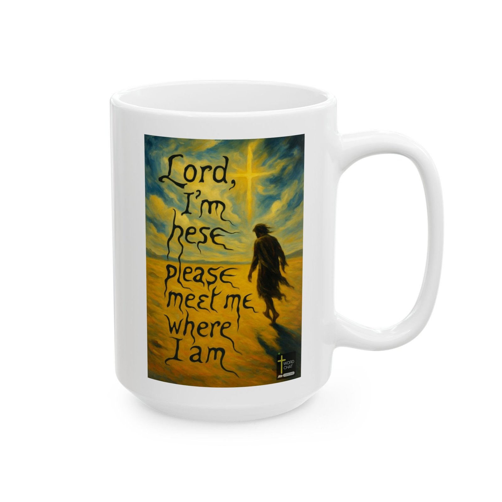 This inspirational religious artwork features a solitary figure standing in a vast golden landscape, gazing toward a luminous cross radiating heavenly light against a swirling sky. The image combines Van Gogh-inspired impressionistic brushstrokes with contemporary spiritual messaging, displaying the heartfelt prayer text “Lord, I’m here please meet me where I am” overlaid in bold black handwritten lettering. The color palette transitions from warm golden and yellow tones in the foreground to deeper blues and teals in the sky, creating a sense of spiritual transcendence and divine connection. The painting style emphasizes emotional depth through expressive, flowing brushwork that conveys vulnerability and faith. The WordChat logo and ‘inspire souls’ tagline sit in the bottom right corner, showing the brand of this platform for finding and sharing soul stirring messages.