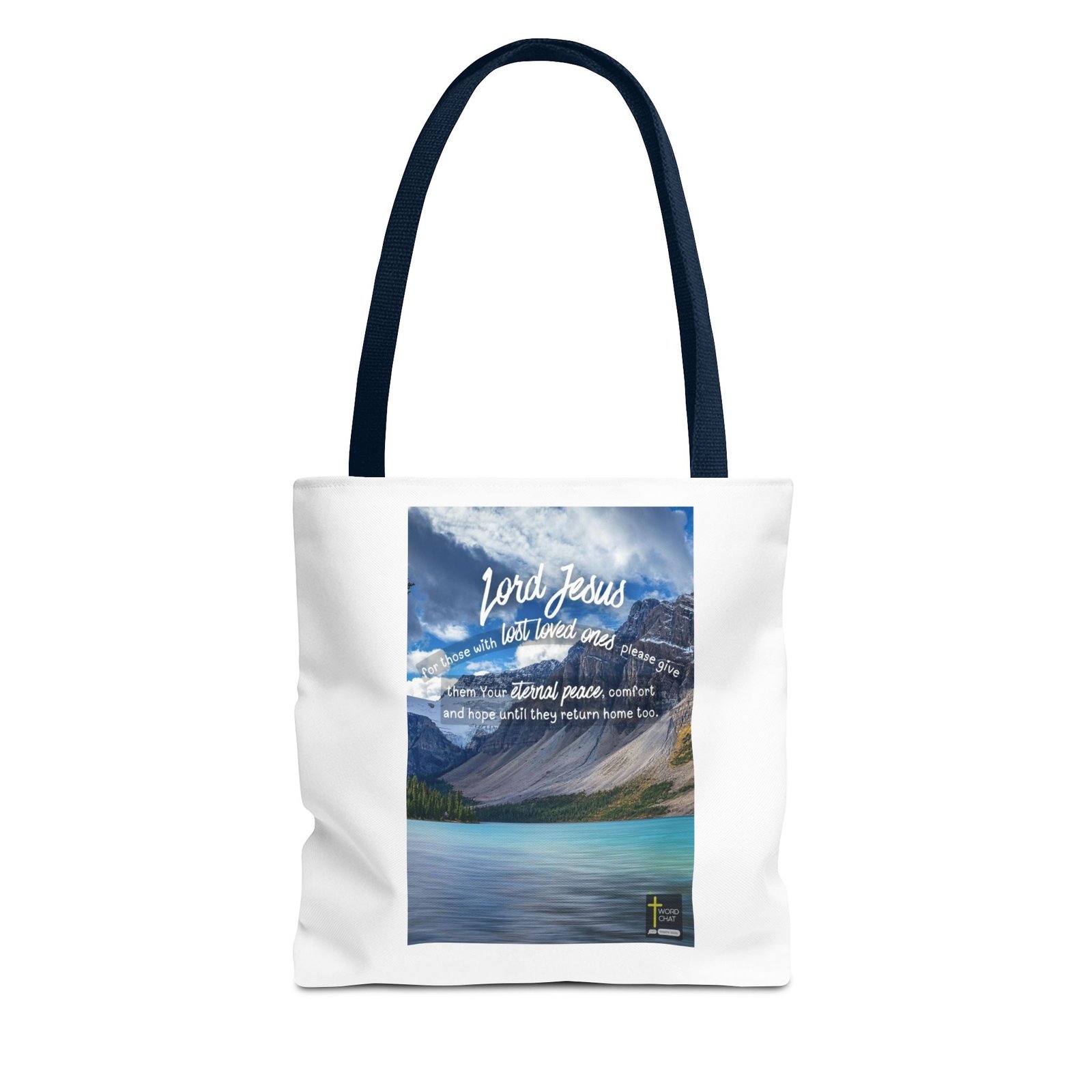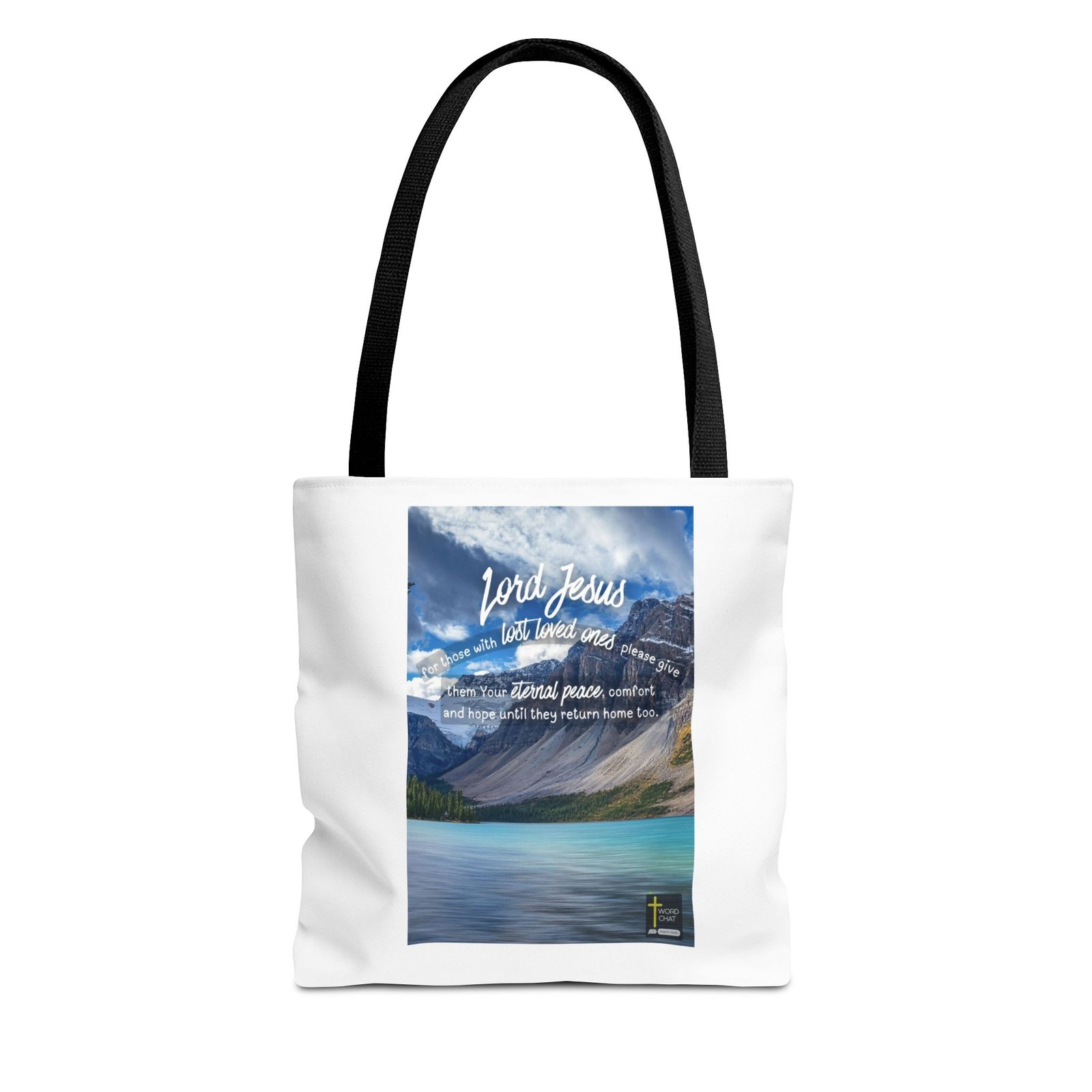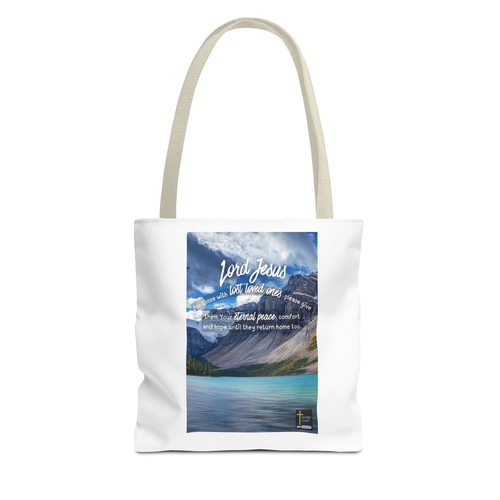 This inspirational religious image features a serene mountain lake landscape with turquoise waters, snow-capped peaks, and evergreen forests under a bright blue sky with white clouds. Overlaid on the scenic background is a heartfelt prayer message in white script and regular text that reads: “Lord Jesus, for those with lost loved ones please give them Your eternal peace, comfort and hope until they return home too.” The composition combines natural beauty with spiritual messaging, designed to provide solace and encouragement to those grieving the loss of loved ones. The WordChat logo and ‘inspire souls’ tagline sit in the bottom right corner, showing the brand of this platform for finding and sharing soul stirring messages. The overall aesthetic style is contemporary Christian inspirational art, blending landscape photography with motivational scripture-based text.