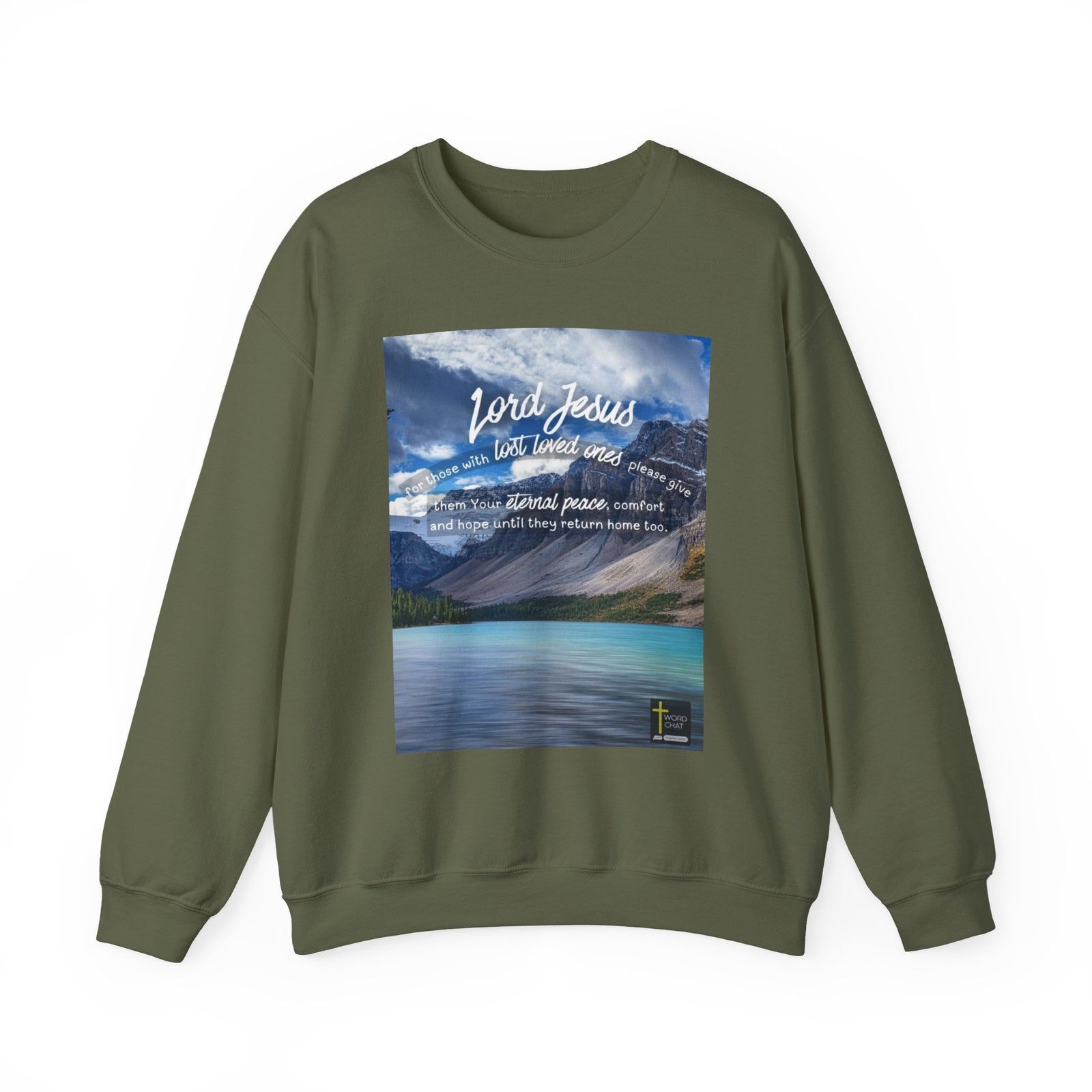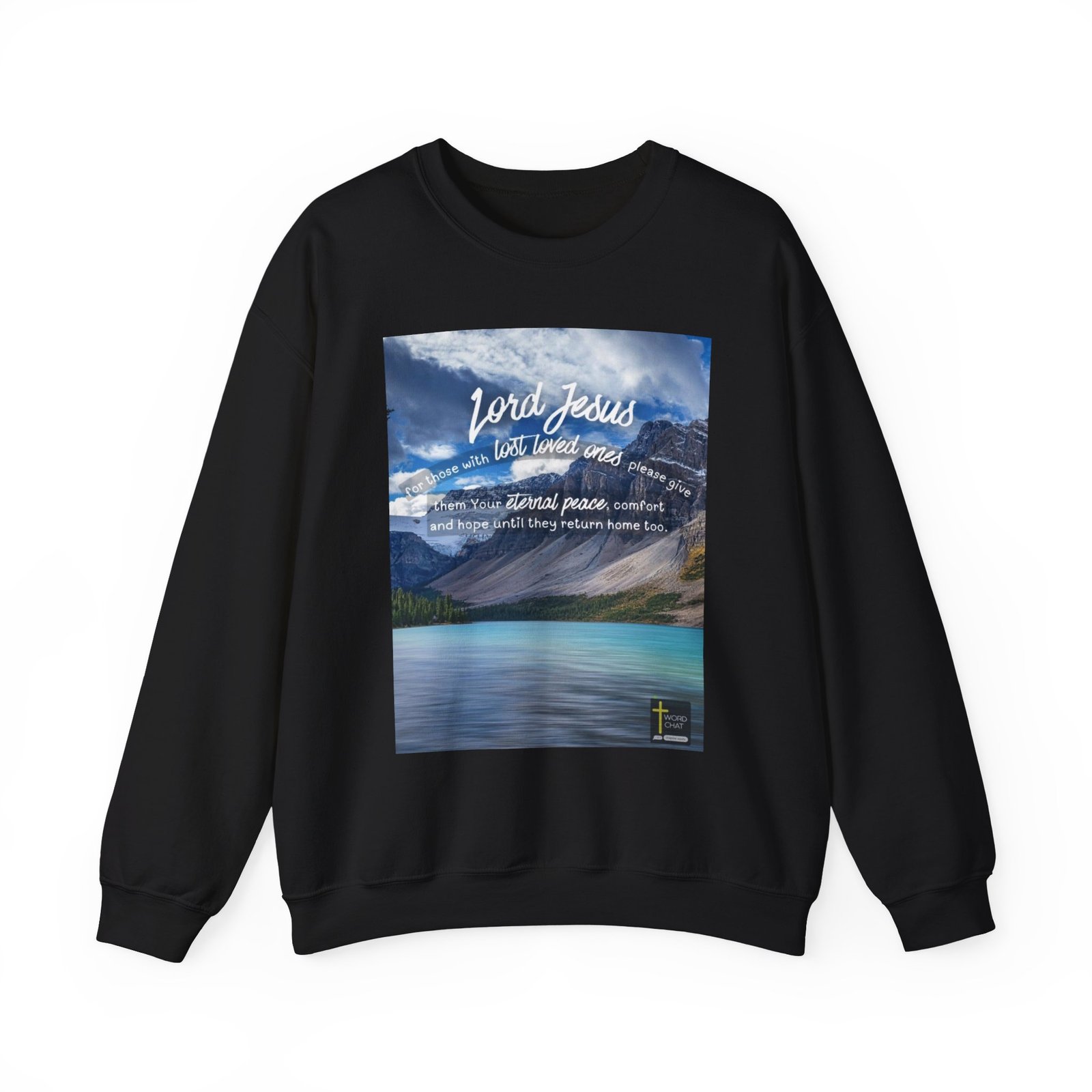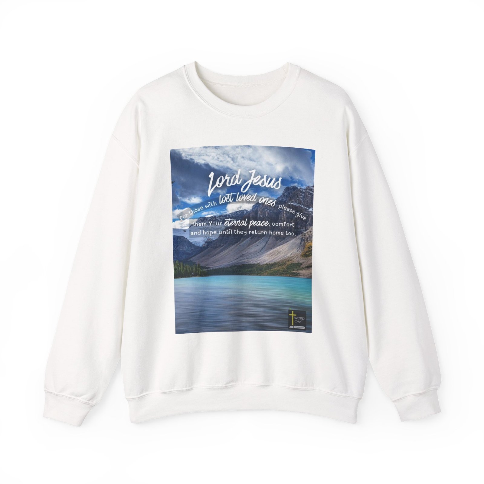 This spiritual image features an uplifting prayer message overlaid on a breathtaking mountain landscape, displaying a turquoise alpine lake surrounded by dramatic rocky peaks and evergreen forests. The text reads “Lord Jesus, for those with lost loved ones please give them Your eternal peace, comfort and hope until they return home too,” rendered in elegant white script font that contrasts beautifully against the scenic background. The composition showcases a serene natural setting with snow-capped mountains, a pristine glacial lake, and coniferous trees, creating a peaceful and contemplative atmosphere perfect for religious or motivational content. The WordChat logo and ‘inspire souls’ tagline sit in the bottom right corner, showing the brand of this platform for finding and sharing soul stirring messages.