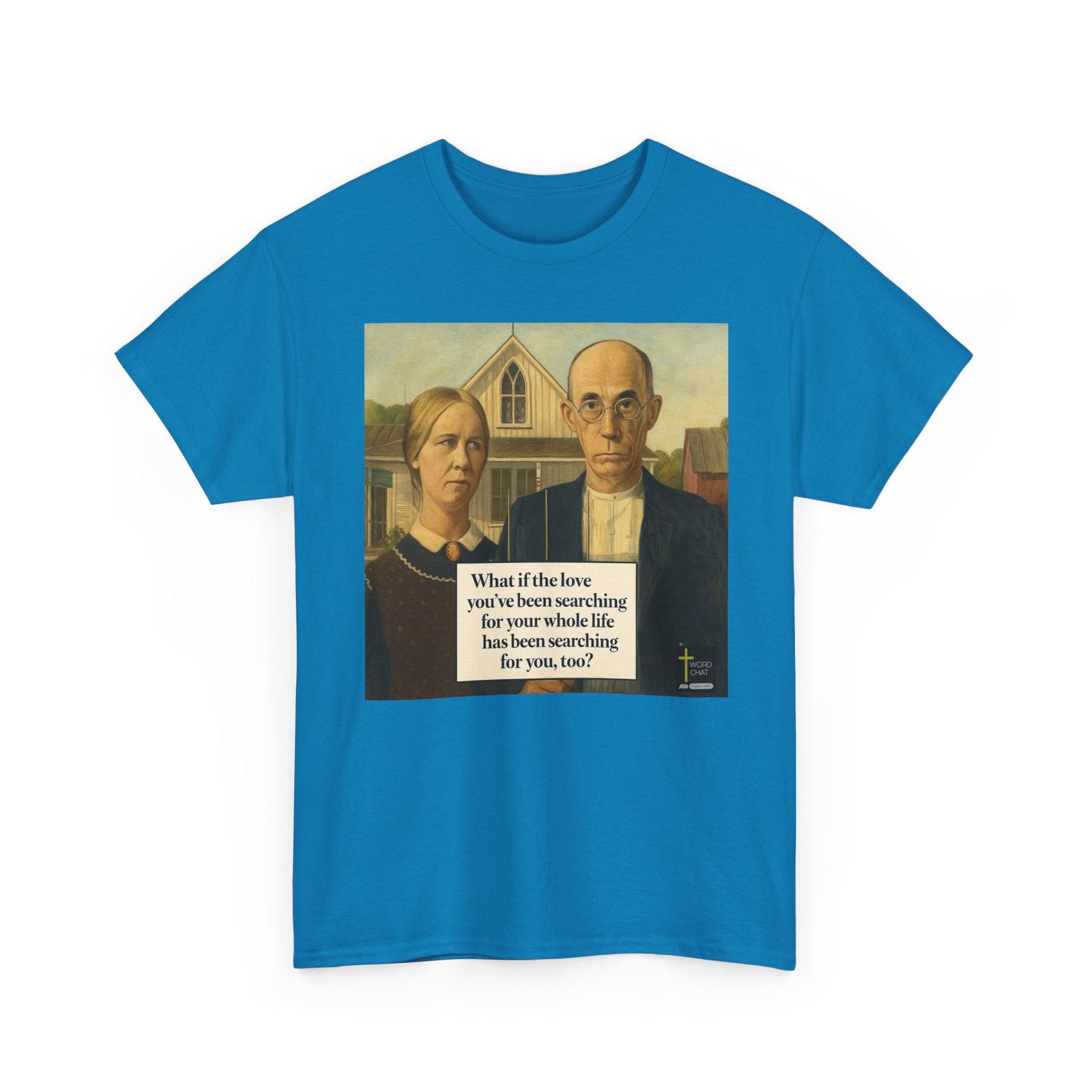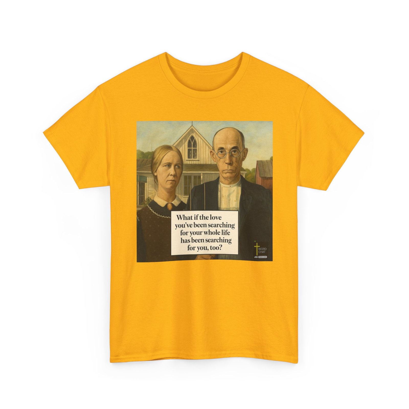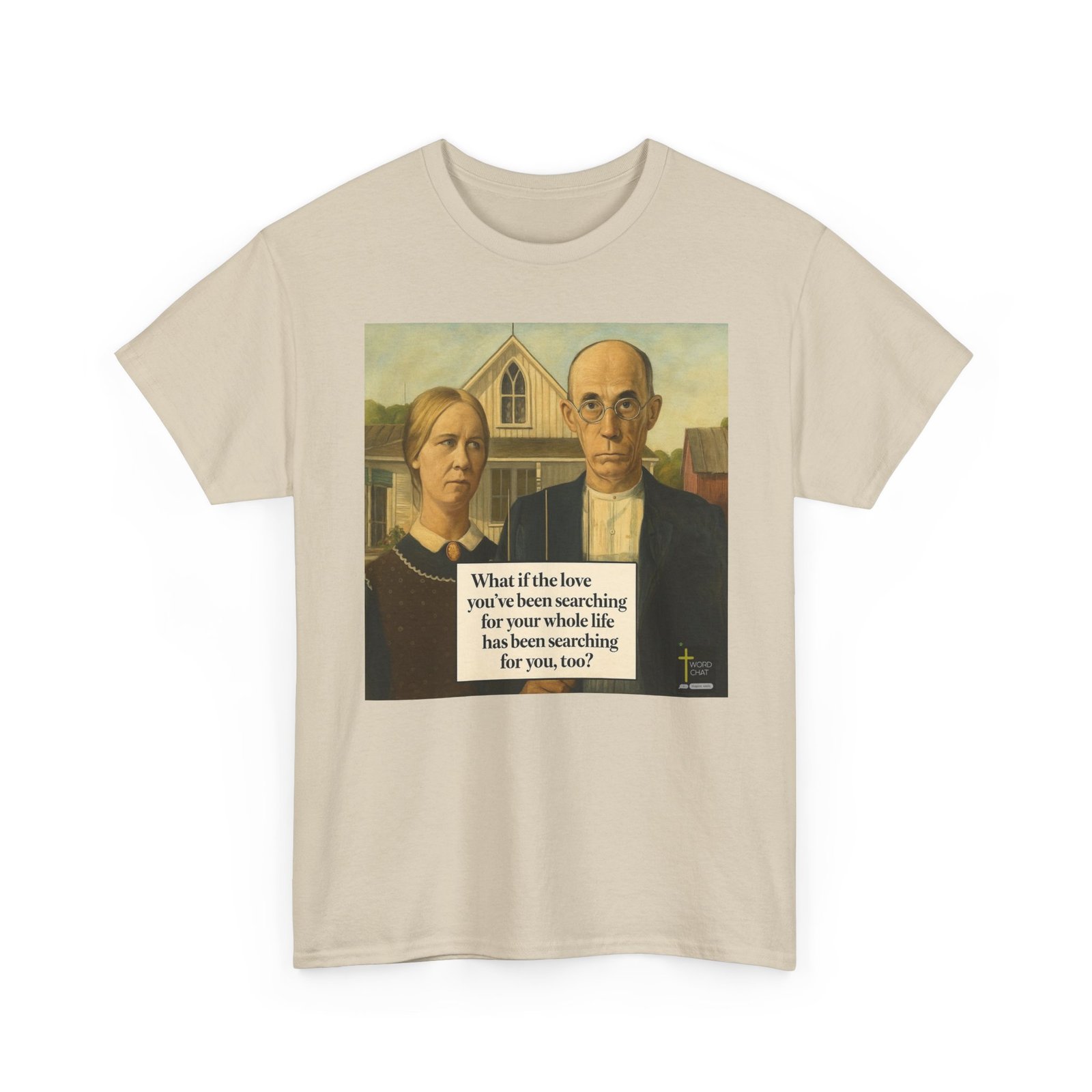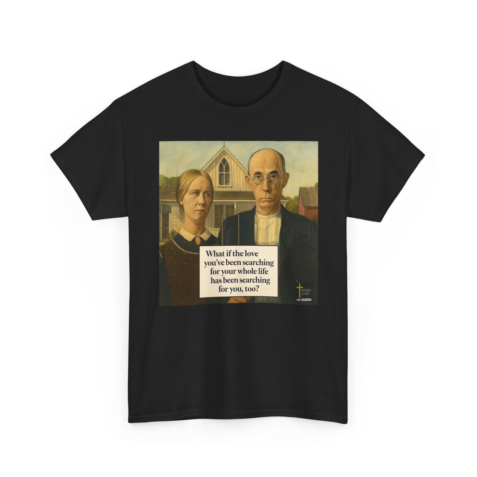 This image features a classic American Gothic-style painting depicting two solemn figures—a woman and man—standing before a white wooden farmhouse with a distinctive peaked roof. The man wears round glasses and formal black attire over a white shirt, while the woman is dressed in dark clothing with a lace collar and cameo brooch, their expressions serious and introspective. Behind them stretches a rural landscape with outbuildings and trees, rendered in muted earth tones and soft, naturalistic lighting characteristic of early 20th-century American regionalist art. Overlaid on the composition is an inspirational text reading “What if the love you’ve been searching for your whole life has been searching for you, too?” in bold serif typography. The image includes a “WordChat” logo in the bottom right corner with a cross symbol.