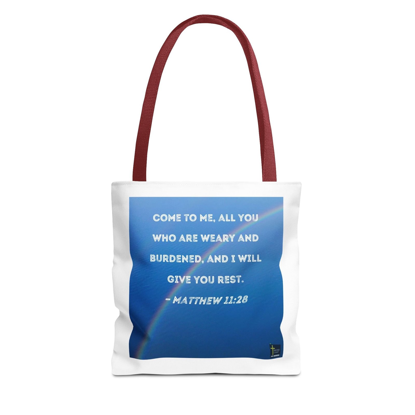 This image features a serene blue background with a vibrant rainbow arching across it, creating a calming visual backdrop for an inspirational Bible verse. The text, displayed in white, bold, uppercase letters, quotes Matthew 11:28, offering a message of comfort and hope to those feeling weary and burdened. The scripture reads: “Come to me, all you who are weary and burdened, and I will give you rest.” The design utilizes a clean, minimalist typography style that allows the powerful words to stand out against the tranquil blue and rainbow-colored background. In the bottom right corner, a small “Word Chat” logo is present, indicating the source or platform of this motivational graphic.
