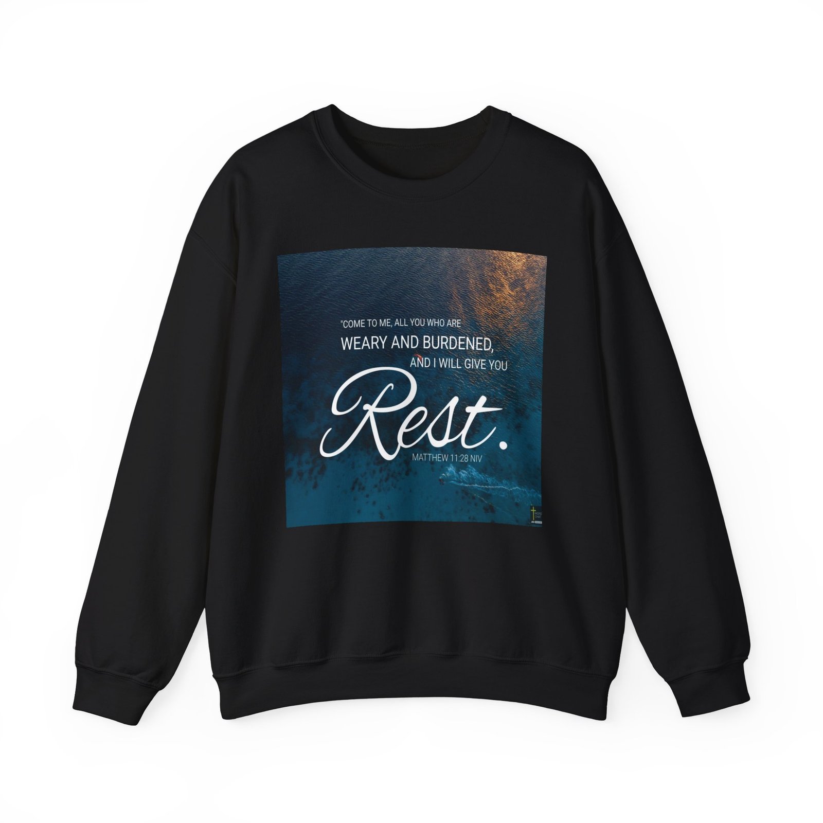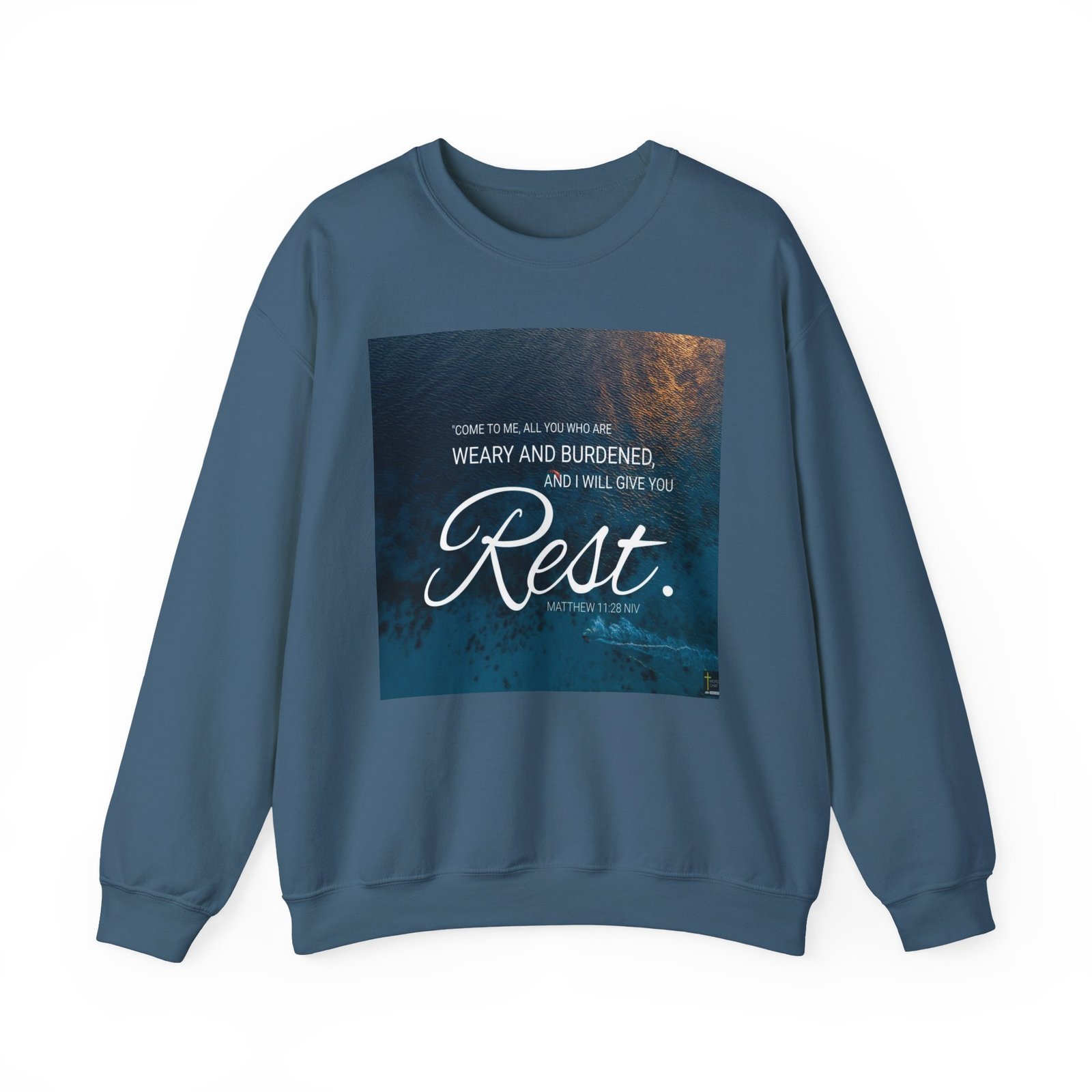This serene image features a biblical quote from Matthew 11:28 NIV, overlaid on a tranquil water background with deep blue and golden-orange tones. The scripture verse, “Come to me, all you who are weary and burdened, and I will give you Rest,” is prominently displayed in white, stylish typography against the textured water surface. The background showcases a rippled water landscape with varying shades of blue, creating a calm and reflective visual atmosphere. The image has a minimalist design approach, focusing on the powerful spiritual message and the soothing natural backdrop. A small WordChat logo is subtly placed in the bottom right corner.