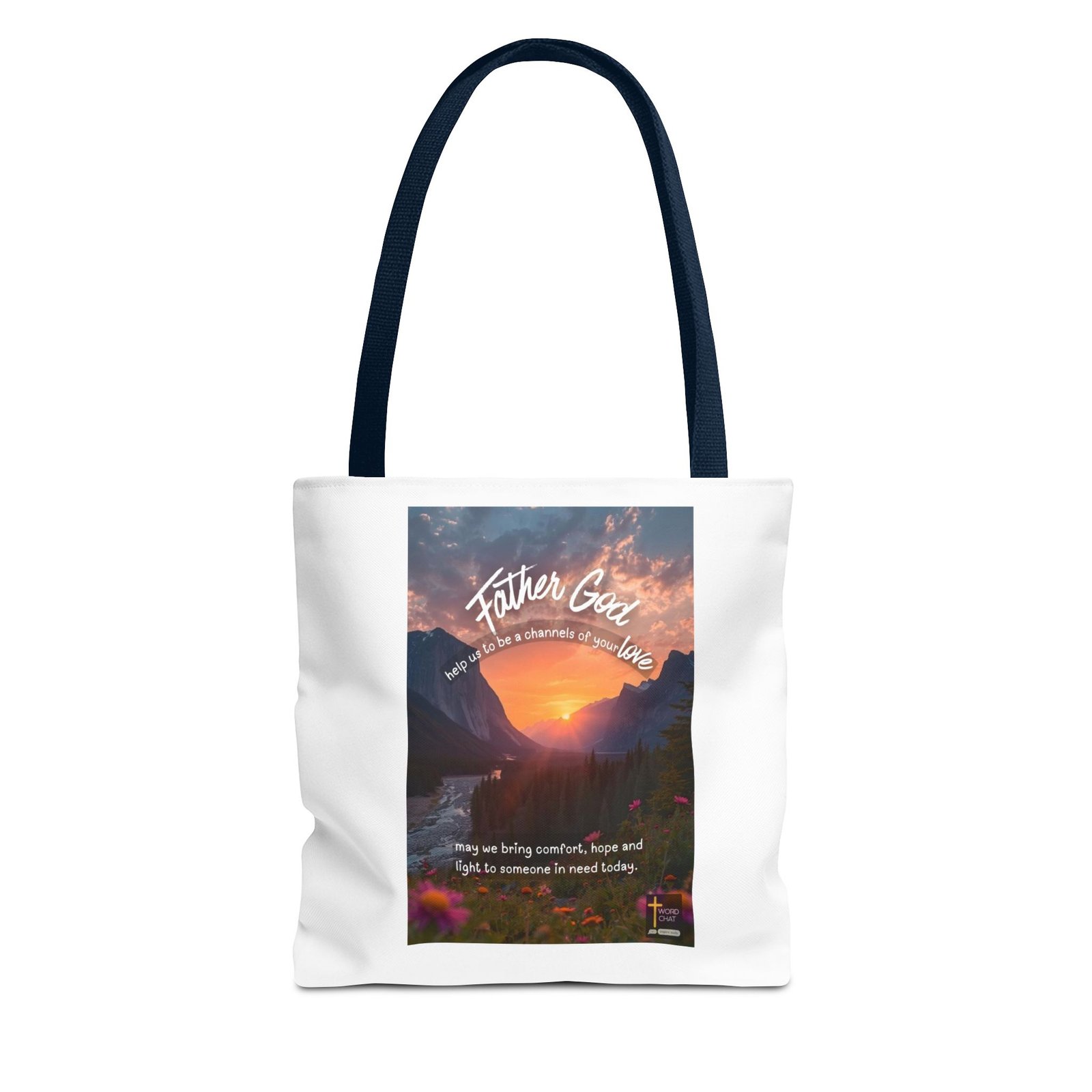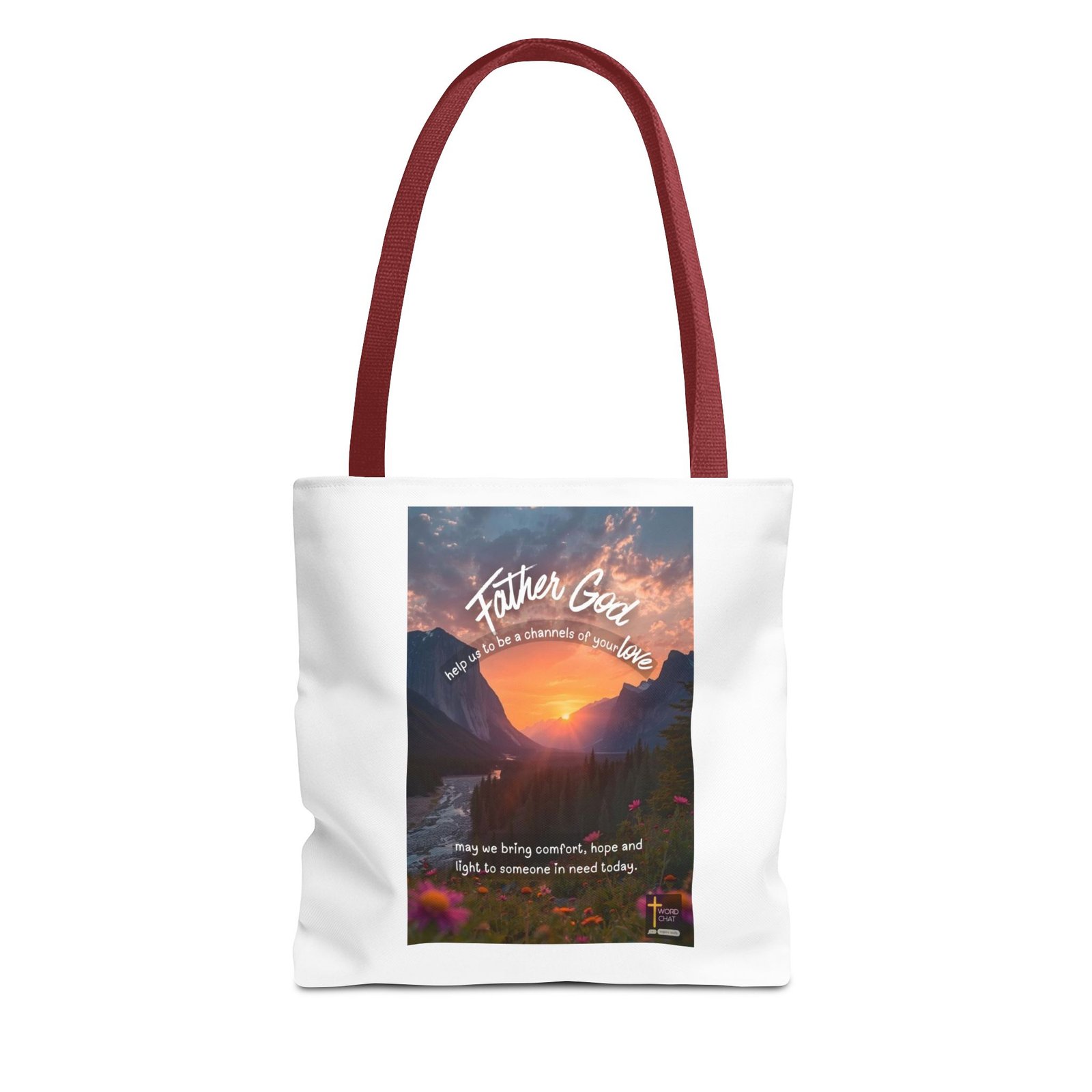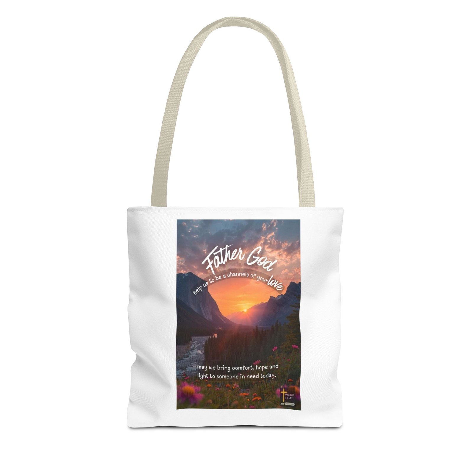 This spiritual image features a breathtaking mountain valley sunset with majestic peaks flanking a golden sun reflecting over a winding river. The composition includes white flowing text overlays reading “Father God,” “help us to be a channels of your love,” and “may we bring comfort, hope and light to someone in need today,” creating an inspirational prayer message. Colorful wildflowers in pink, orange, and purple tones bloom in the foreground, adding natural beauty and depth to the scenic landscape. Coniferous trees frame the valley, while dramatic clouds illuminate in warm hues across the sky, establishing a serene and divine atmosphere. The WordChat logo and ‘inspire souls’ tagline sit in the bottom right corner, showing the brand of this platform for finding and sharing soul stirring messages.