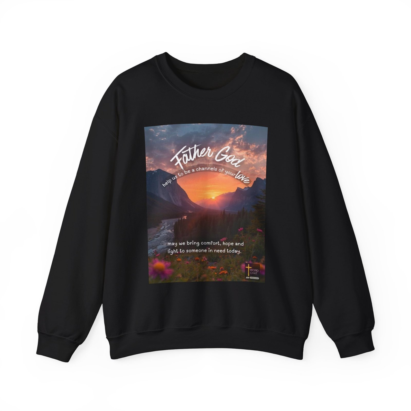 This spiritually uplifting image features a breathtaking mountain valley sunset as its backdrop, showcasing towering granite cliffs, a flowing river, and evergreen forests bathed in golden sunlight. Overlaid on the scenic landscape are white calligraphic texts reading “Father God,” “help us to be a channels of your love,” and “may we bring comfort, hope and light to someone in need today,” conveying a powerful message of faith and compassion. Vibrant pink and orange wildflowers bloom in the foreground, adding natural beauty and symbolizing growth and renewal. The image incorporates warm, glowing sunset hues that create an ethereal, peaceful atmosphere perfect for religious and motivational content. The WordChat logo and ‘inspire souls’ tagline sit in the bottom right corner, showing the brand of this platform for finding and sharing soul stirring messages.