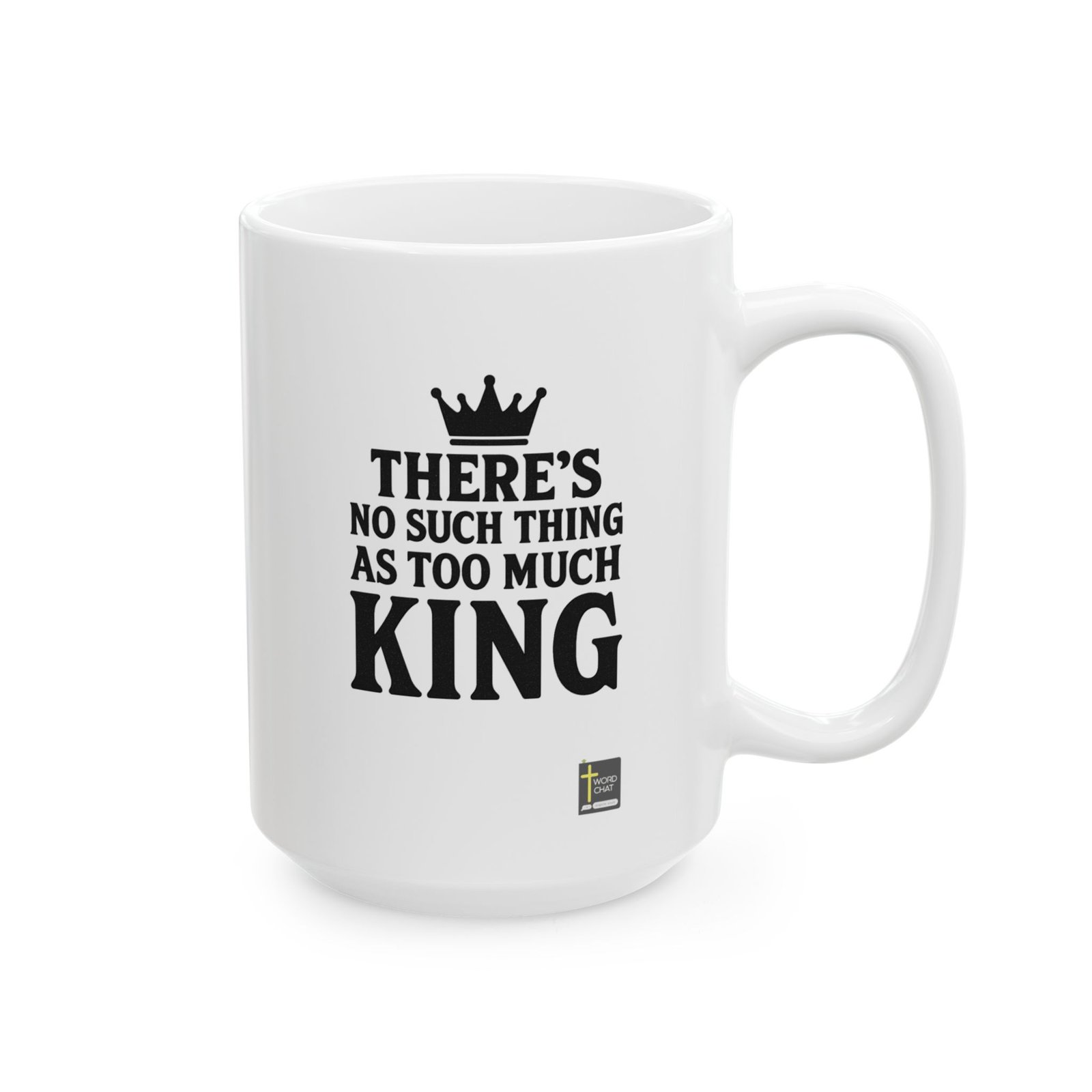 This inspirational image features gold-colored serif text centered against a dramatic celestial background of deep blue and orange clouds with radiating light beams emanating from a glowing sun at the bottom. The quote “There’s no such thing as too much King!” references a biblical or religious context, emphasizing devotion and abundance in faith. The artistic composition uses divine imagery with sunburst effects and cloud formations to create an uplifting, spiritual atmosphere that reinforces the message of the text. A small “WordChat” logo with a cross symbol appears in the bottom right corner. The overall design style combines spiritual iconography with modern graphic design to create an emotionally resonant motivational image suitable for sharing on social media or digital platforms.