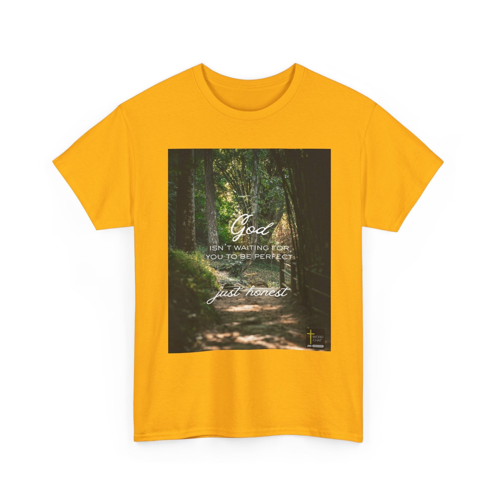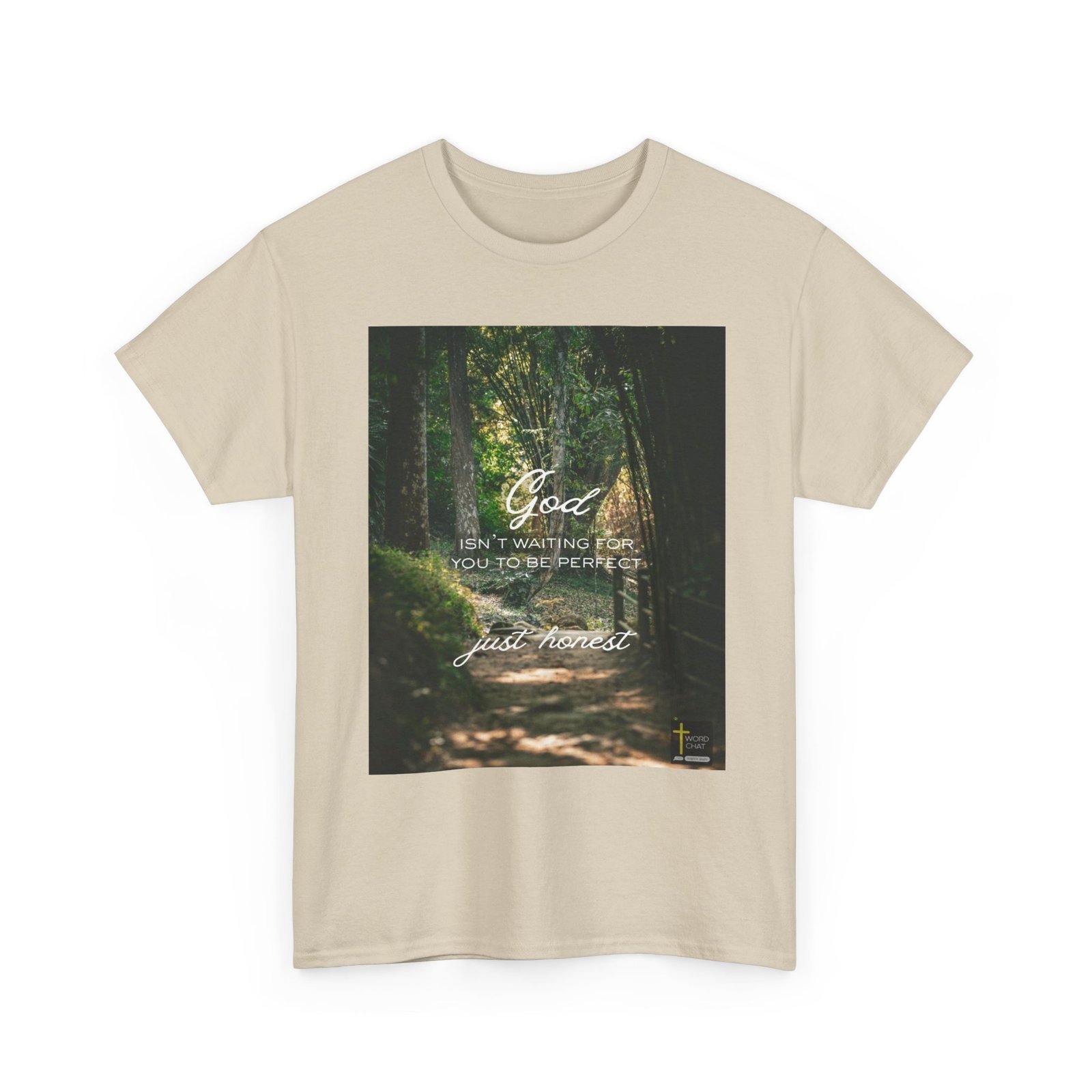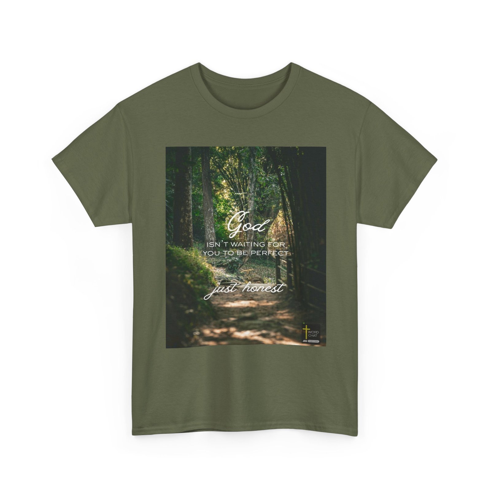 This serene forest pathway image features a scenic tree-lined tunnel with dappled sunlight filtering through lush green canopy overhead, creating a peaceful woodland atmosphere. Overlaid on the natural landscape are white calligraphy-style text messages reading “God ISN’T WAITING FOR YOU TO BE PERFECT” and “just honest,” conveying an uplifting spiritual message. The image captures a winding dirt path bordered by tall trees with moss-covered trunks and verdant foliage, enhanced with warm, golden lighting that creates depth and tranquility. A small WordChat logo with a yellow cross appears in the bottom right corner, indicating this is a Christian-based inspirational graphic. The composition blends nature photography with motivational typography, making it ideal for religious social media content, spiritual guidance materials, and encouraging wellness messages.