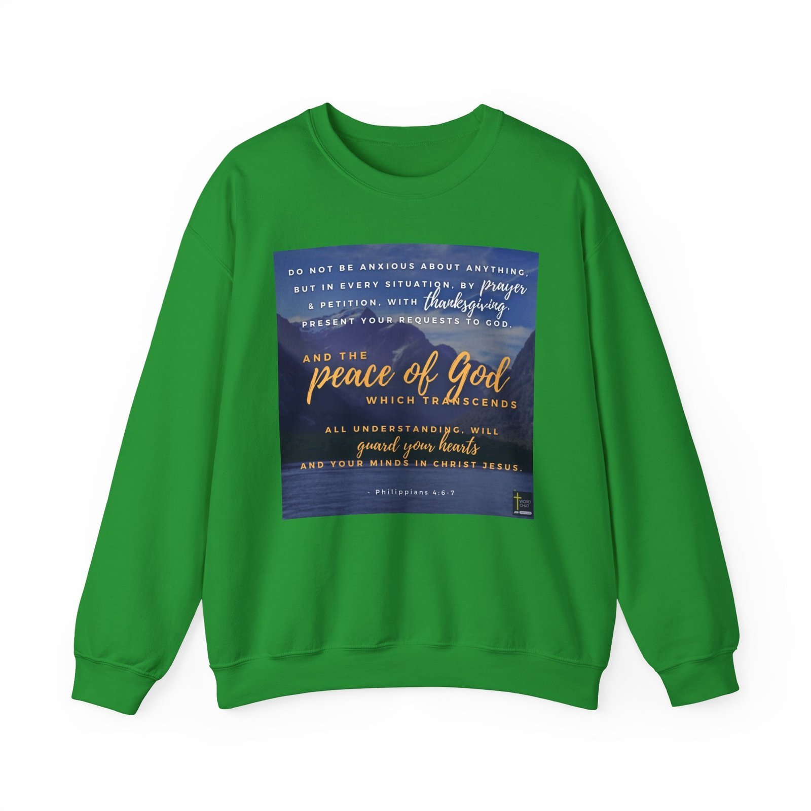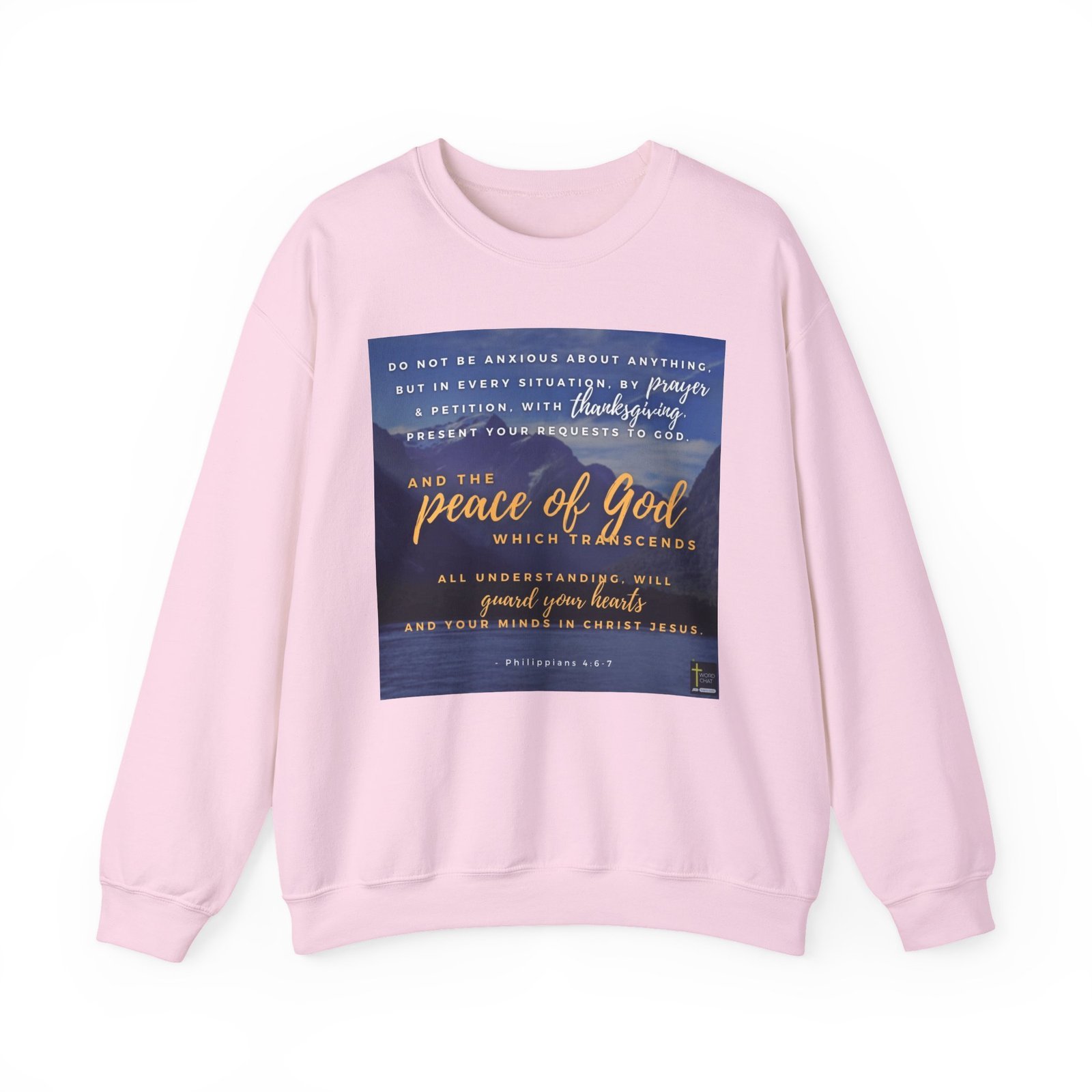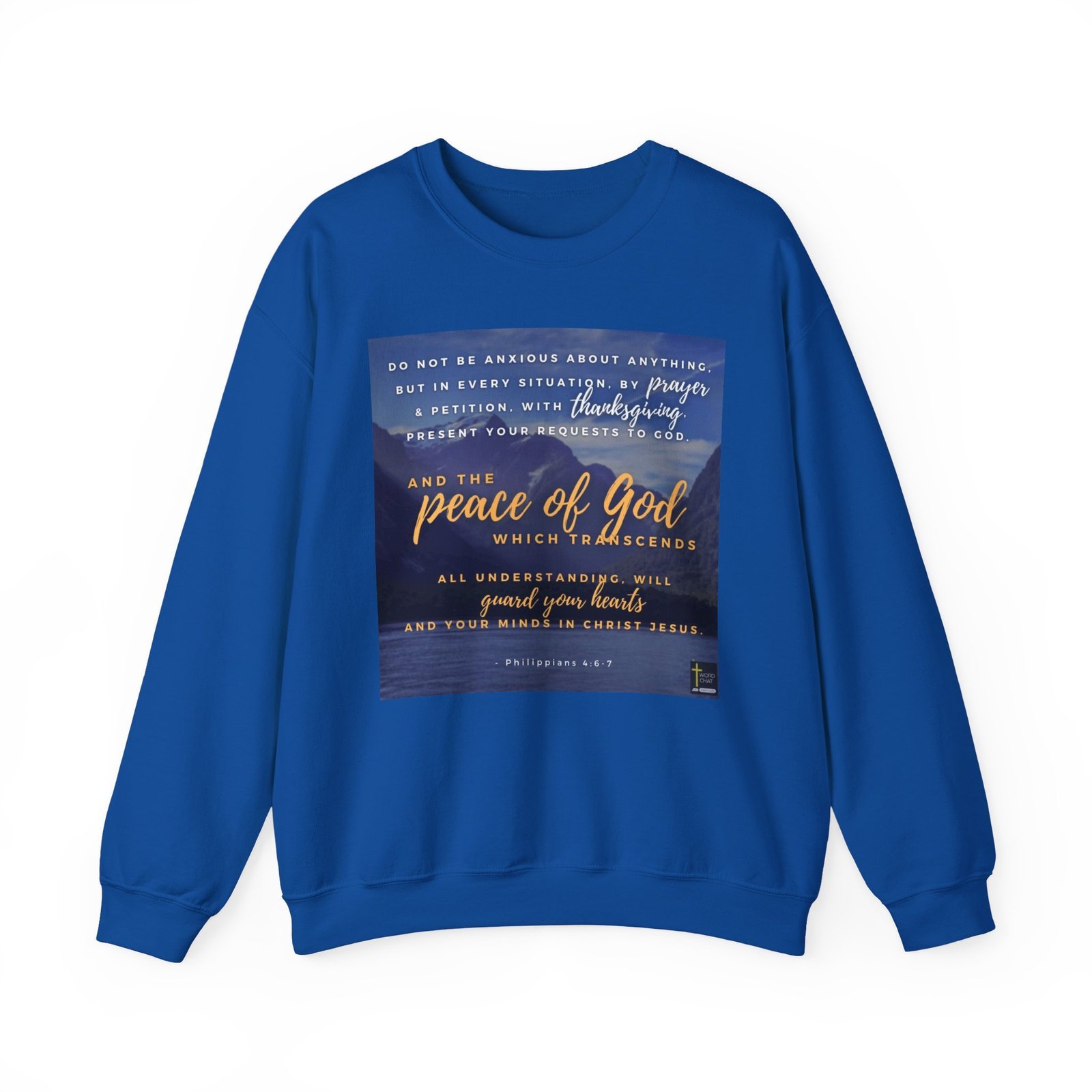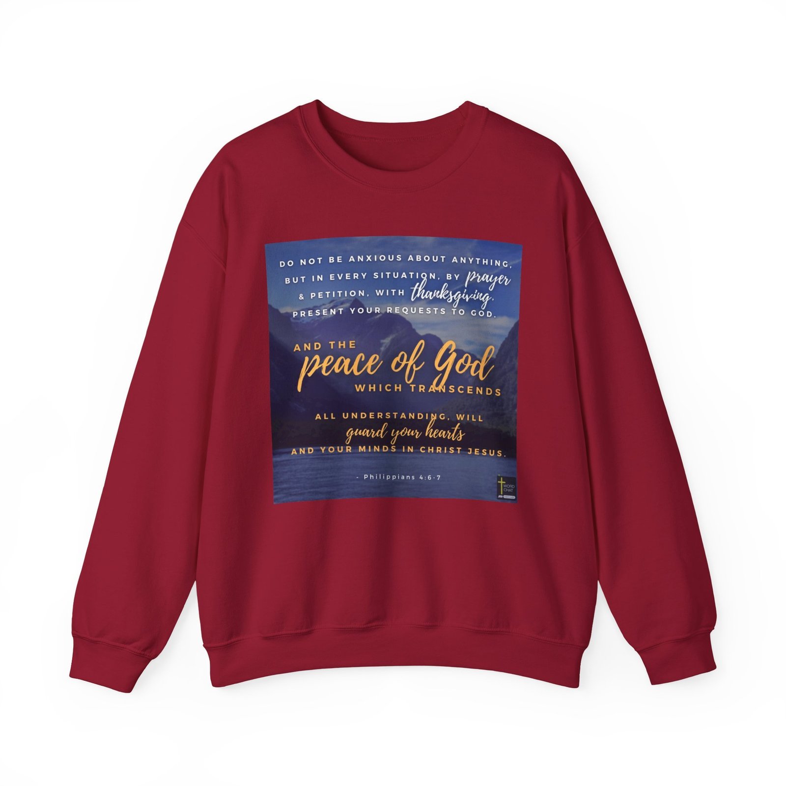 This inspiring image features a Biblical scripture quote from Philippians 4:6-7 set against a serene mountain and water landscape background. The text is displayed in white and golden-yellow typography, with the main message encouraging believers to replace anxiety with prayer, thanksgiving, and petition to God. The background shows a dramatic mountainous scene with steep rocky peaks and a calm blue body of water, creating a peaceful and contemplative visual atmosphere. The scripture emphasizes the promise of God’s peace that “transcends all understanding” and promises to guard hearts and minds in Christ Jesus. The image is designed with a clean, modern graphic style and includes a “Word Chat” logo in the bottom right corner.