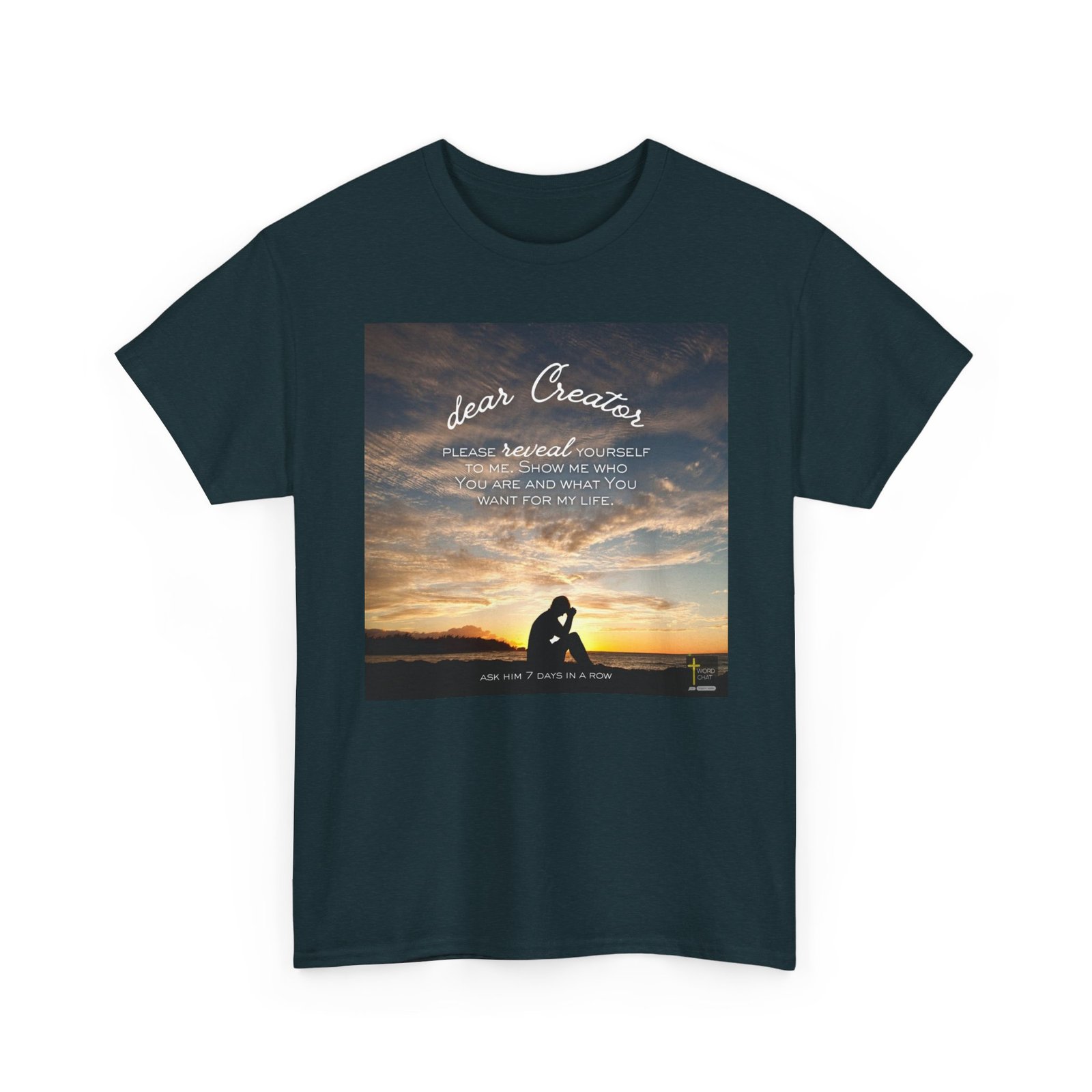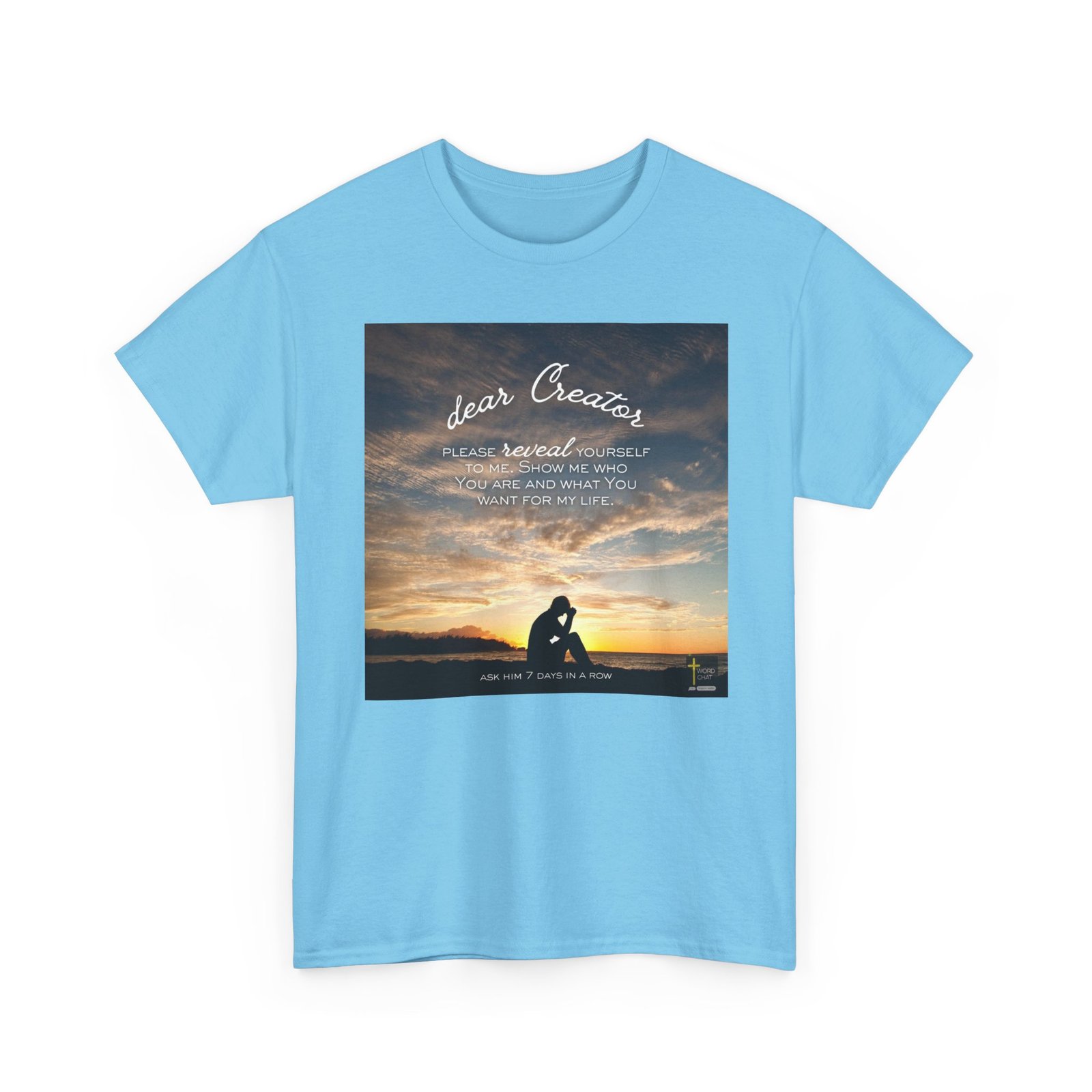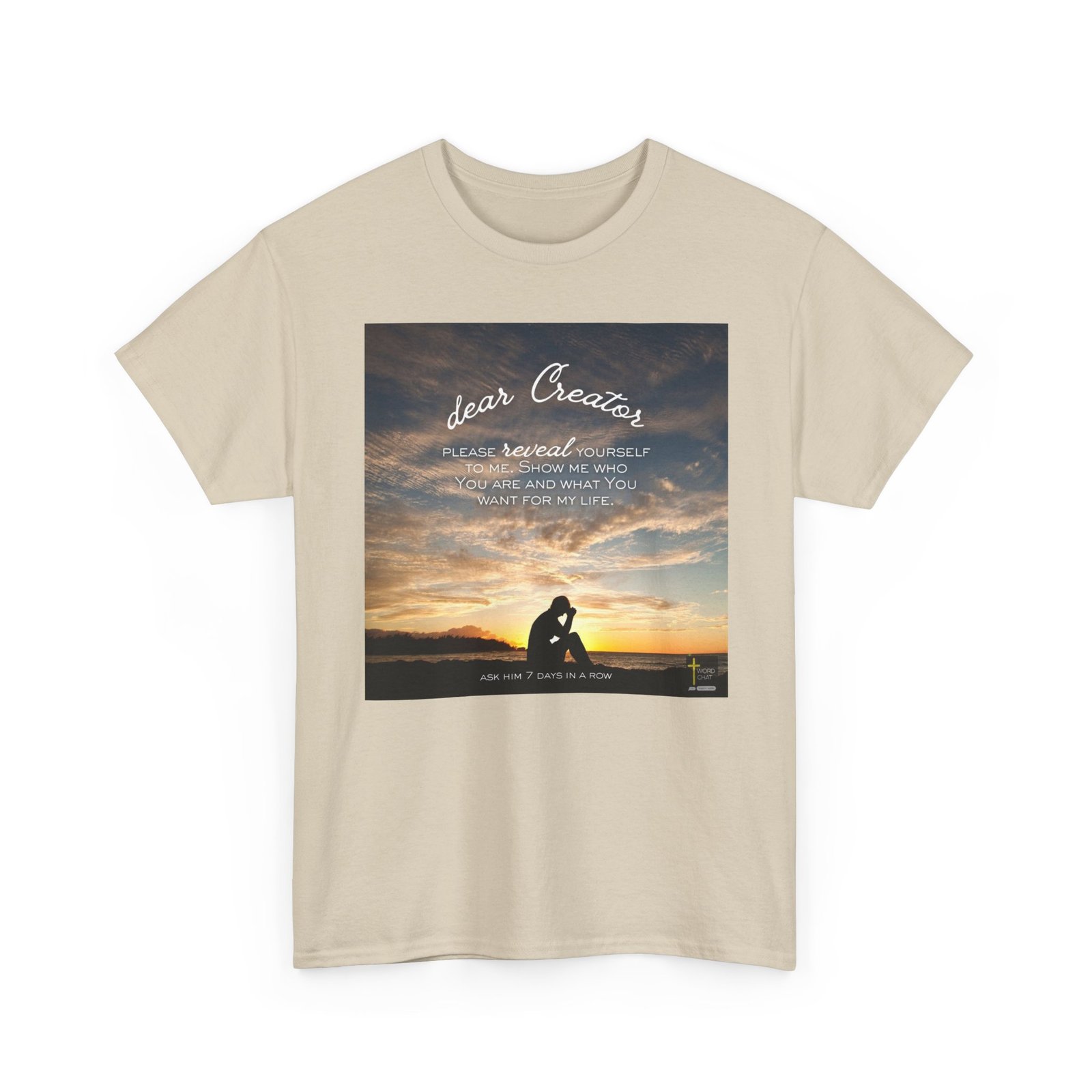 This inspirational image features a silhouetted figure in a contemplative prayer pose sitting on a beach at sunset, gazing toward a golden and orange sky. The photograph uses a dramatic natural backdrop with warm, glowing clouds reflecting over calm ocean waters, creating a serene spiritual atmosphere. Overlaid on the image is white script and sans-serif text reading “dear Creator, please reveal yourself to me. Show me who you are and what You want for my life,” followed by “Ask him 7 days in a row” at the bottom. The composition combines faith-based messaging with peaceful landscape photography, emphasizing themes of prayer, spiritual seeking, and divine connection. The WordChat logo and ‘inspire souls’ tagline sit in the bottom right corner, showing the brand of this platform for finding and sharing soul stirring messages.