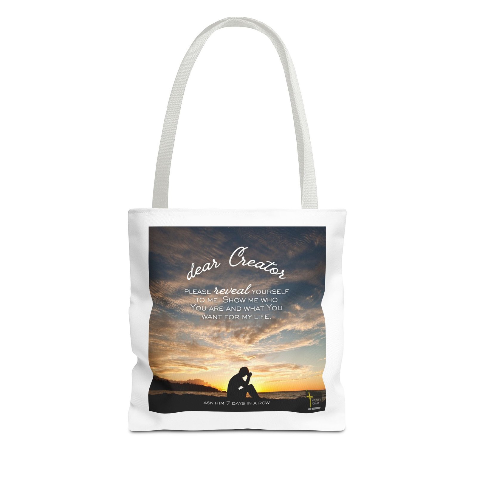 This inspirational religious image features a silhouetted figure in a prayer pose sitting on a beach during a golden sunset, creating a contemplative and peaceful atmosphere. The text overlay reads “dear Creator, PLEASE reveal YOURSELF to me. Show me who you are and what you want for my life,” expressing a heartfelt spiritual petition. The composition uses warm golden and orange tones from the sunset sky with wispy clouds, along with dark water and sandy beach elements that enhance the meditative mood. At the bottom, the call-to-action states “ASK HIM 7 DAYS IN A ROW,” with the WordChat logo and ‘inspire souls’ tagline sit in the right corner, showing the brand of this platform for finding and sharing soul stirring messages. The image combines serene landscape photography with elegant white typography to deliver an emotional spiritual message promoting prayer and divine connection.