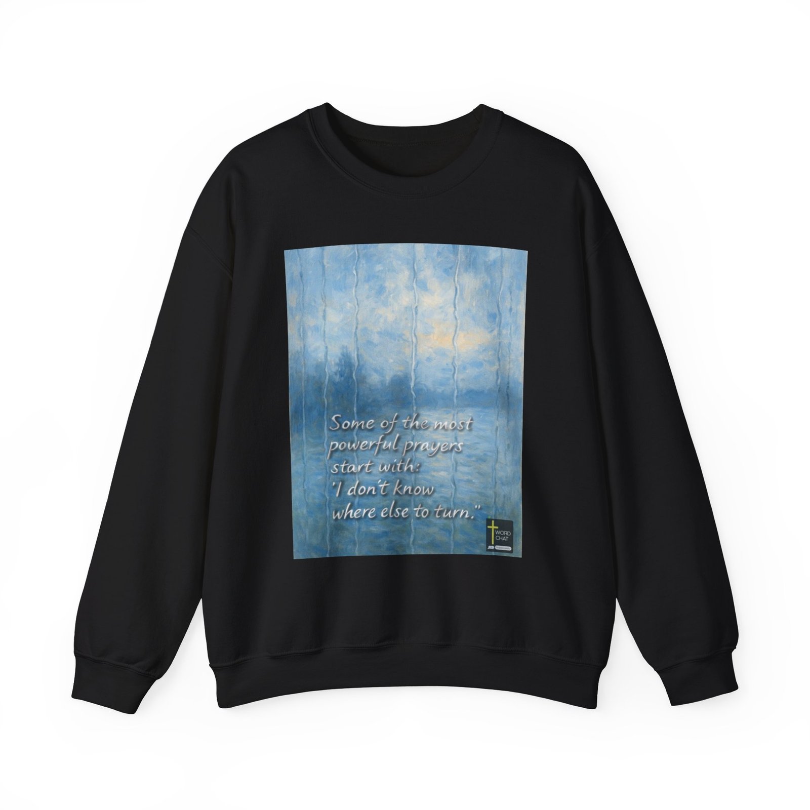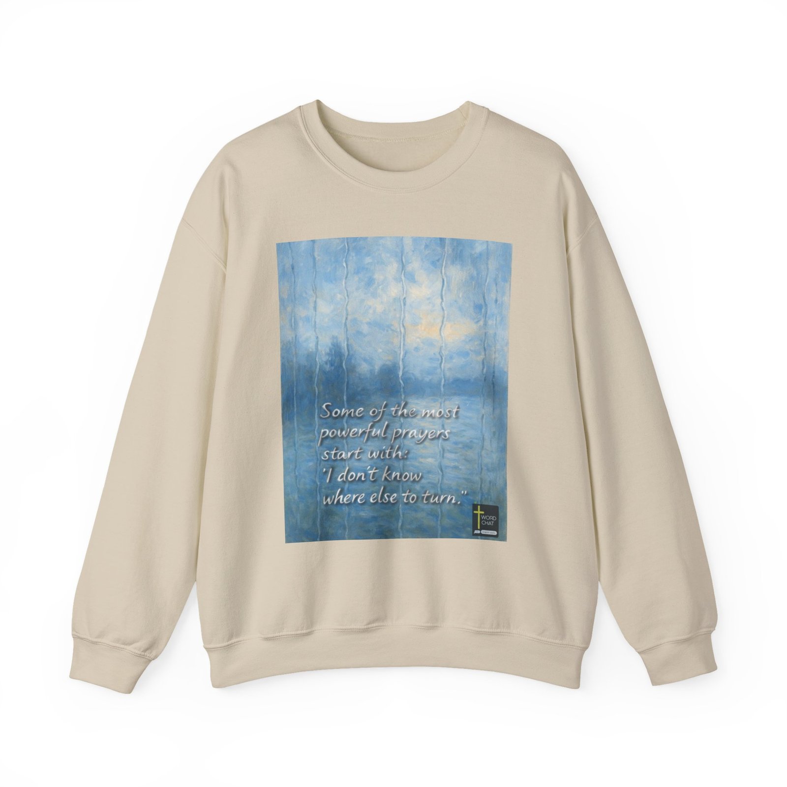 This image features a contemplative quote about prayer displayed over a serene, impressionistic landscape painting in soft blue and white tones. The text reads “Some of the most powerful prayers start with: ‘I don’t know where else to turn,'” conveying a message of faith and vulnerability. The background artwork depicts a misty forest or natural scene with vertical birch trees and diffused light, creating a peaceful and spiritual atmosphere. The overall composition combines artistic imagery with motivational messaging to inspire reflection and spiritual contemplation. The WordChat logo and ‘inspire souls’ tagline sit in the bottom right corner, showing the brand of this platform for finding and sharing soul stirring messages.
