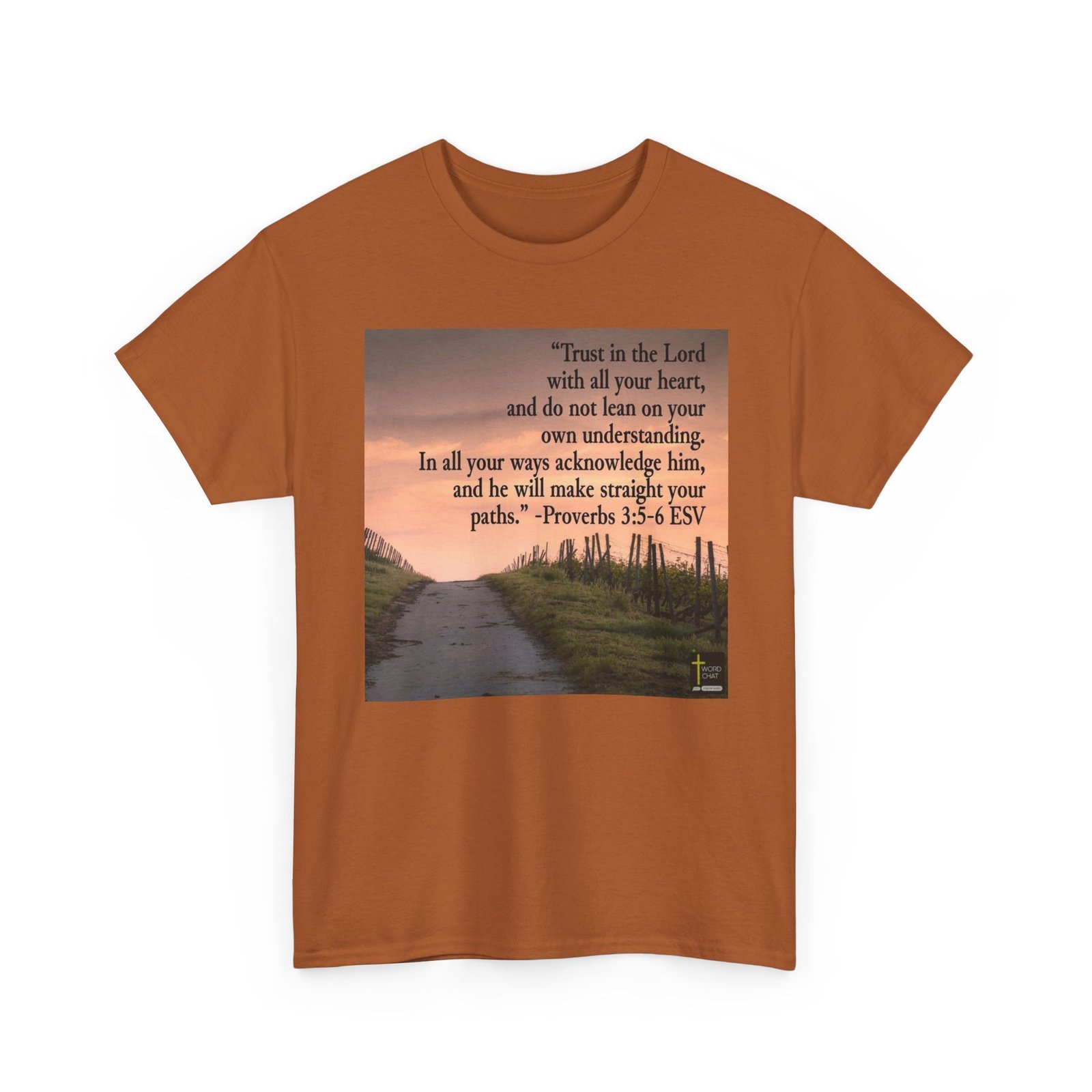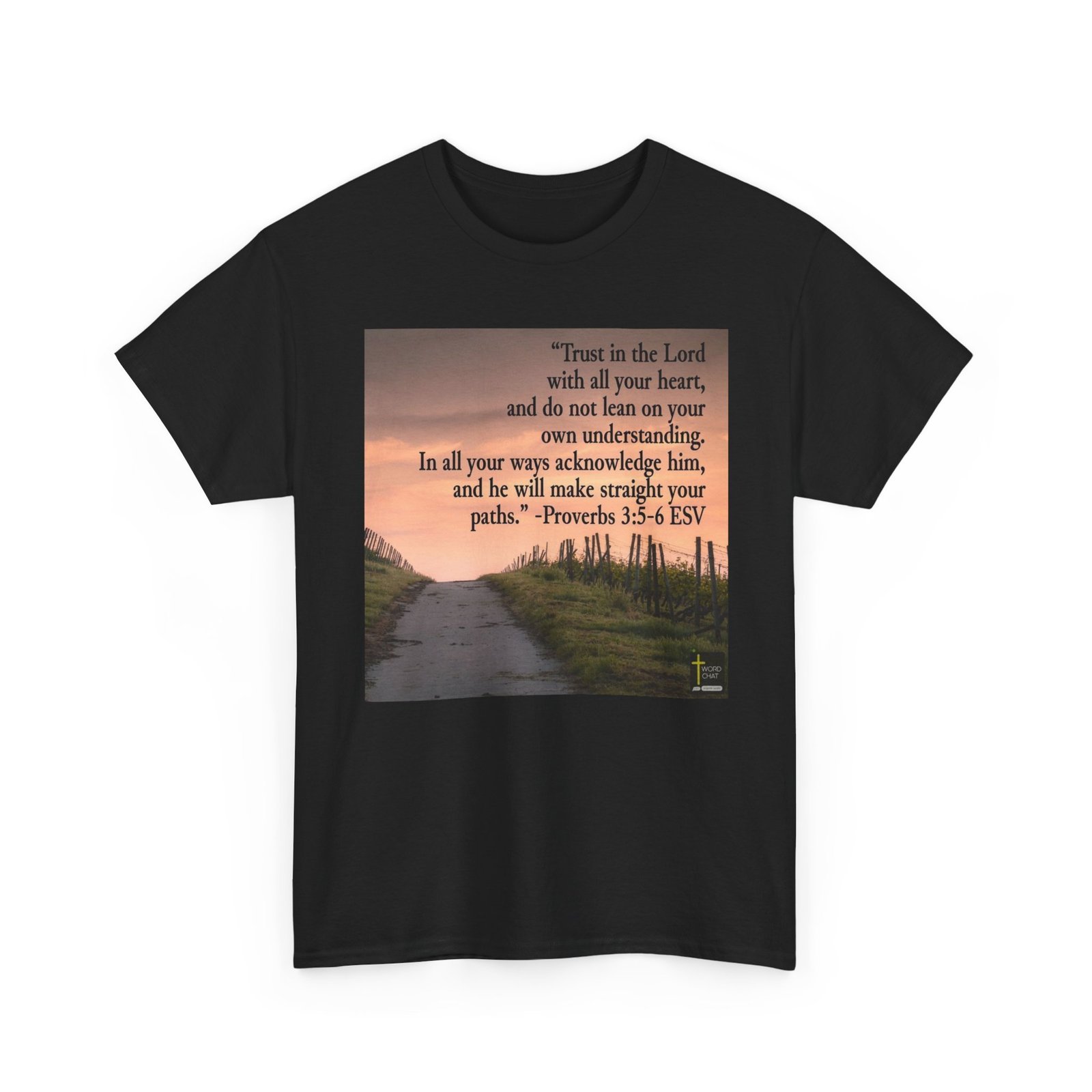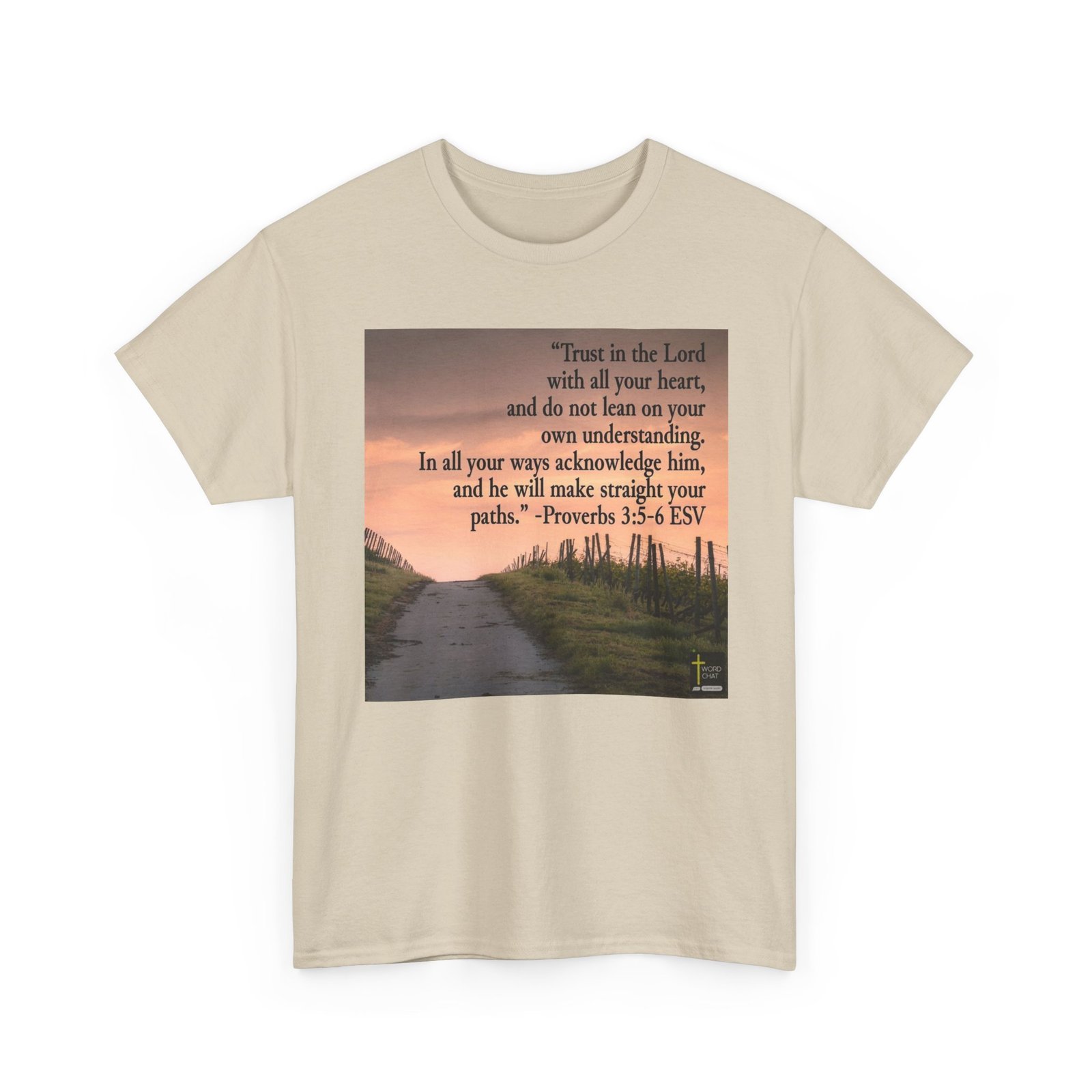 This serene image features a biblical scripture verse from Proverbs 3:5-6 in the ESV translation, overlaid on a tranquil landscape scene. The background depicts a rural dirt path winding through a grassy field with wooden fence posts lining both sides, creating a sense of guidance and direction. The sky is painted in soft, muted tones of orange and pink, suggesting a sunrise or sunset, which complements the inspirational message about trusting in divine guidance. The typography of the scripture is clean and prominent, positioned against the peaceful pastoral backdrop. The image is created by WordChat, as indicated by the logo in the bottom right corner, and uses a contemplative visual style to emphasize the spiritual message of faith and trust.
