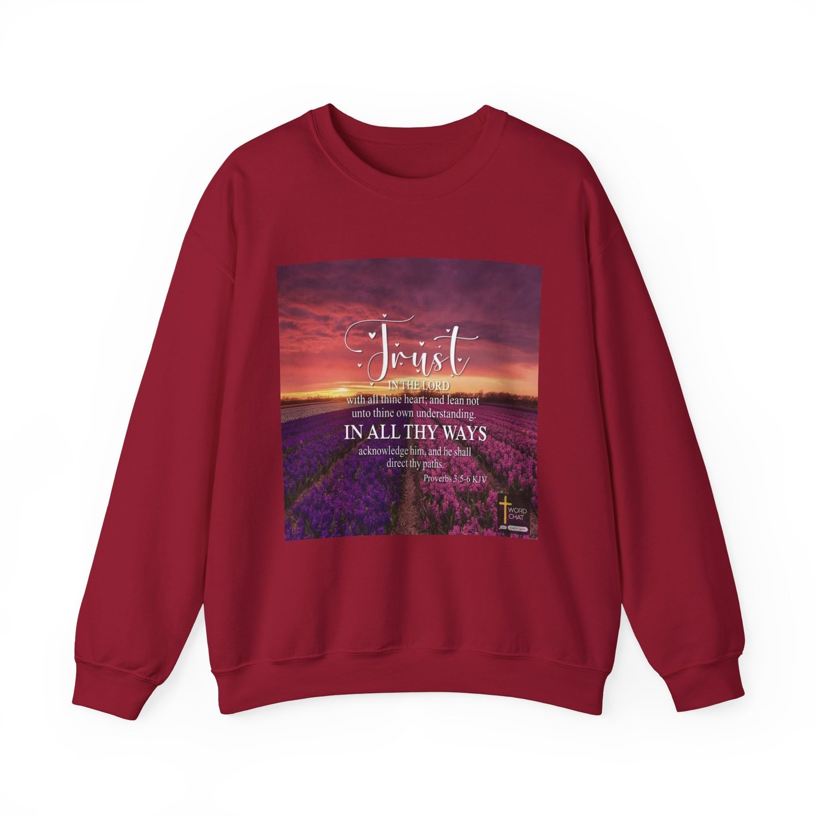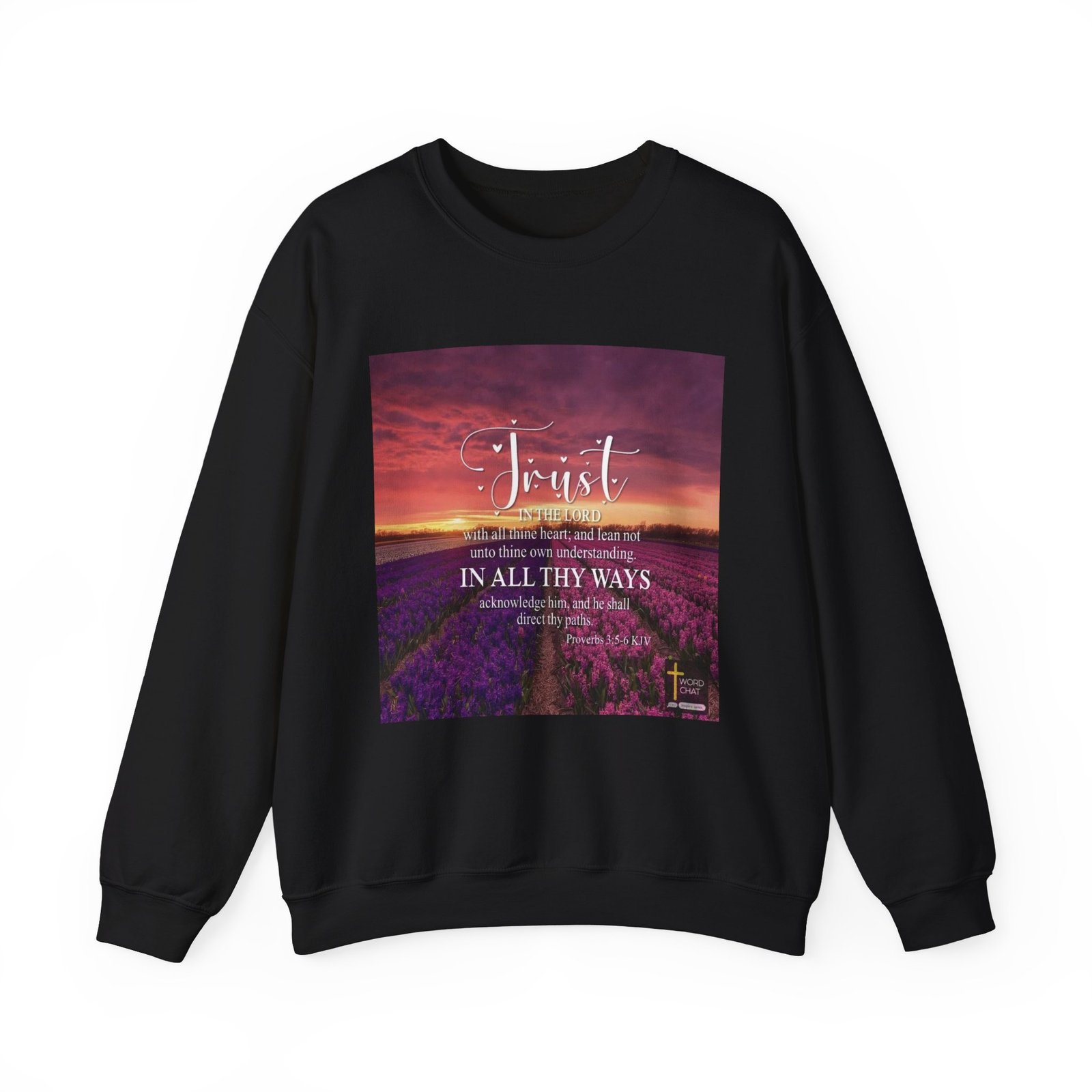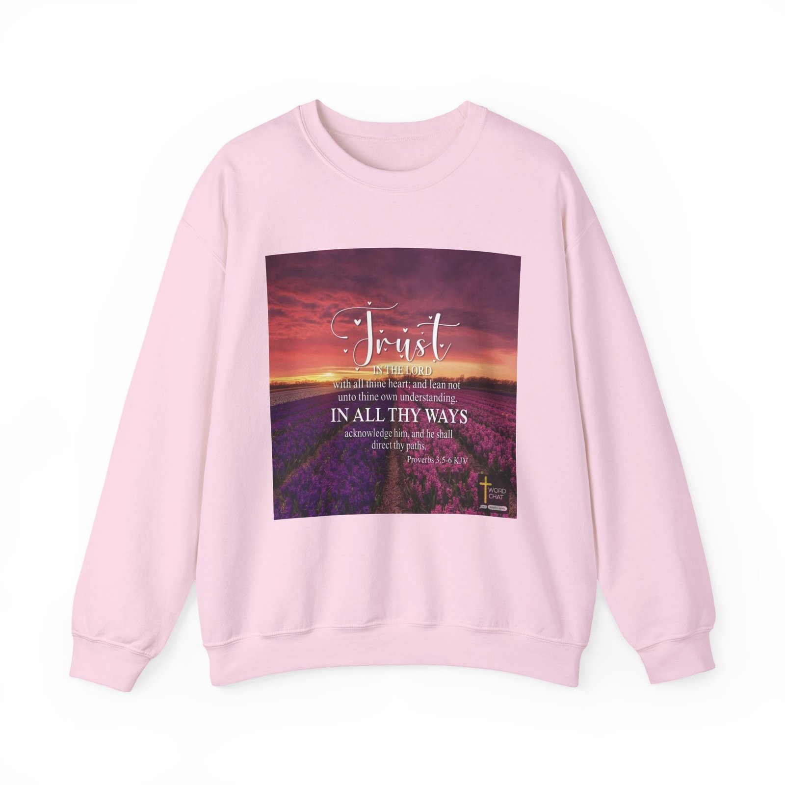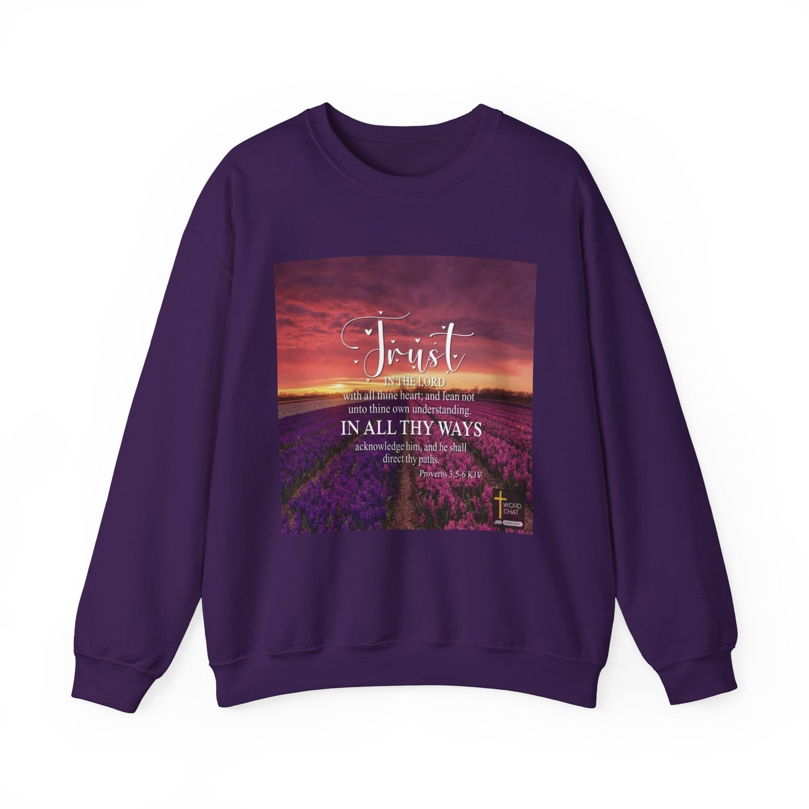 This inspirational image features a stunning landscape of a lavender field at sunset, with rows of vibrant purple flowers stretching across the foreground. Overlaid on this picturesque background is a biblical quote from Proverbs 3:5-6 in the King James Version, rendered in elegant white typography. The text encourages trust in the Lord, advising to rely on divine guidance rather than personal understanding. Small heart symbols decorate the stylized script of the word “Trust” at the top of the image. The sky is a dramatic blend of deep purple, pink, and golden hues, creating a serene and contemplative atmosphere that complements the spiritual message.