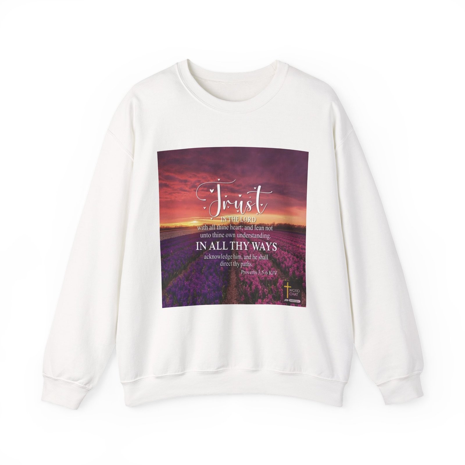 This inspirational image features a stunning landscape of a lavender field at sunset, with rows of vibrant purple flowers stretching across the foreground. Overlaid on this picturesque background is a biblical quote from Proverbs 3:5-6 in the King James Version, rendered in elegant white typography. The text encourages trust in the Lord, advising to rely on divine guidance rather than personal understanding. Small heart symbols decorate the stylized script of the word “Trust” at the top of the image. The sky is a dramatic blend of deep purple, pink, and golden hues, creating a serene and contemplative atmosphere that complements the spiritual message.