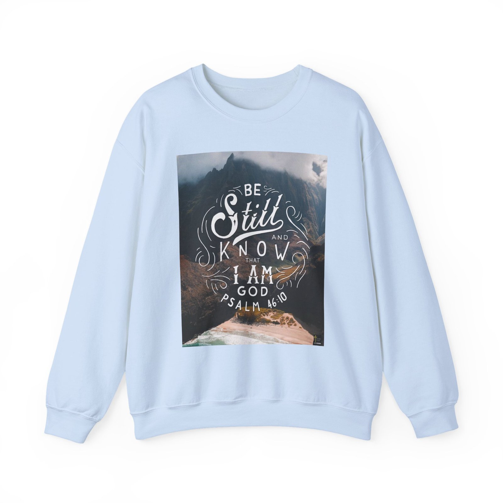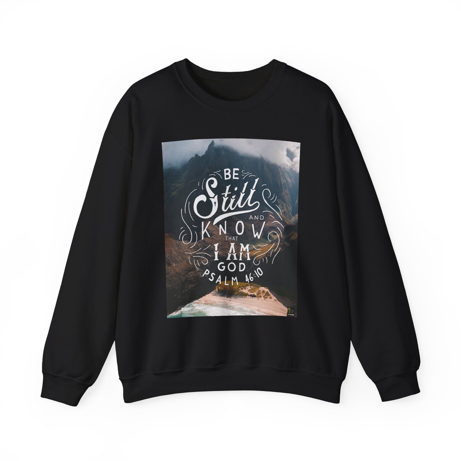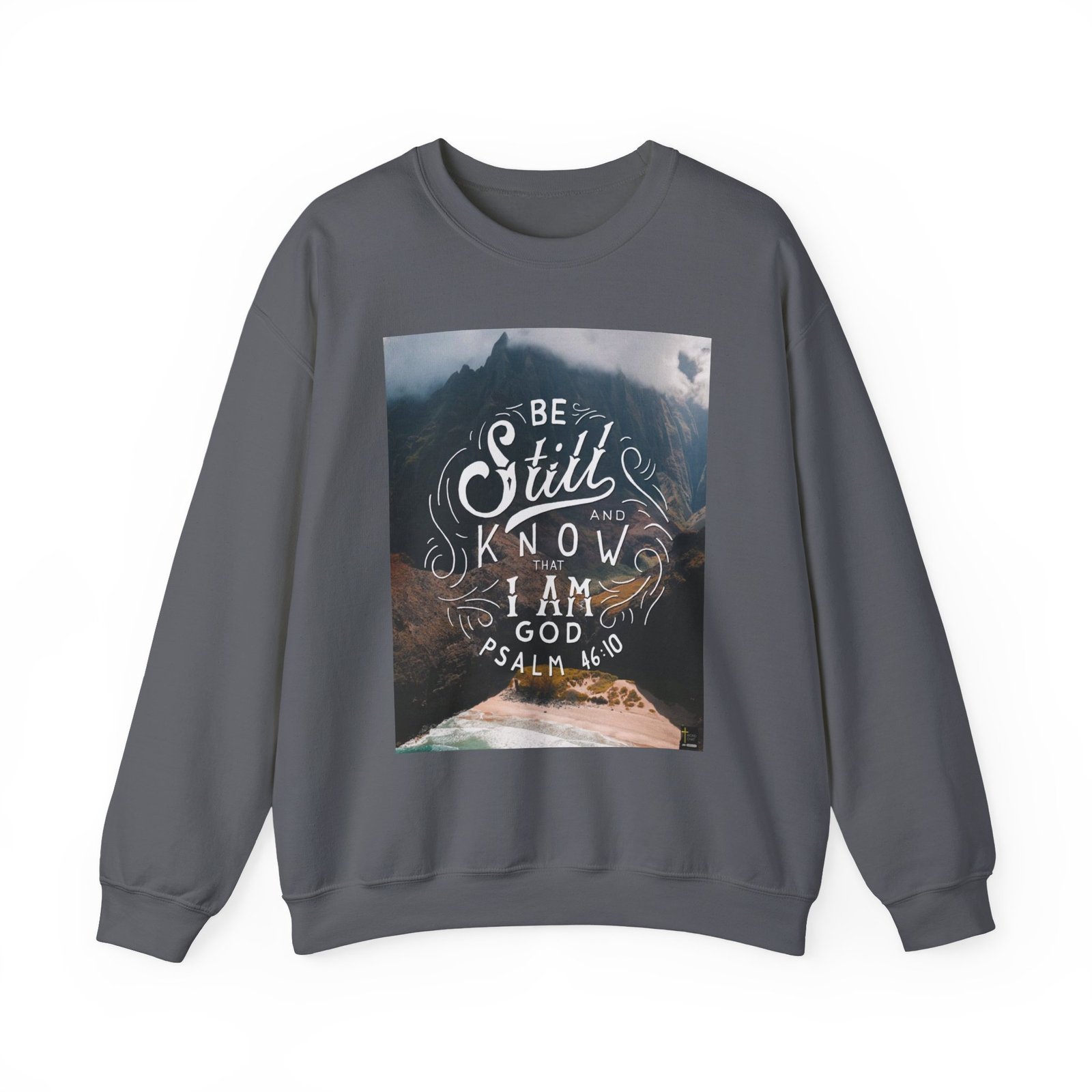The image features a powerful biblical quote from Psalm 46:10 overlaid on a stunning mountainous landscape with dramatic, misty peaks. The typography is hand-lettered in white, curving and flowing artistically across the dramatic natural background. The scene depicts a rugged coastal landscape with steep, rocky mountains partially obscured by clouds, creating a sense of majesty and tranquility. The text reads “Be Still and Know That I Am God” in an elegant, organic lettering style that complements the natural scenery. The color palette is predominantly earth tones, with dark gray mountains, golden-brown rocky terrain, and a soft sandy beach in the foreground with ocean waves.