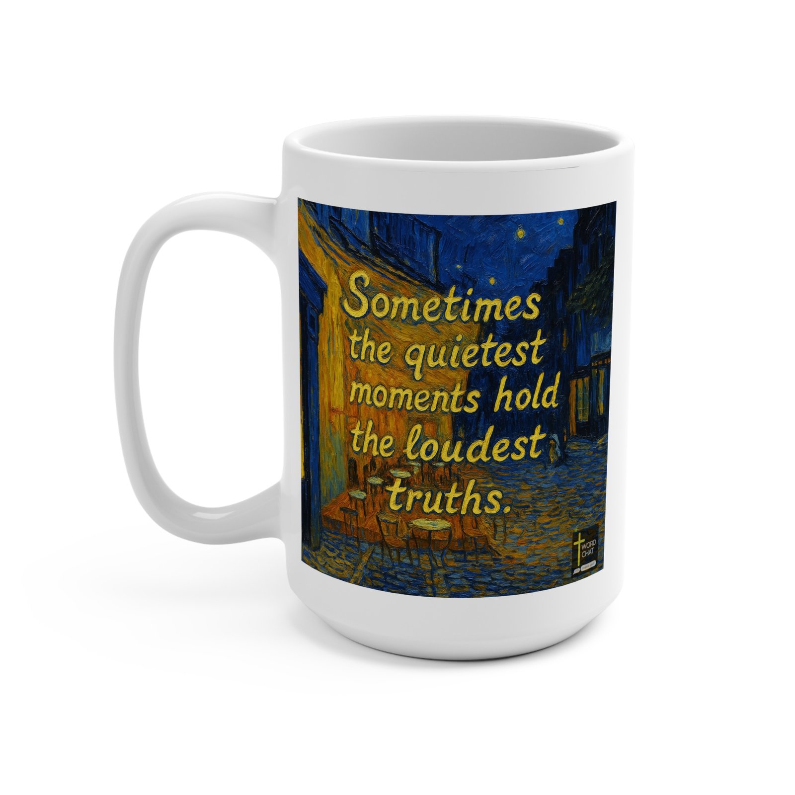 This image features an iconic nighttime café scene rendered in the distinctive Post-Impressionist style of Vincent van Gogh, characterized by bold brushstrokes and vibrant color contrasts. The composition depicts a cobblestone street lined with warm golden-yellow café tables and chairs beneath towering blue buildings, with a luminous starry sky dotted with glowing yellow stars overhead. Overlaid in elegant golden-yellow italic text is an inspirational quote reading “Sometimes the quietest moments hold the loudest truths,” which contrasts poignantly against the dynamic painted background. The artistic palette combines deep blues, rich yellows, warm oranges, and black outlines, exemplifying van Gogh’s signature emotional and expressive approach to color and form. A small “WordChat” logo with an “inspire souls” tagline appears in the bottom right corner.