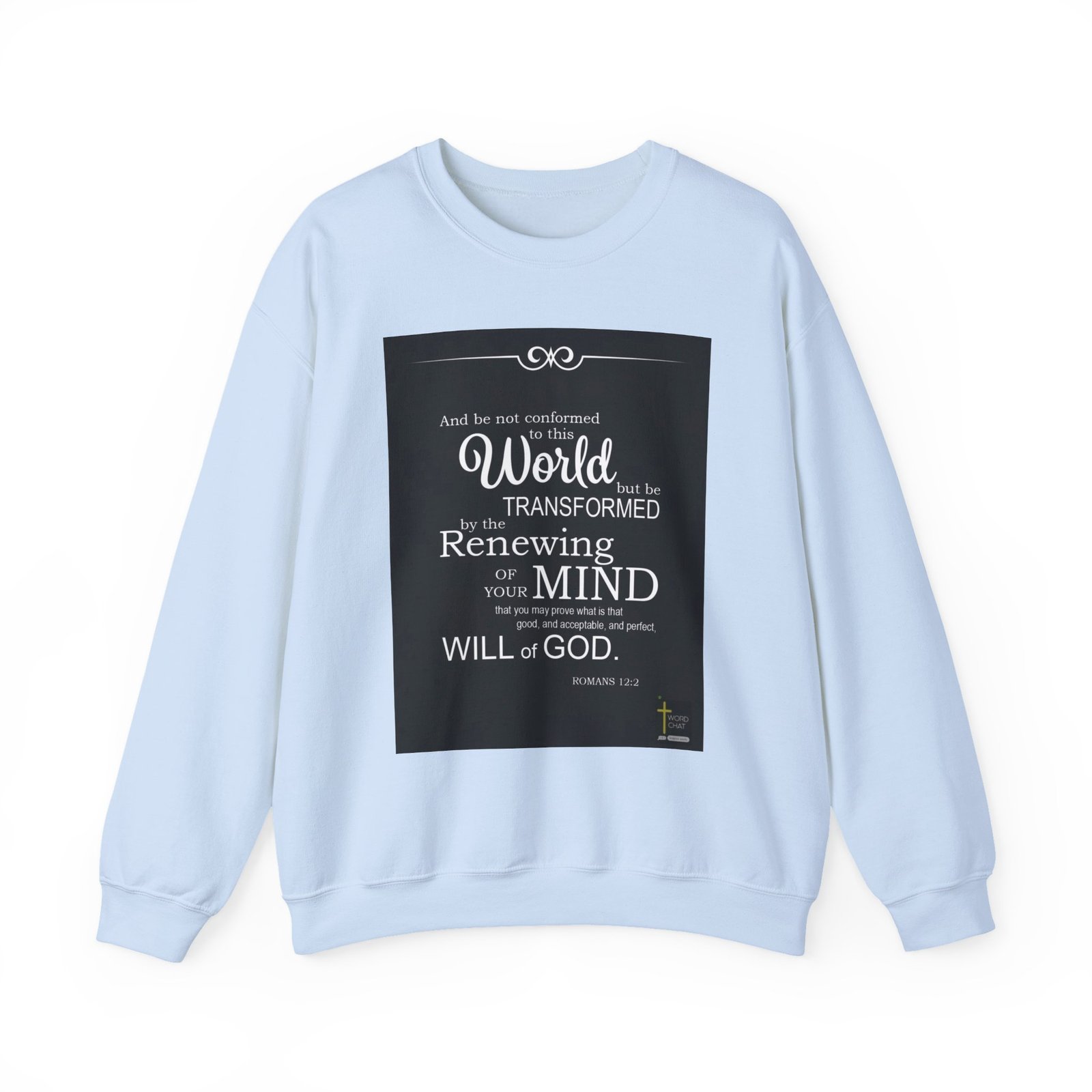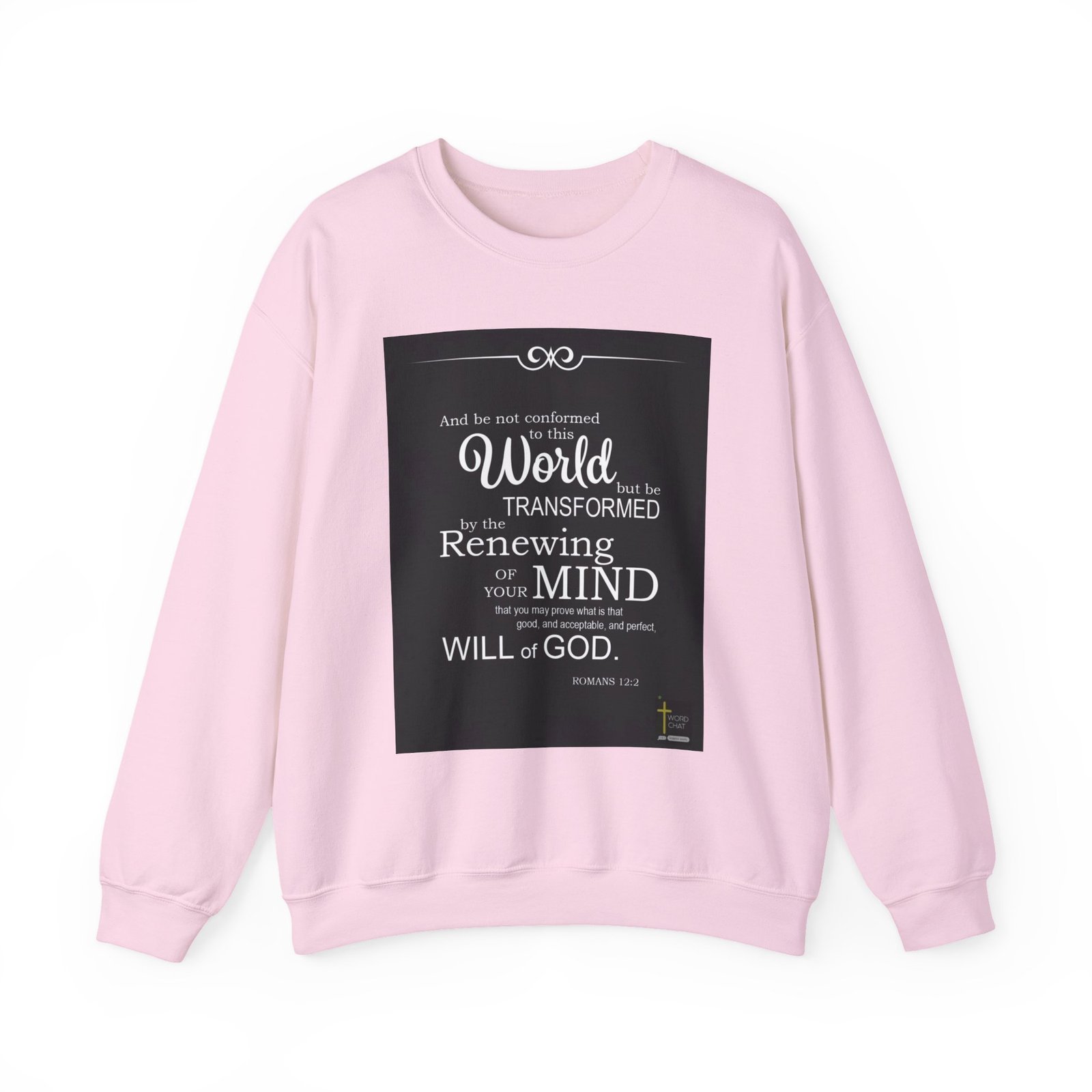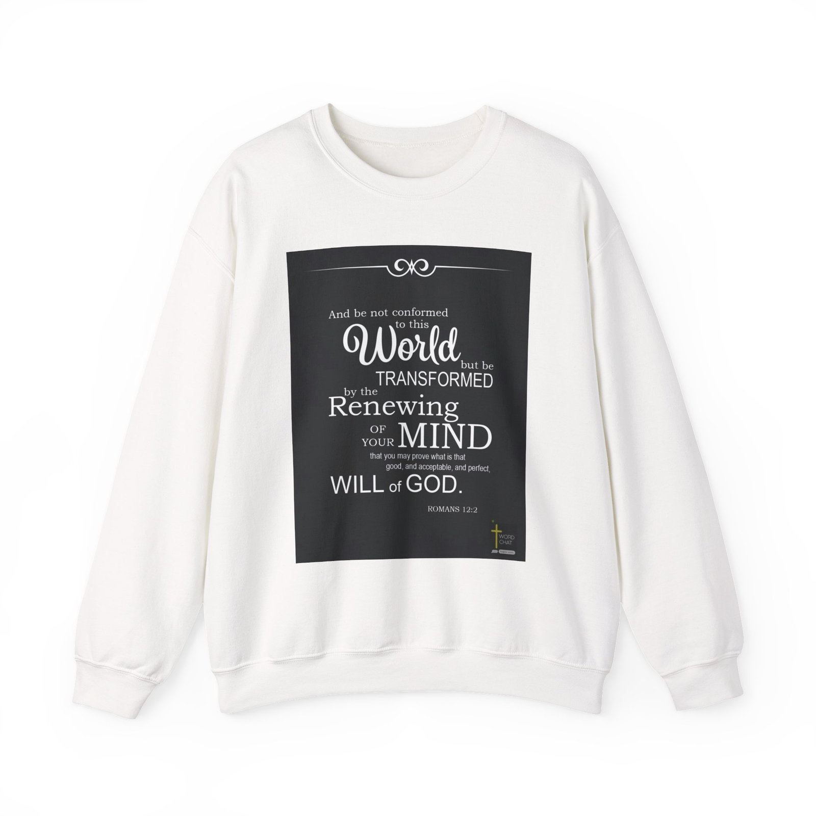 This image features a Bible verse from Romans 12:2, presented in a clean, elegant typographic design against a black background. The text is displayed in white and black fonts with decorative curly elements at the top of the image. The verse encourages believers to resist conforming to the world and instead be transformed by renewing their mind, with the ultimate goal of understanding God’s will. The typography uses varying font sizes and styles to emphasize key words like “World”, “TRANSFORMED”, and “MIND”. A small “WordChat” logo is located in the bottom right corner of the image.