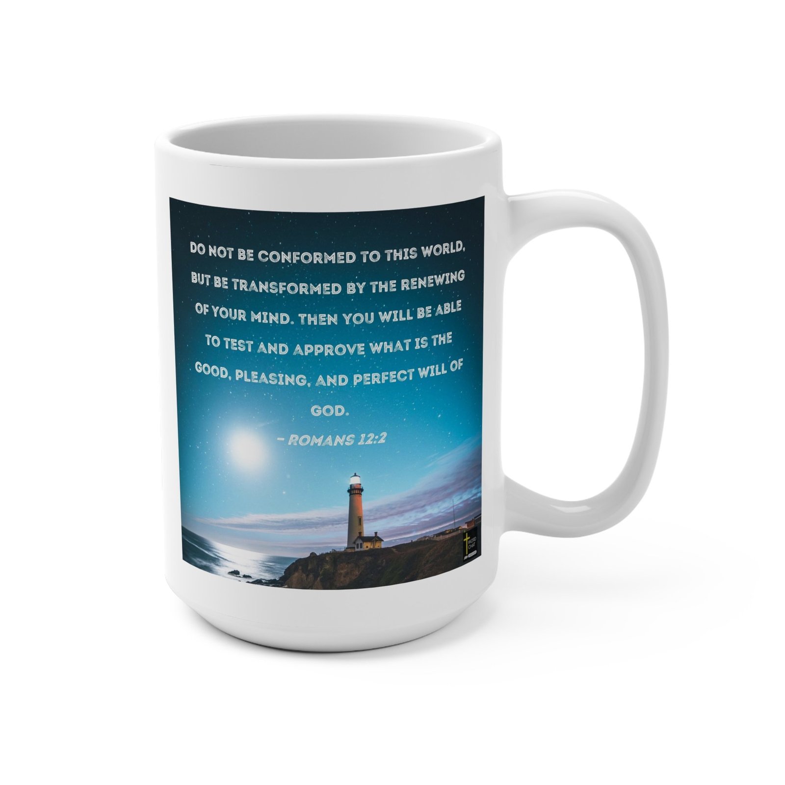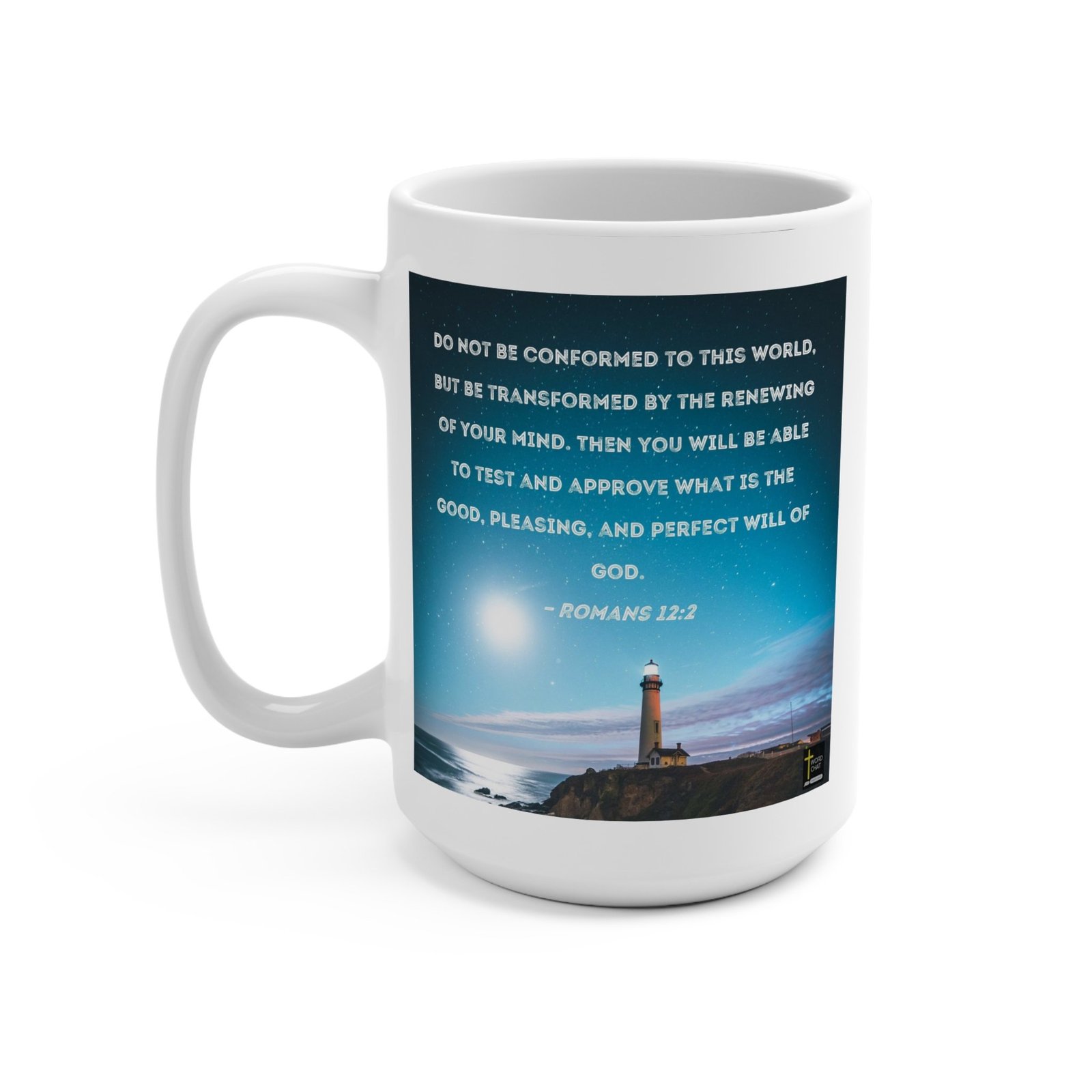 This inspirational image features a biblical quote from Romans 12:2 set against a serene coastal nighttime landscape. A majestic lighthouse stands prominently on a rocky cliff overlooking the ocean, illuminated against a starry sky with a bright moon casting a luminous glow. The text is displayed in large, white capital letters, creating a striking contrast with the deep teal and blue gradient background. The lighthouse symbolizes guidance and hope, complementing the scripture’s message about transformation and seeking God’s will. The image is designed in a motivational poster style, with a WordChat logo in the bottom right corner, creating a visually compelling spiritual message.