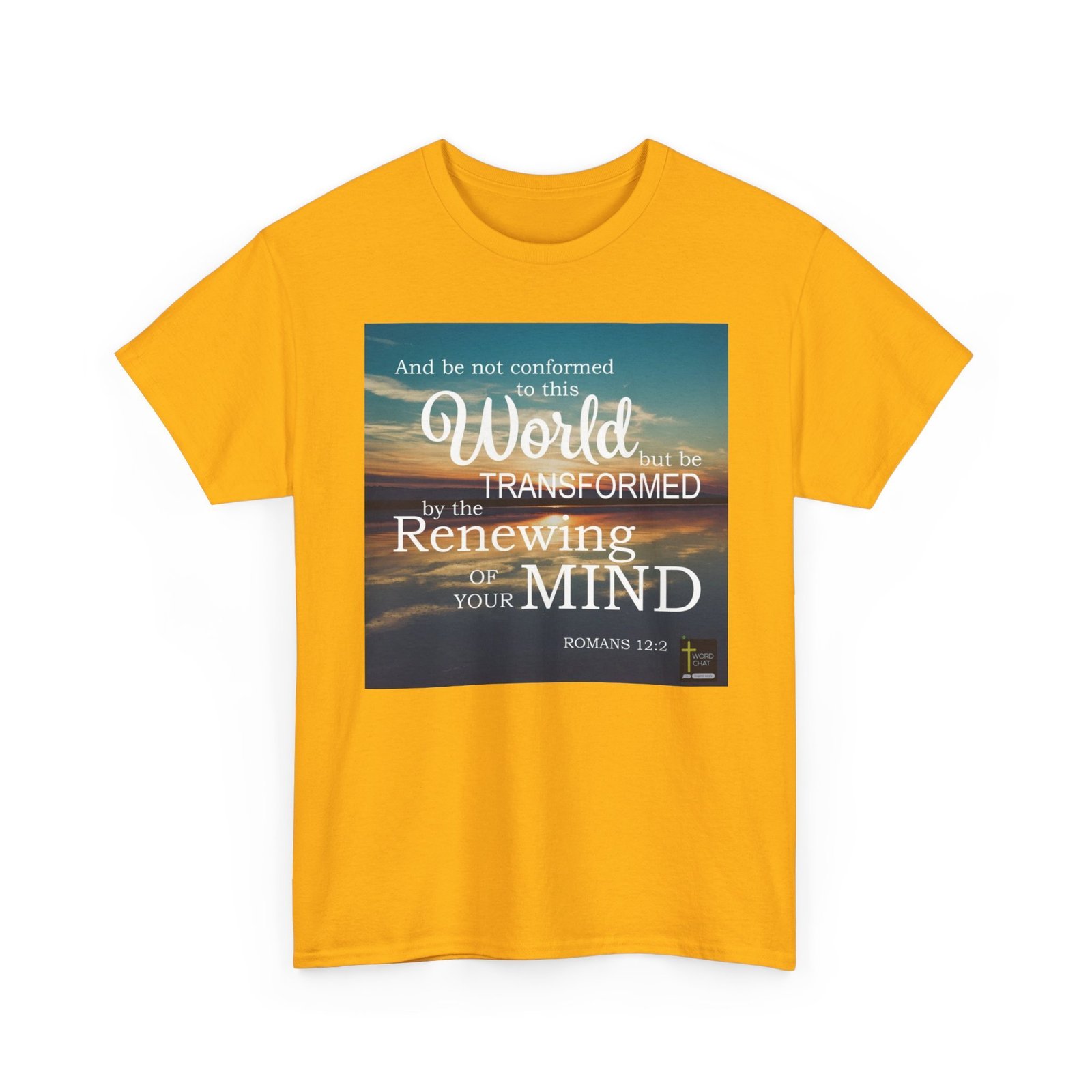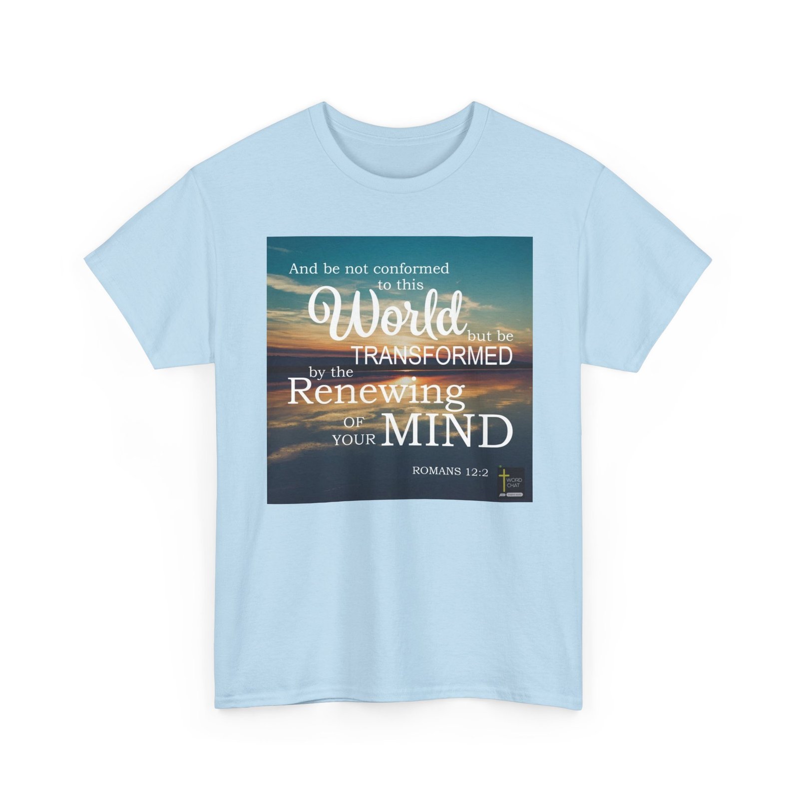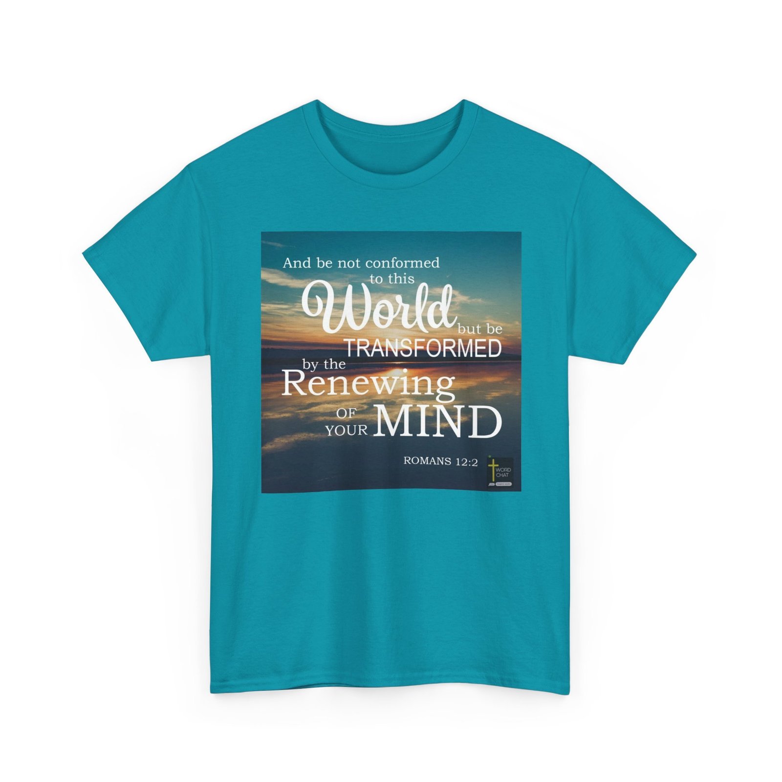 This inspirational image features a Bible verse from Romans 12:2, overlaid on a serene sunset or sunrise landscape with soft, blended colors of blue, orange, and yellow. The background shows a reflective water surface mirroring the sky, creating a symmetrical and peaceful scene. The text is displayed in elegant, varying font sizes and styles, emphasizing key words like “World”, “TRANSFORMED”, and “Renewing of your MIND”. The quote encourages spiritual transformation and resisting worldly conformity, set against a tranquil natural backdrop. The image is branded with a “WordChat” logo in the bottom right corner.