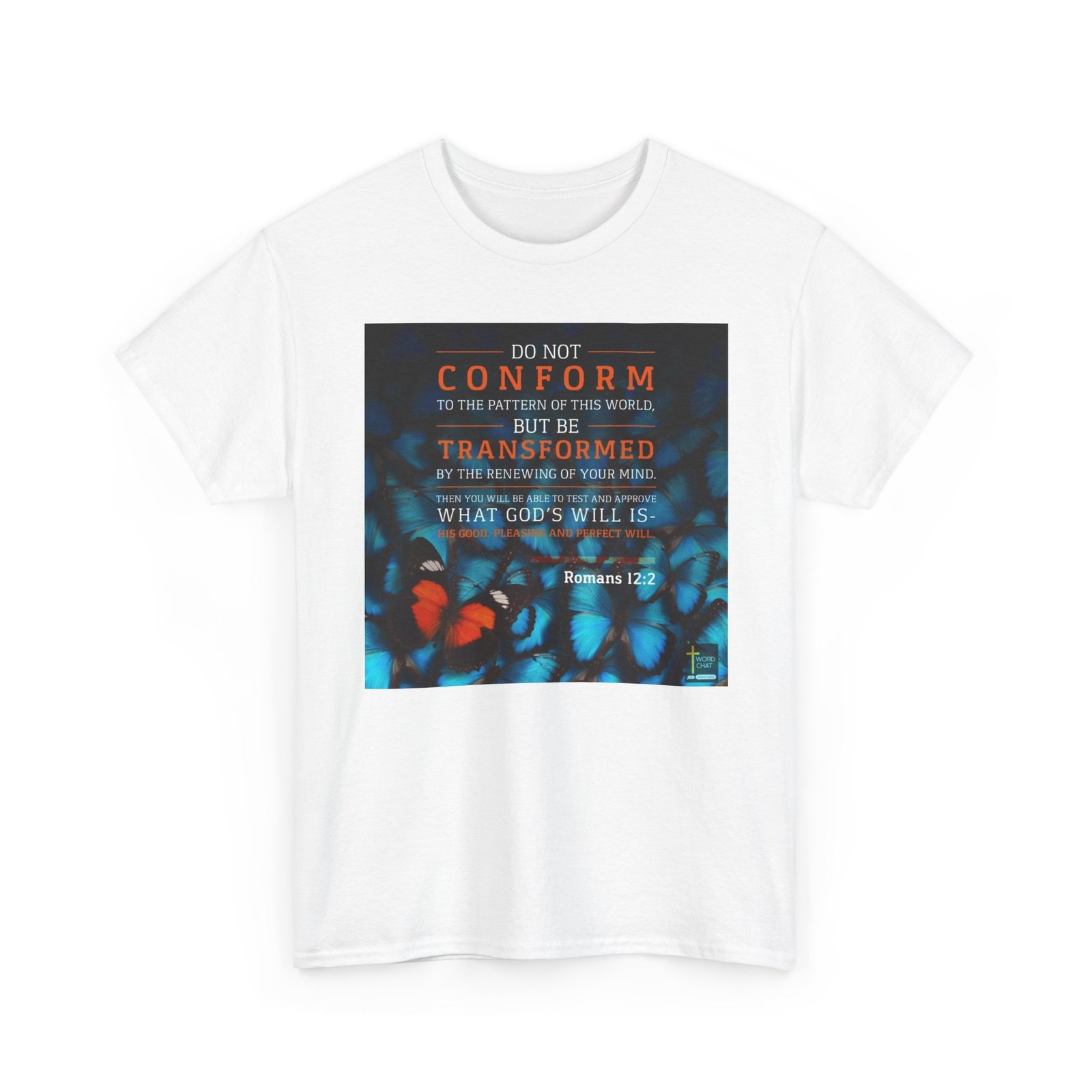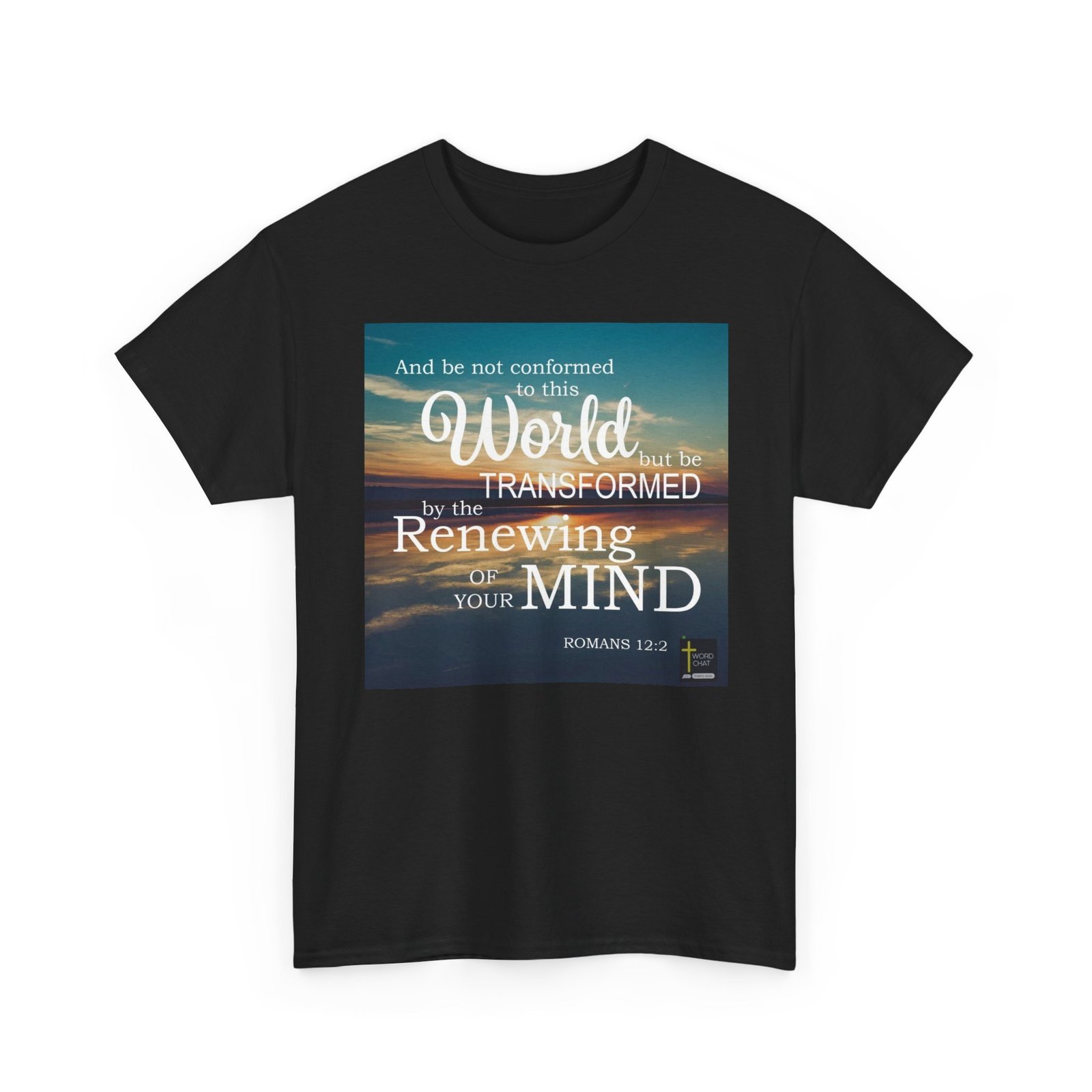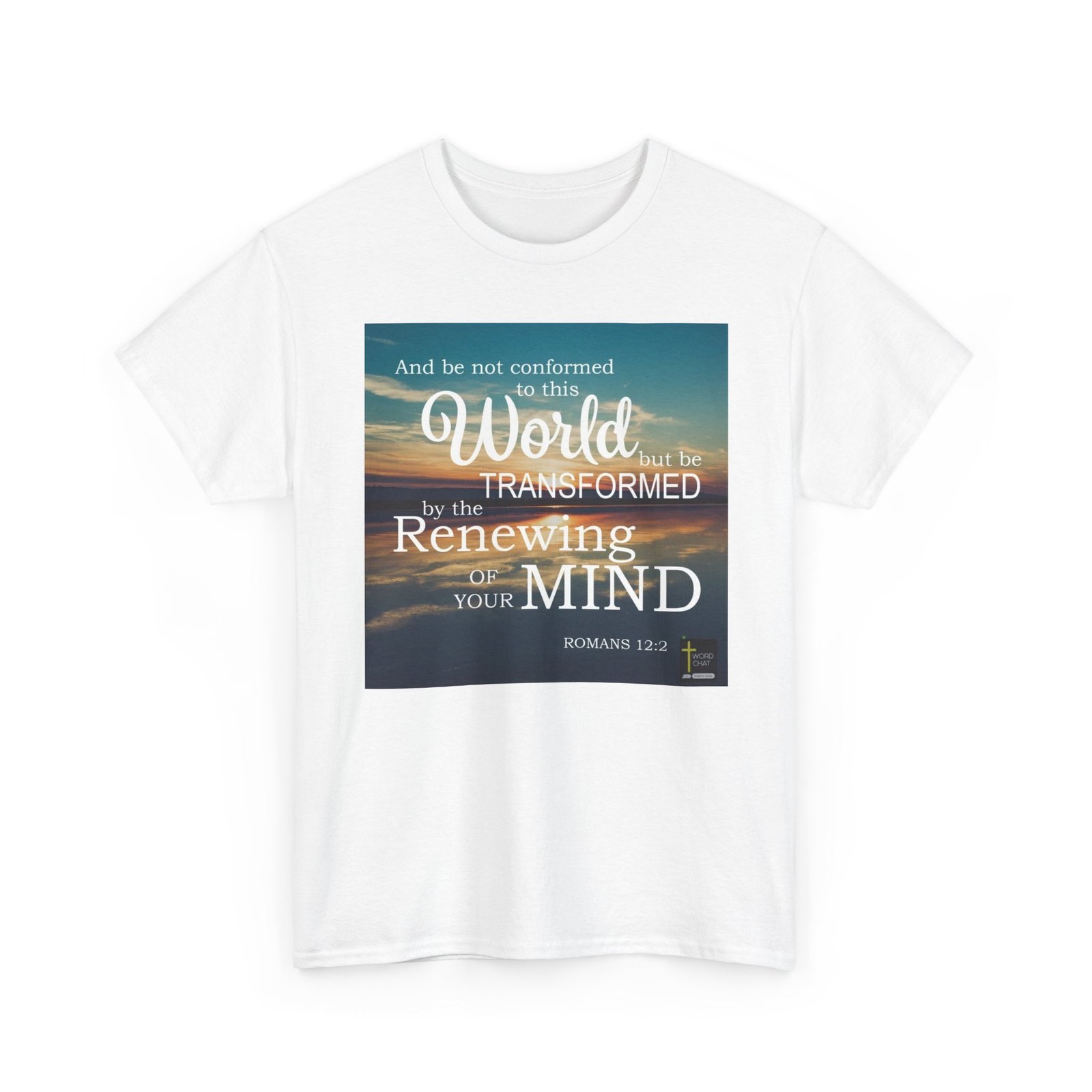 This inspirational image features a Bible verse from Romans 12:2, overlaid on a serene sunset or sunrise landscape with soft, blended colors of blue, orange, and yellow. The background shows a reflective water surface mirroring the sky, creating a symmetrical and peaceful scene. The text is displayed in elegant, varying font sizes and styles, emphasizing key words like “World”, “TRANSFORMED”, and “Renewing of your MIND”. The quote encourages spiritual transformation and resisting worldly conformity, set against a tranquil natural backdrop. The image is branded with a “WordChat” logo in the bottom right corner.