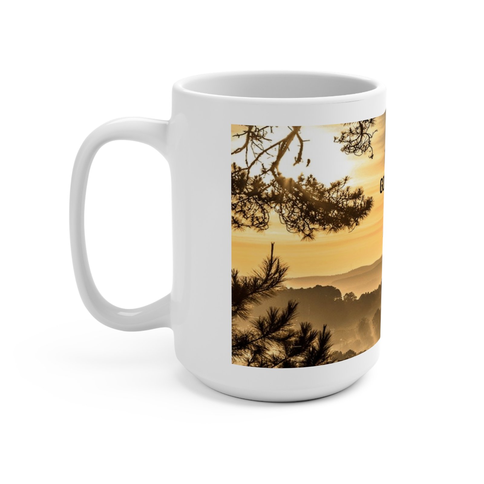 This inspirational image features a serene landscape with misty, layered mountains and pine tree silhouettes against a golden sunrise or sunset sky. The background showcases a warm, ethereal color palette with soft yellow and orange hues blending into shadowy mountain ranges. Overlaid on this tranquil scene is a biblical quote from Romans 8:28, written in bold black text, which reads: “AND WE KNOW THAT IN ALL THINGS GOD WORKS FOR THE GOOD OF THOSE WHO LOVE HIM, WHO HAVE BEEN CALLED ACCORDING TO HIS PURPOSE.” The scripture is positioned prominently on the right side of the image, allowing the natural landscape to provide a peaceful, contemplative backdrop. A small “Word Chat” logo is visible in the bottom right corner, suggesting this is a religious or inspirational media graphic.
