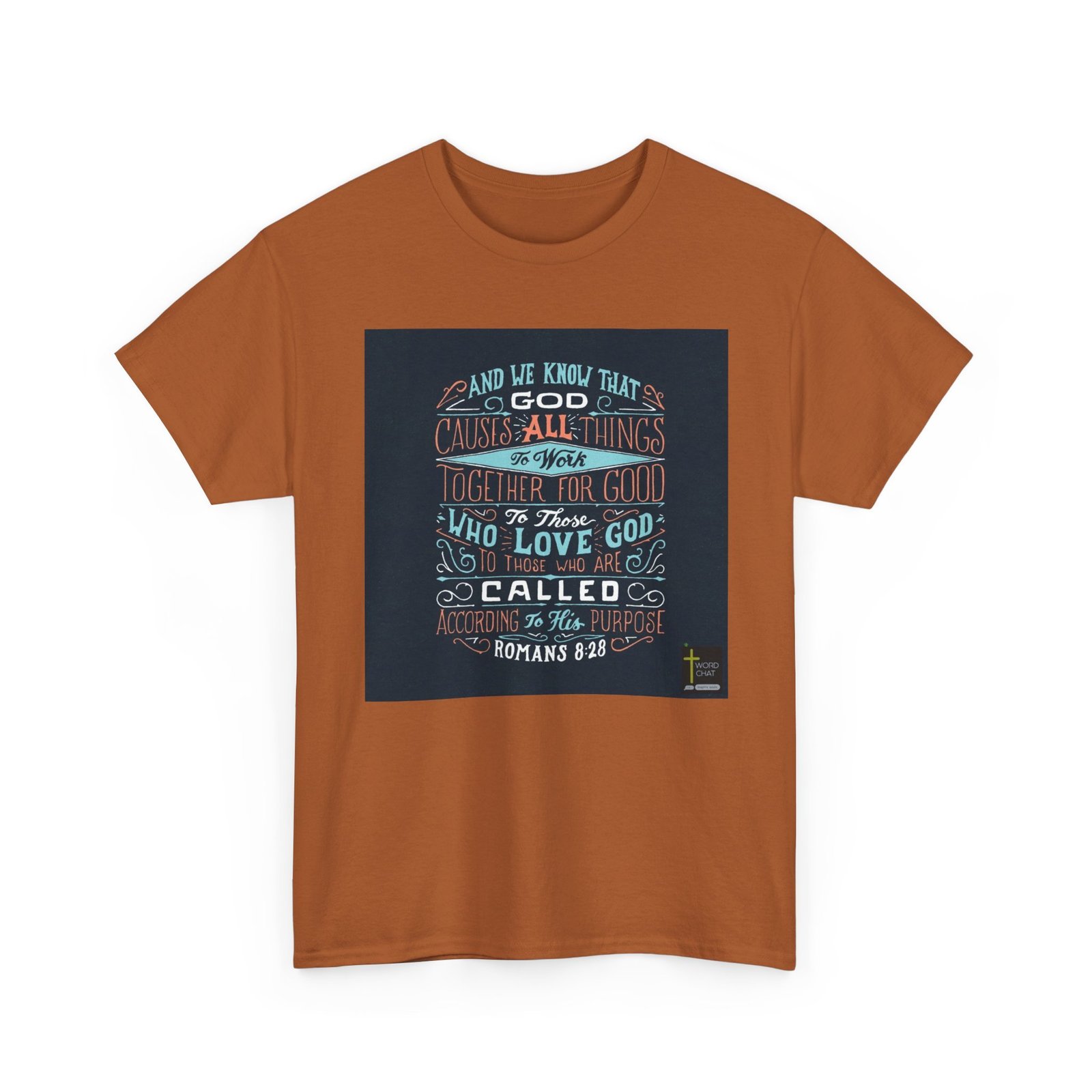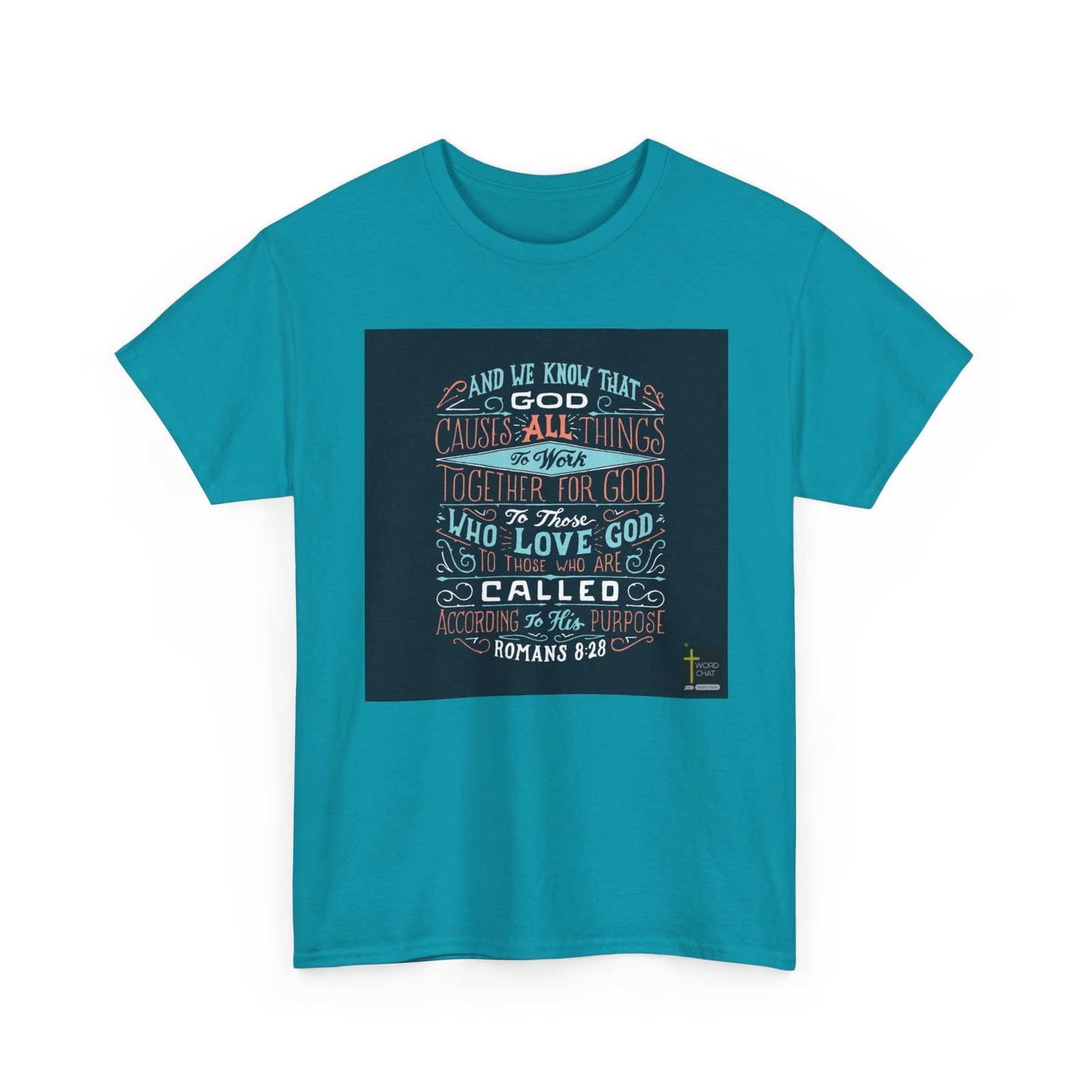 This image features a beautifully hand-lettered typography design of Romans 8:28 from the Bible, rendered in a stylized, decorative text format. The design uses a dark background with coral, teal, and white colors to create visual contrast and emphasis. The text is artfully arranged with ornate swirls and flourishes, creating a dynamic and visually engaging layout that draws the eye through each phrase of the scriptural verse. The typography is meticulously crafted, with varying font sizes and styles to highlight key words and create visual hierarchy. The image includes a “WordChat” logo in the bottom right corner.